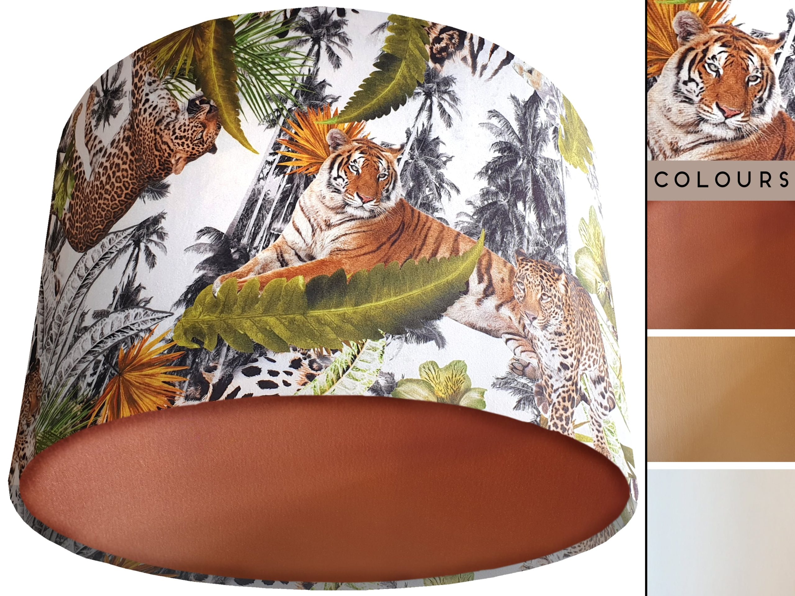 Our big cats light velvet lampshade is a bold tropical home interior design idea, perfect as a statement ceiling light shade or table lamp shade. The outer design is a luxuriously plush velvet with a range of big cats including leopards, cheetahs, & tigers in their distinctive natural colours. There are also large green exotic leaves and black & white trees on an white background, all of which make this design an eye-catching fabric. A range of inners are available from plain white PVC to a range of shimmer metallic coloured fabrics, perfect for adding an extra pop of colour to the shade.