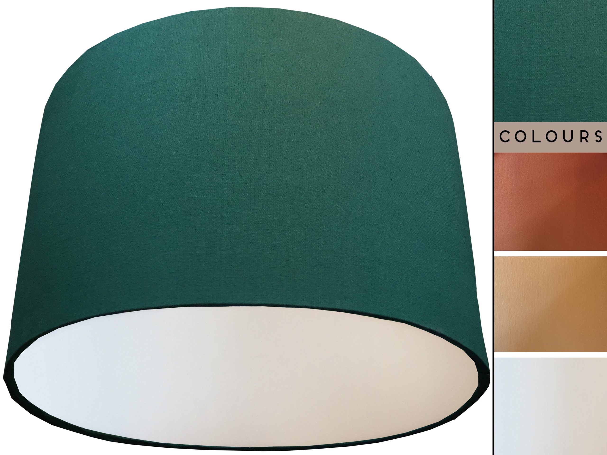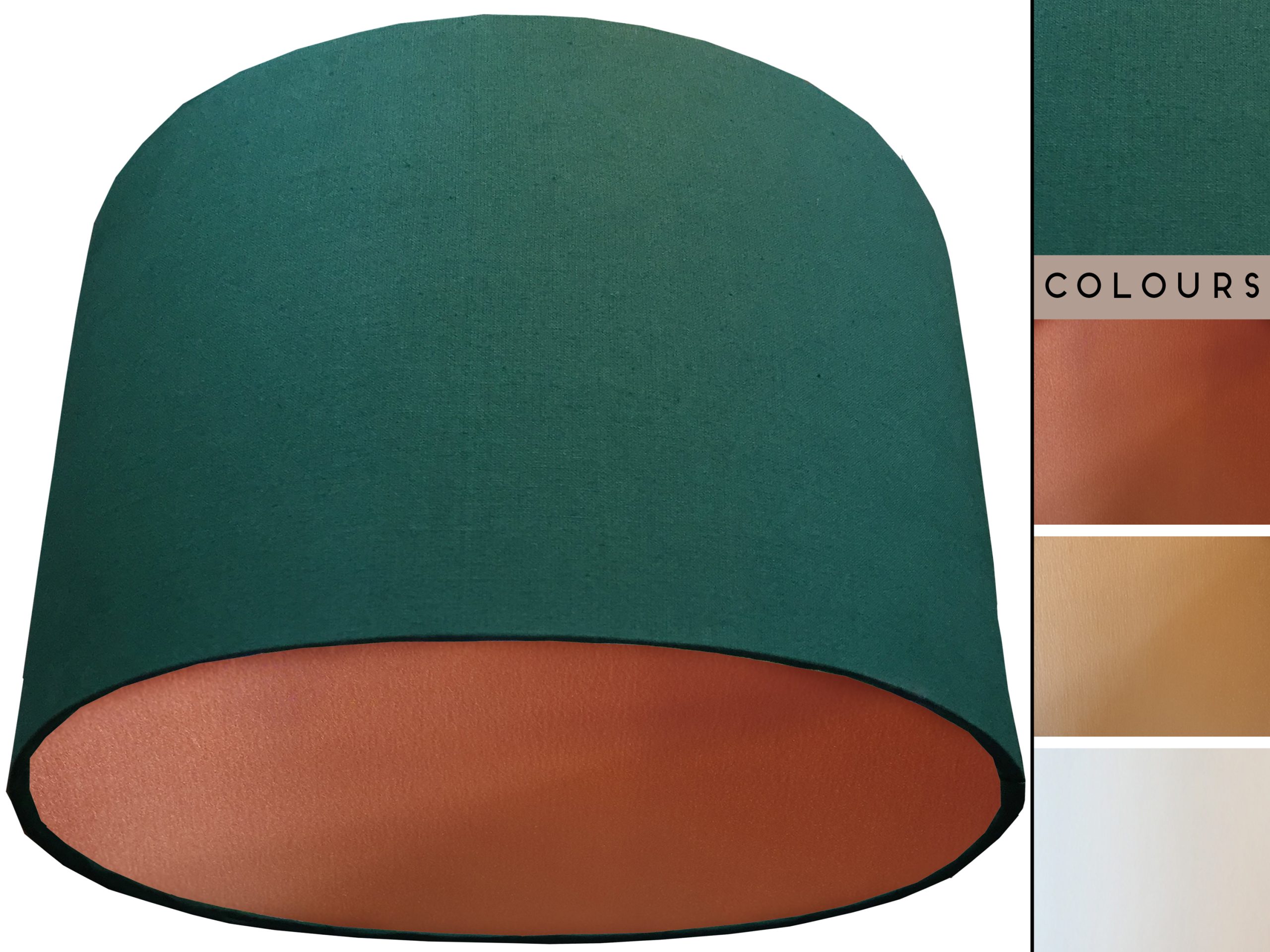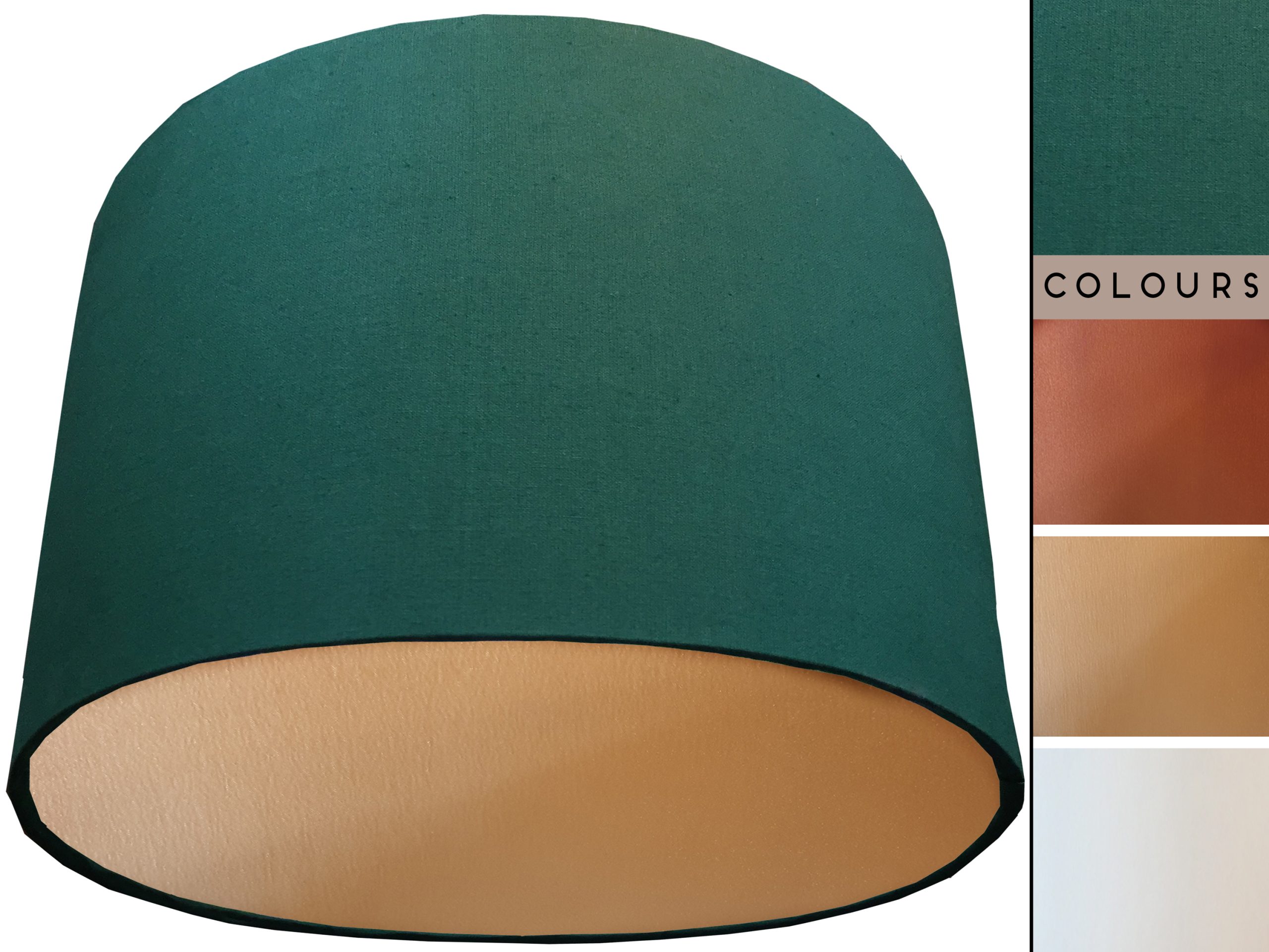 Green lampshade with shimmer fabric lining, perfect for creating a subtle yet stylish look into any room. The outer fabric is a plain bottle green cotton, and can be paired with either a plain white PVC lining or a gorgeous shimmer fabric which adds an extra splash of colour to the shade. Perfect as a ceiling light shade or table lamp shade in your home.
