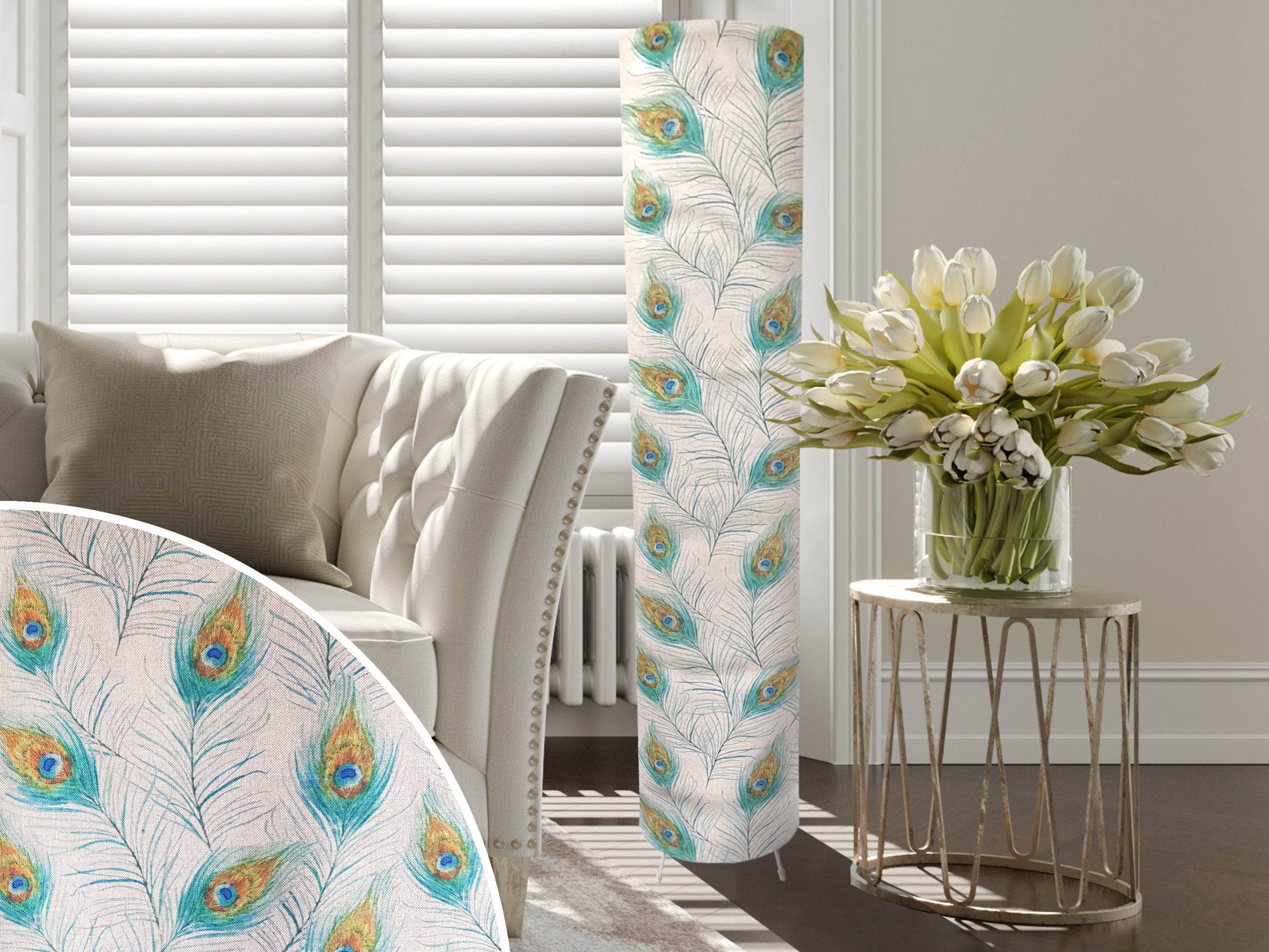 A beautiful patterned fabric makes this peacock feather floor lamp a stylish addition to your country home interior. Our floor lamps feature a patterned exterior of colourful peacock feathers contrasted on a pale background, gorgeous in any room. The fabric is backed onto a lampshade specific white PVC designed to provide reflect light internally to ensure the floor lamp will be well illuminated.