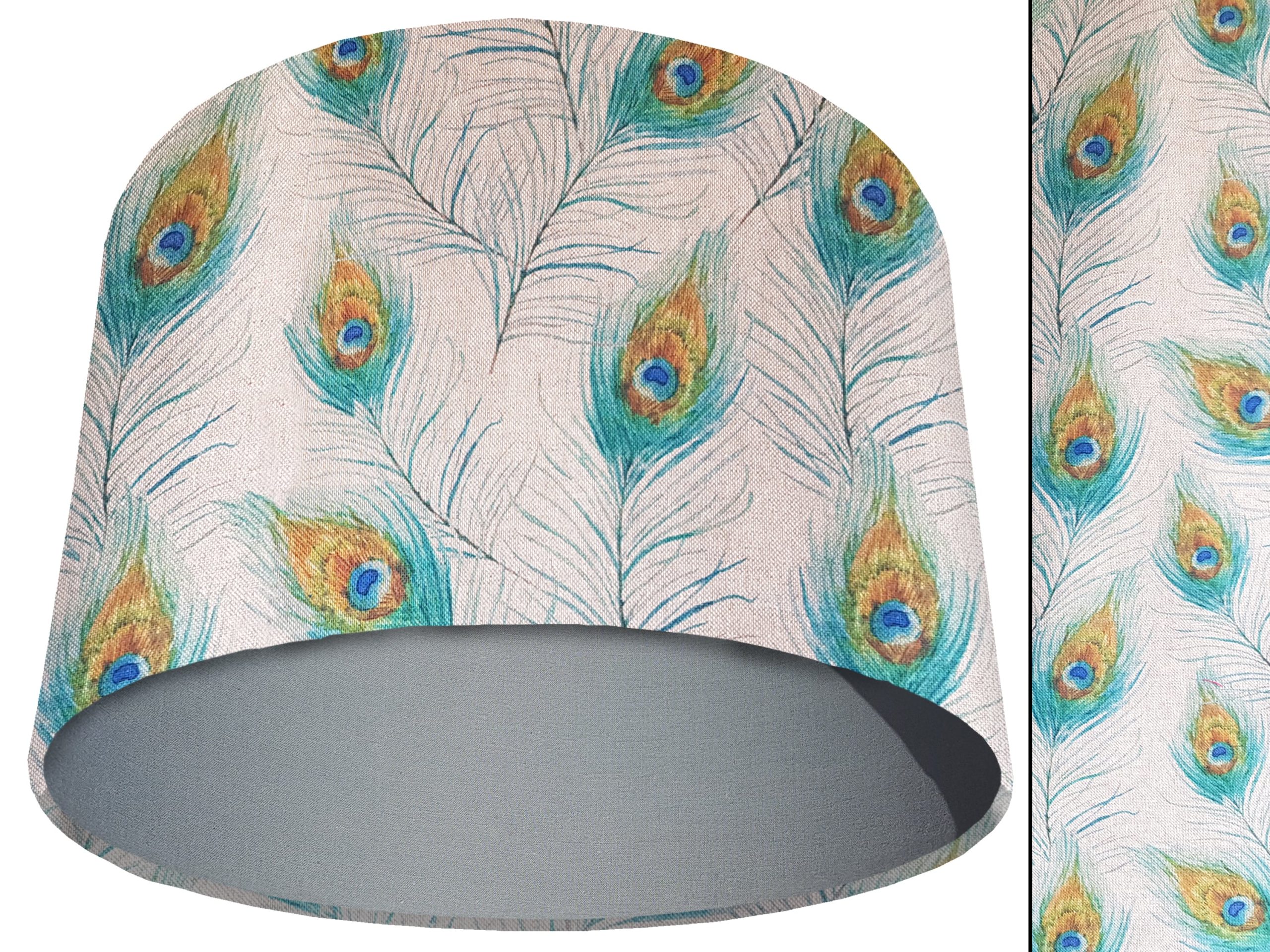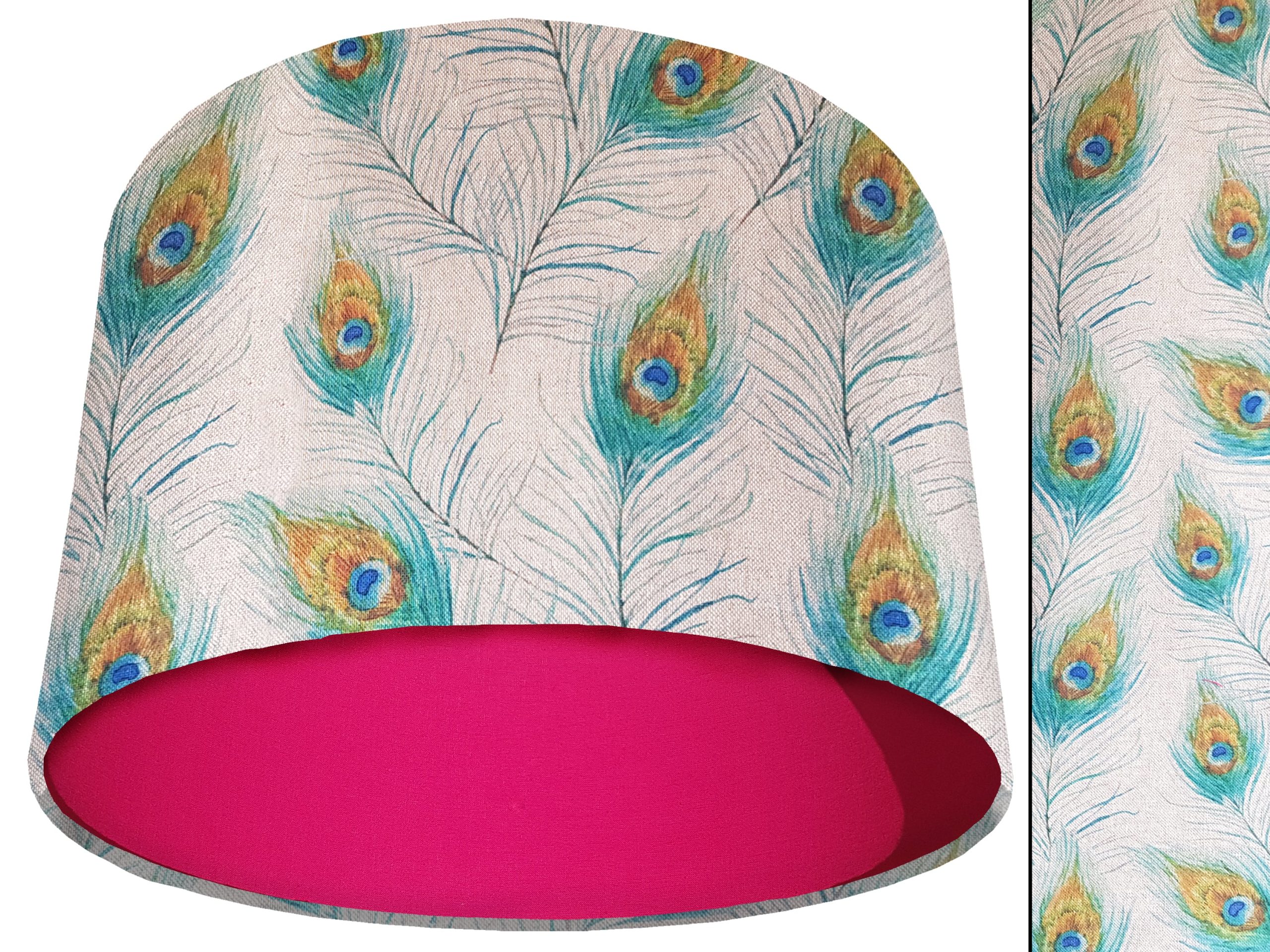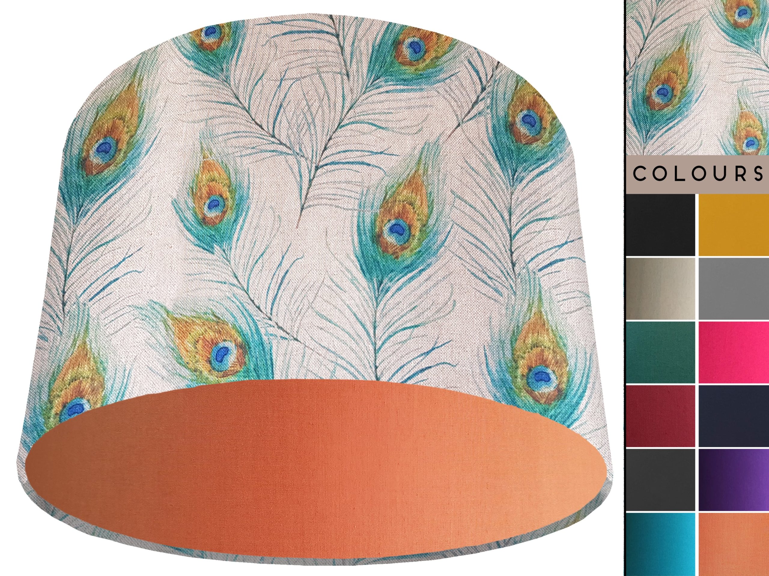 A stunning classic country style fabric makes this peacock feather light shade a stylish addition to your country home interiors. Our light shades feature a patterned exterior of peacock feathers in blue, green, and orange tones on a pale background. This can then be paired with a solid cotton colour lining of your choosing, which gives this peacock feather light shade a contemporary twist ensuring it will be a stylish focal point in any room.