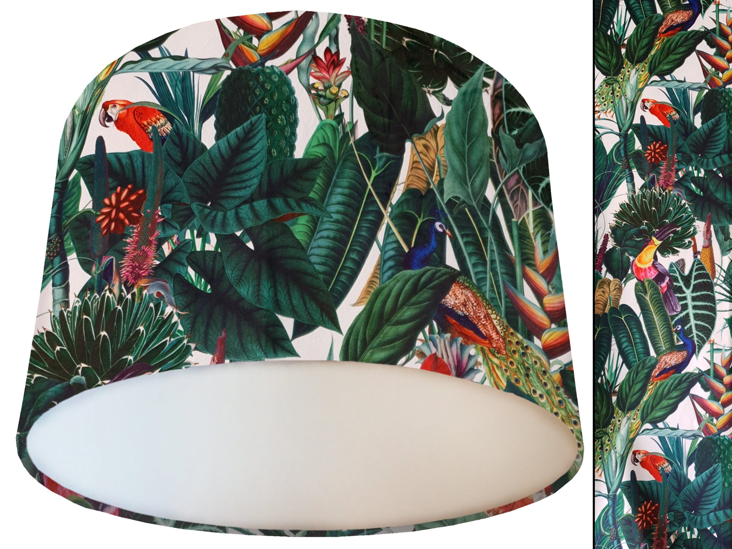 Our white birds velvet lampshade combines a luxurious patterned velvet exterior with a satin shimmer copper or gold lining. Great for ceiling lights & table lamps, and perfect for adding copper or gold accents into your home décor. The exterior is a tropical velvet of deep green jungle leaf print with colourful exotic birds and flowers throughout, all on a contrasting white background which helps the other colours pop off the fabric.