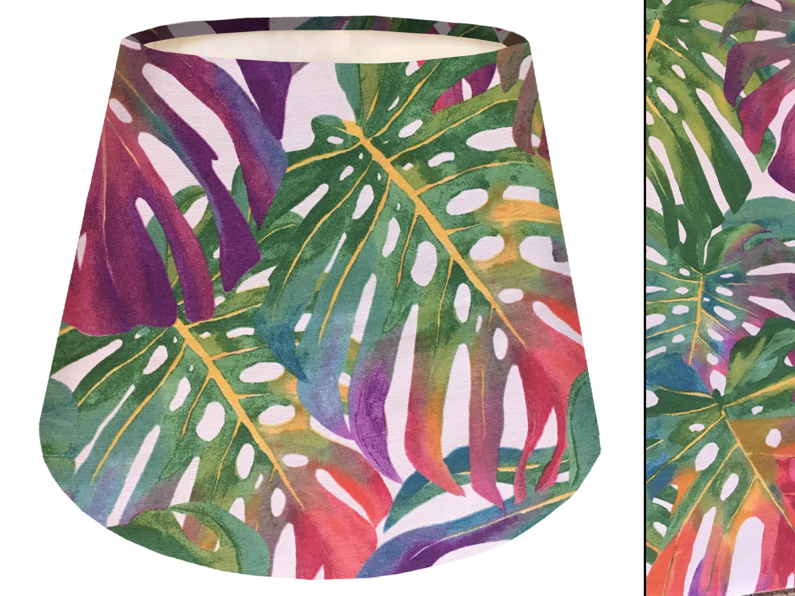 Our Tropical Bohemian Empire lampshade is is perfect for anyone looking transform their home into a tropical paradise. The outer fabric has vibrant palm leaves in bright reds, greens, & purples, set against a stark white background which further highlights the colours. Available as either a stylish ceiling light or a striking table lamp, this lampshade is bound to catch the attention of everyone who sees it. If you want to wow your guests, look no further than this gorgeous interior lighting piece.