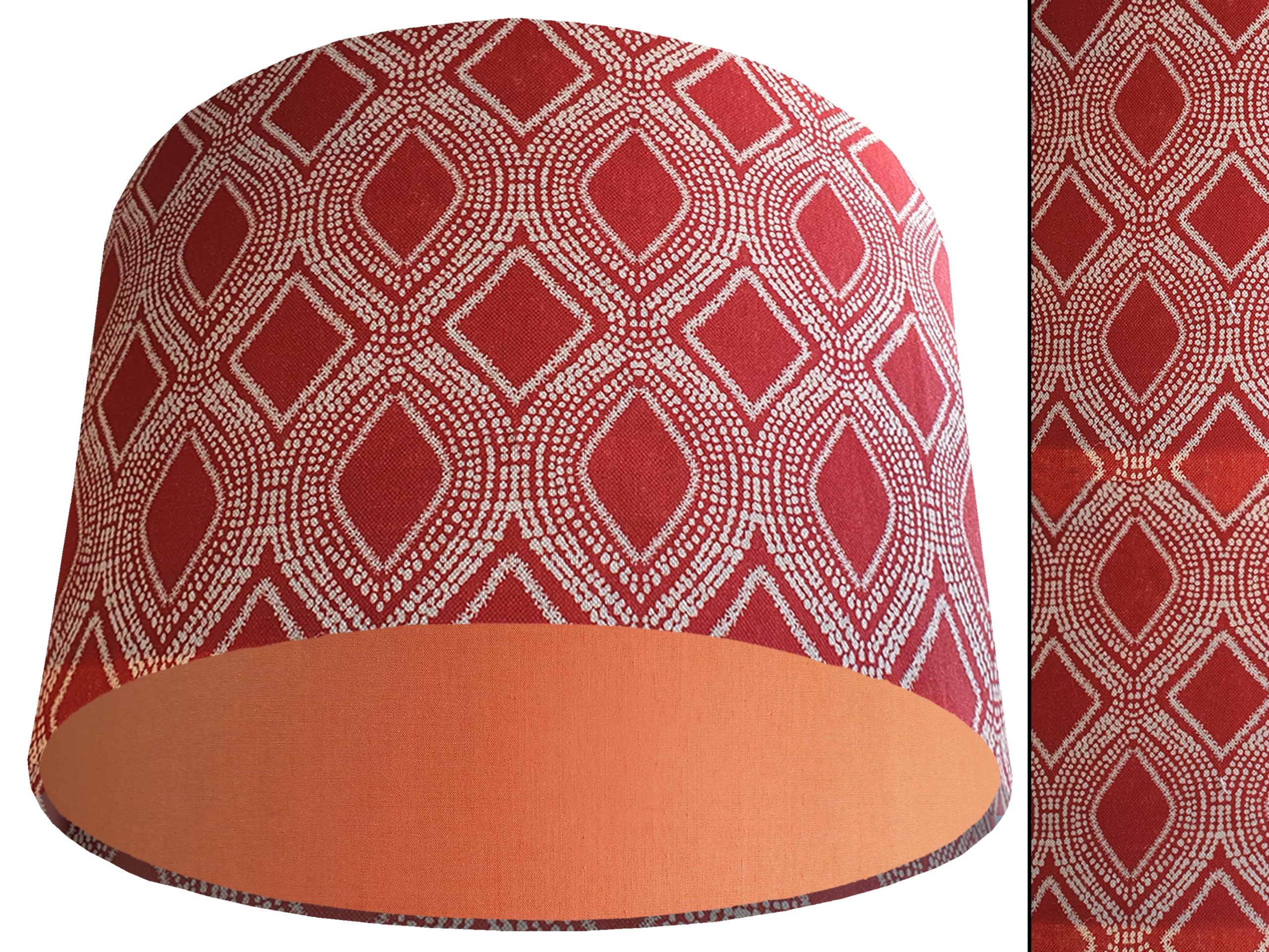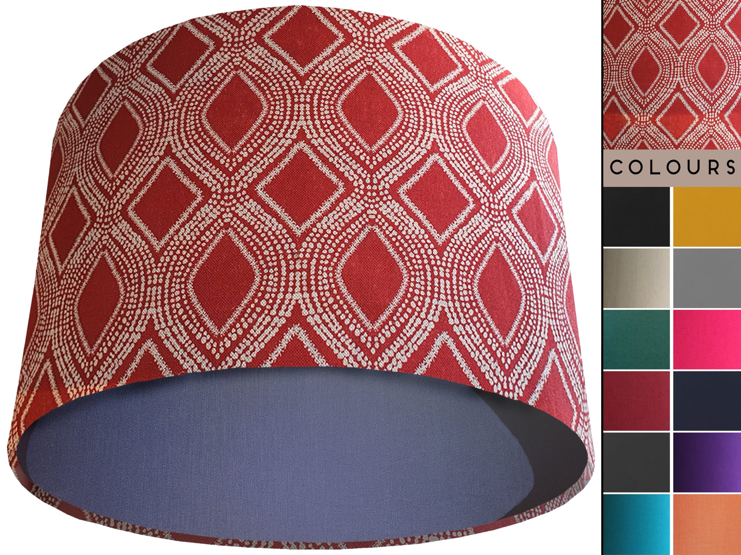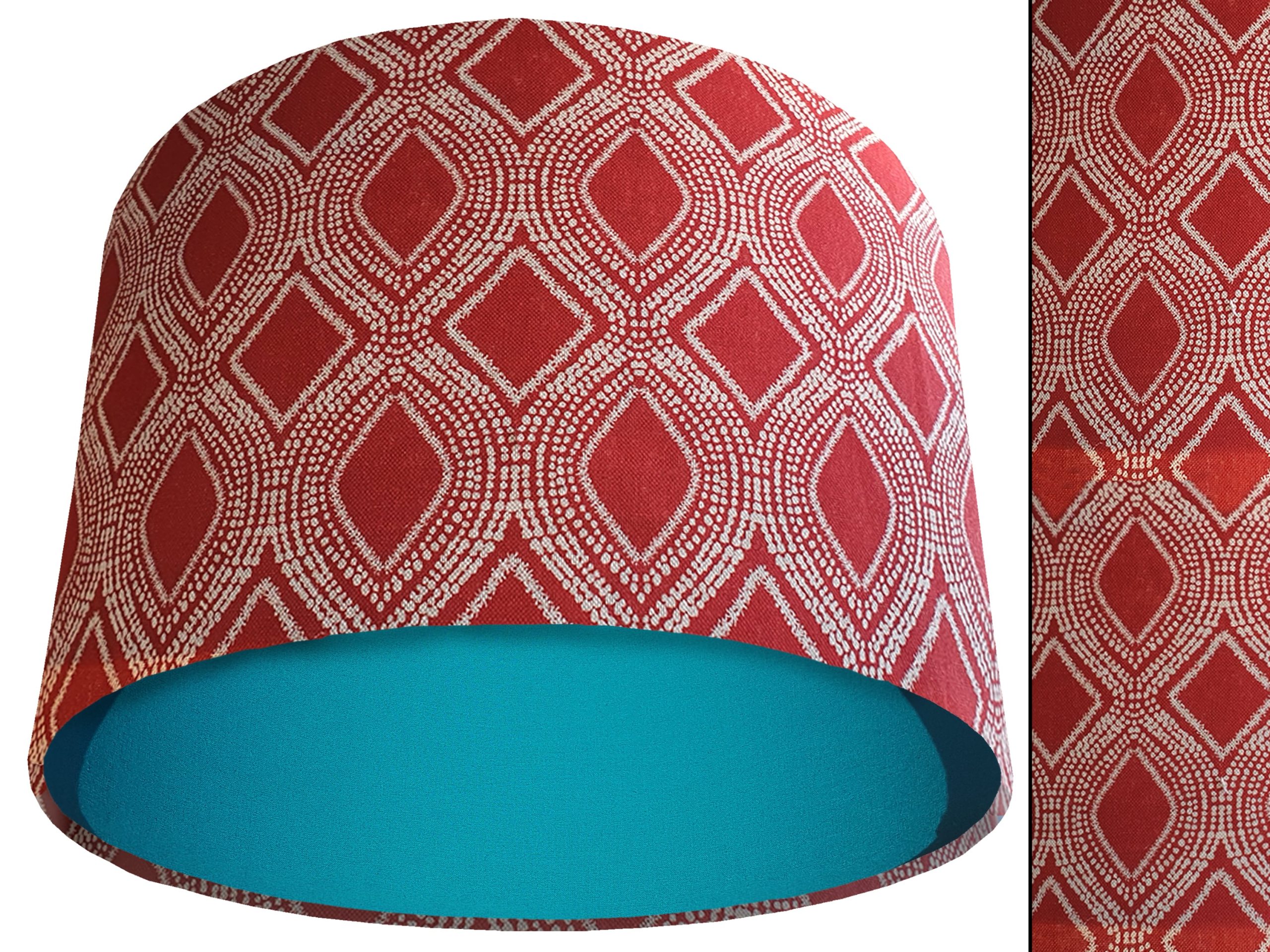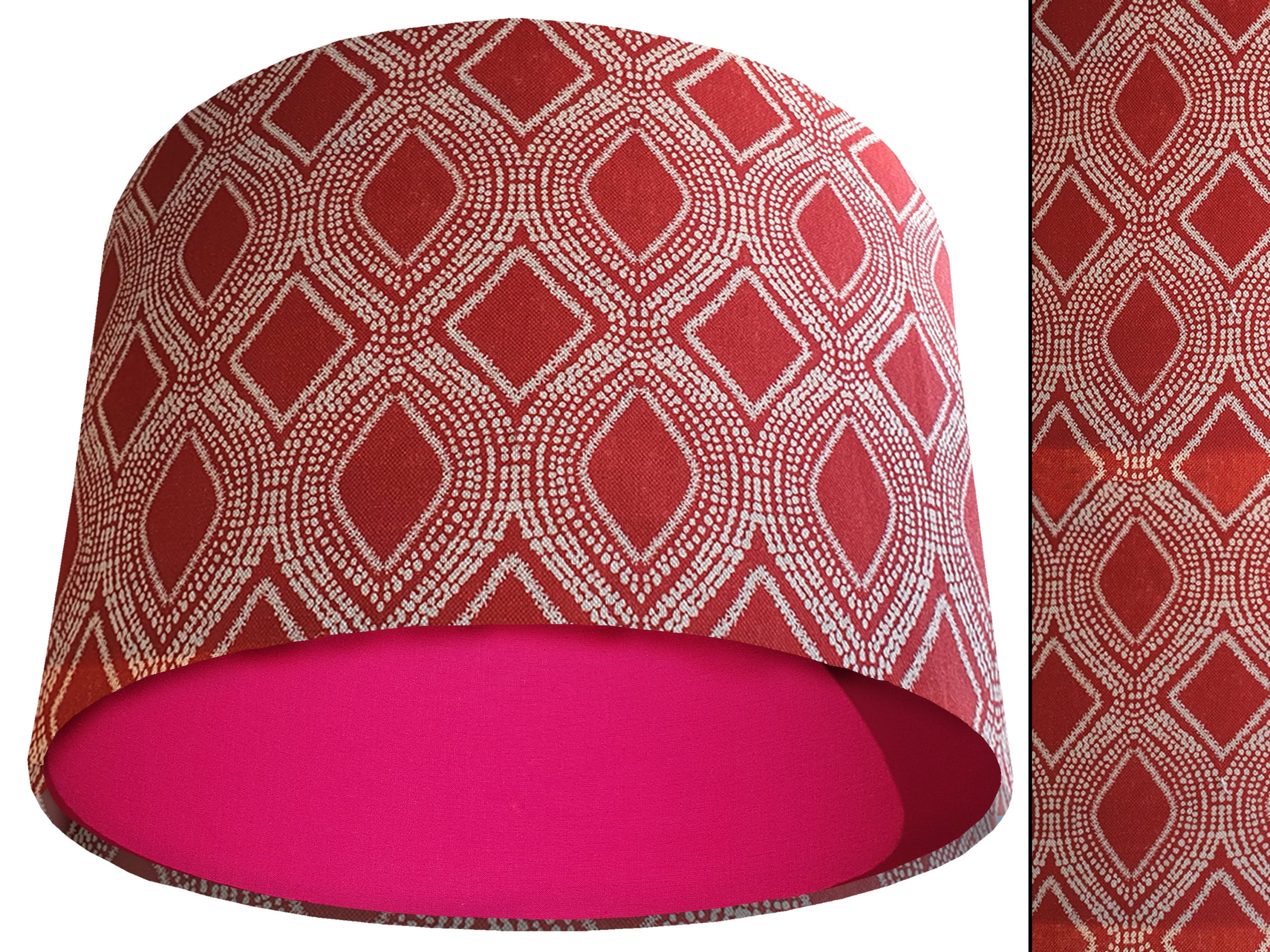 A stylish bohemian print fabric makes this Boho red light shade a gorgeous addition to your modern home interiors. Our light shades feature a beautiful patterned exterior of spiralling white dots which create alternating rows of diamonds & ovals in a rich red background. This can then be paired with solid cotton colour lining of your choosing, giving this Boho red light shade an extra burst of colour and style.