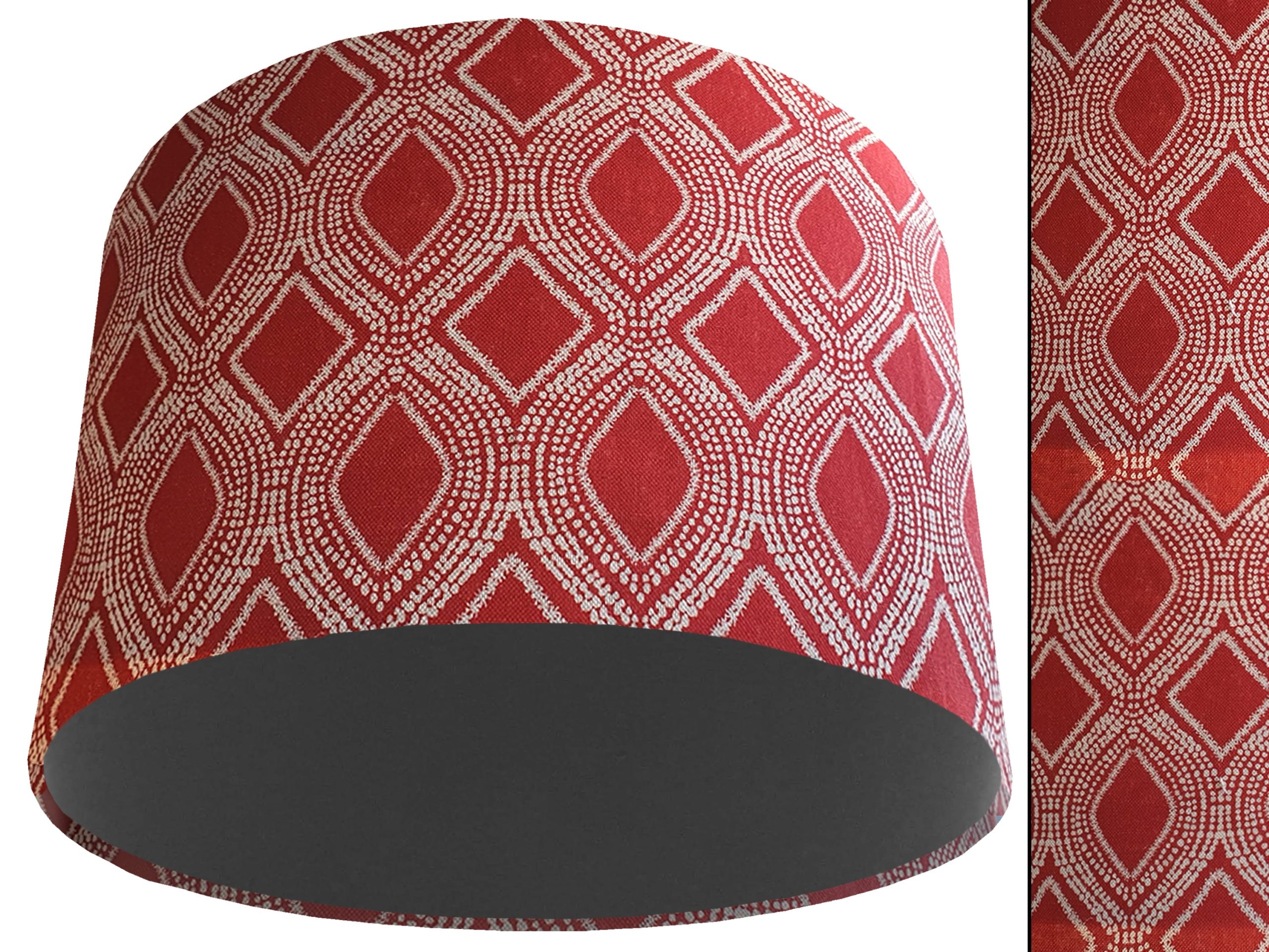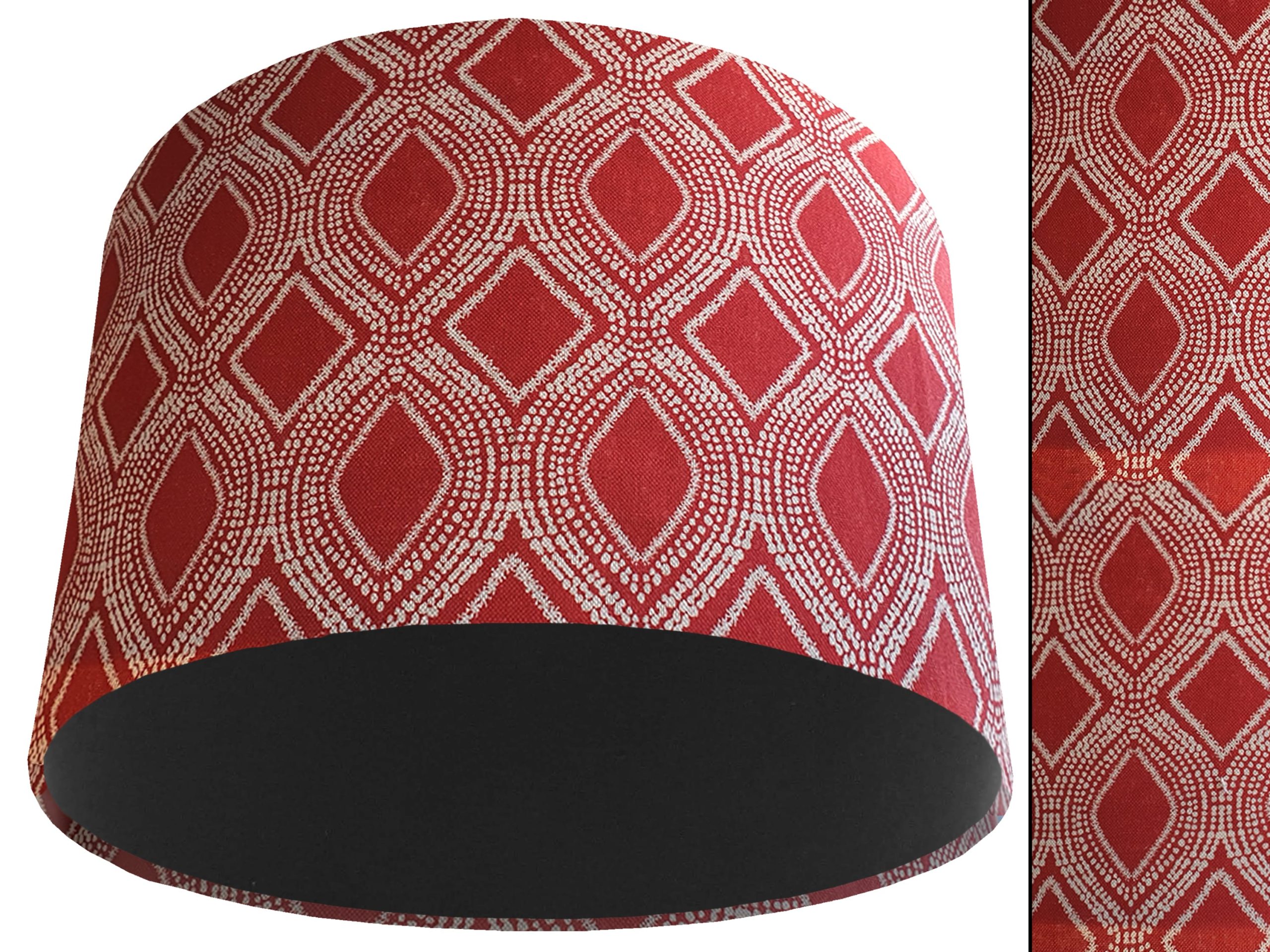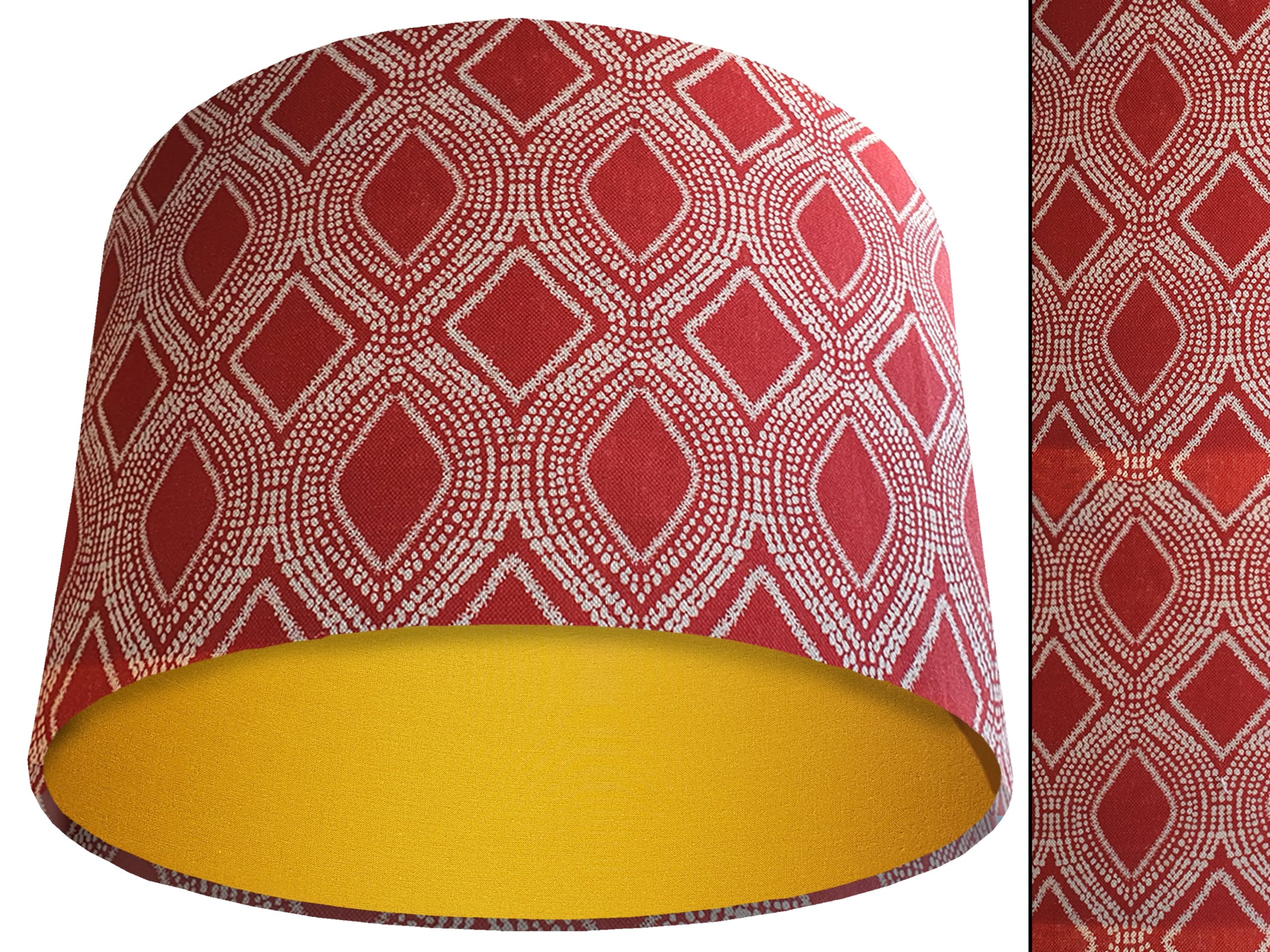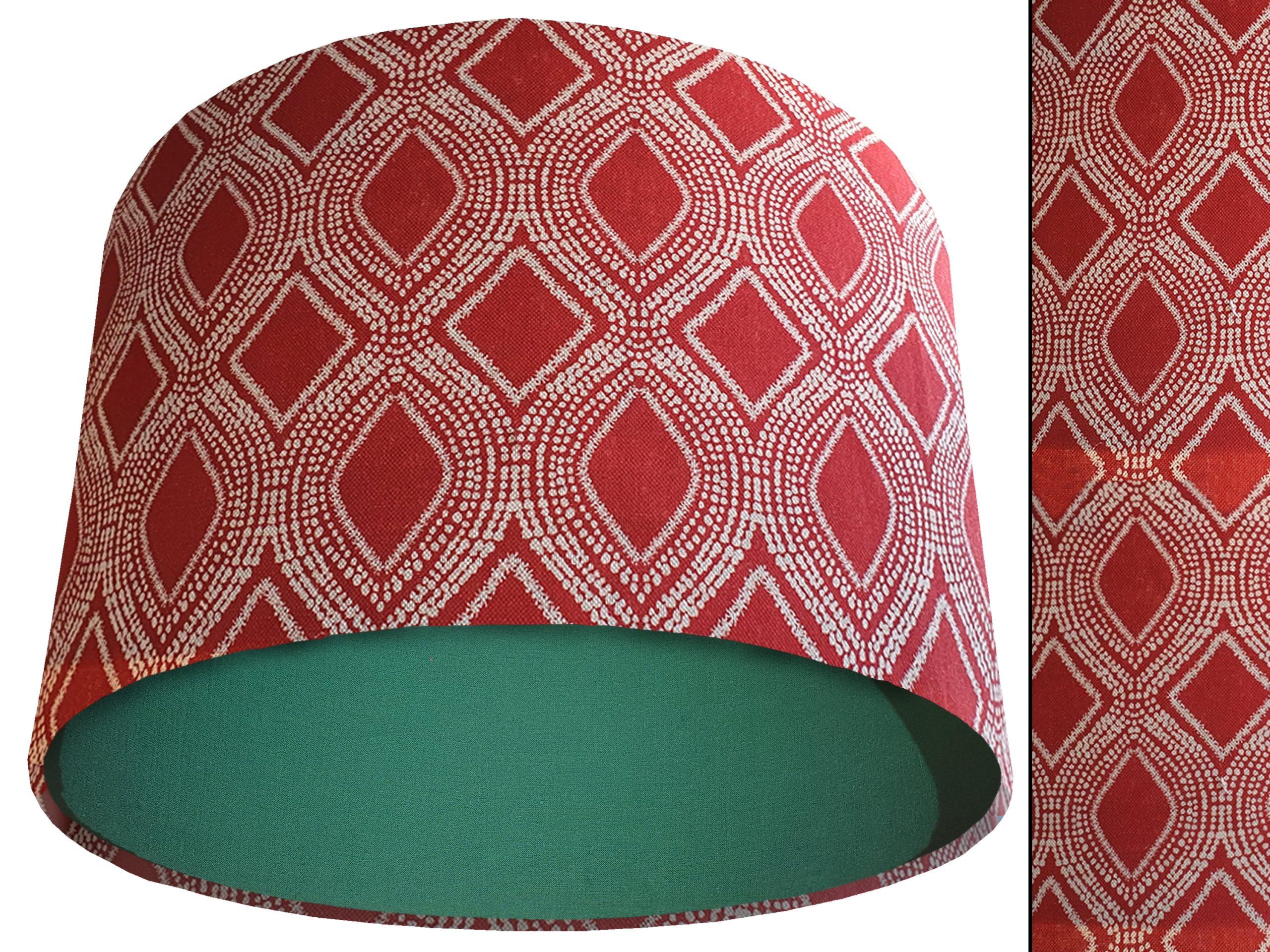 A stylish bohemian print fabric makes this Boho red light shade a gorgeous addition to your modern home interiors. Our light shades feature a beautiful patterned exterior of spiralling white dots which create alternating rows of diamonds & ovals in a rich red background. This can then be paired with solid cotton colour lining of your choosing, giving this Boho red light shade an extra burst of colour and style.