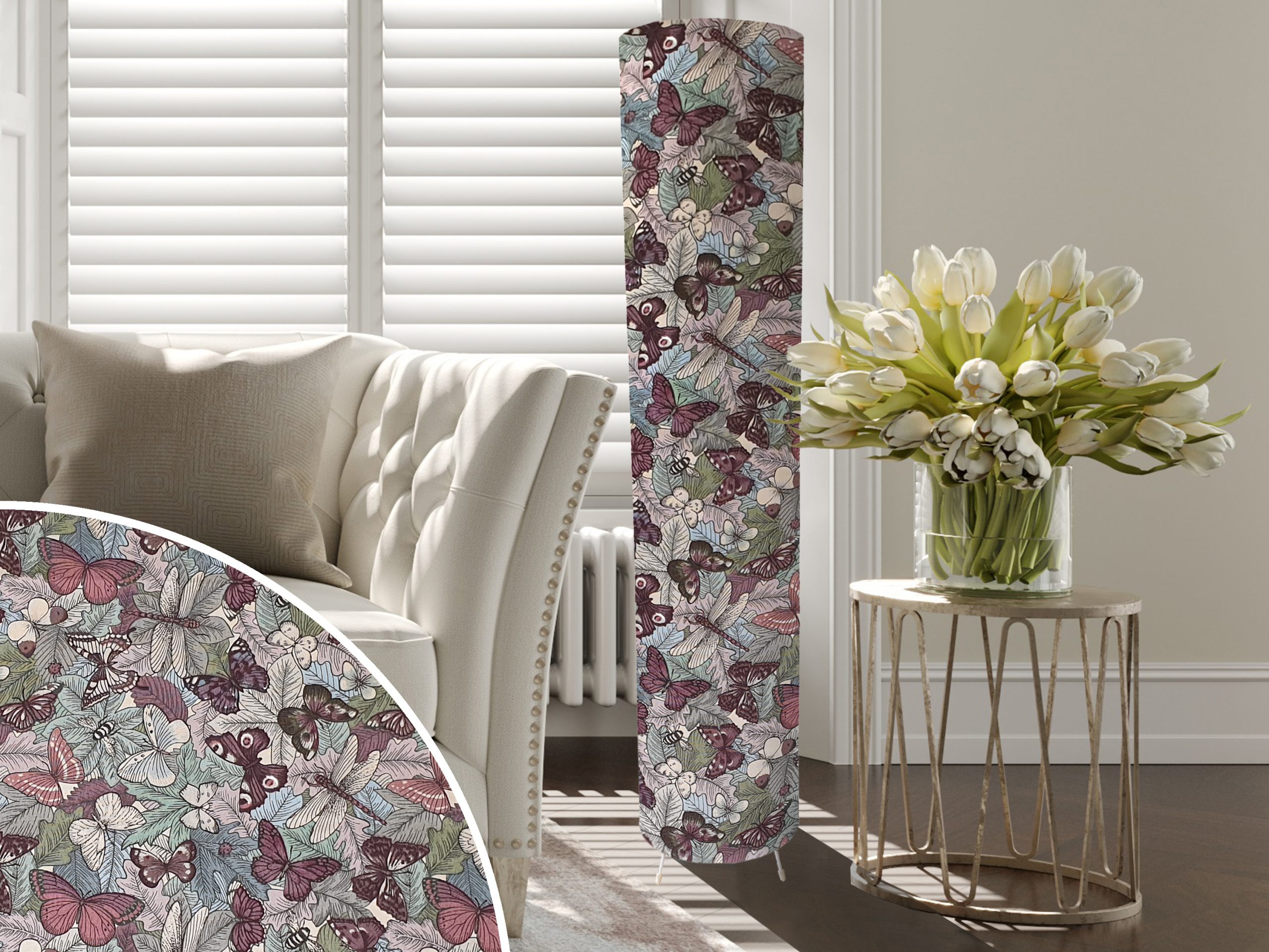 A stylish animal print design makes this butterfly floor lamp a stunning addition to your home interiors. This floor lamp features a beautiful butterfly print in pastel tones, ideal for a classic country home feel in any room. The fabric is backed onto a lampshade specific white PVC designed to provide reflect light internally to ensure the floor lamp will be well illuminated.