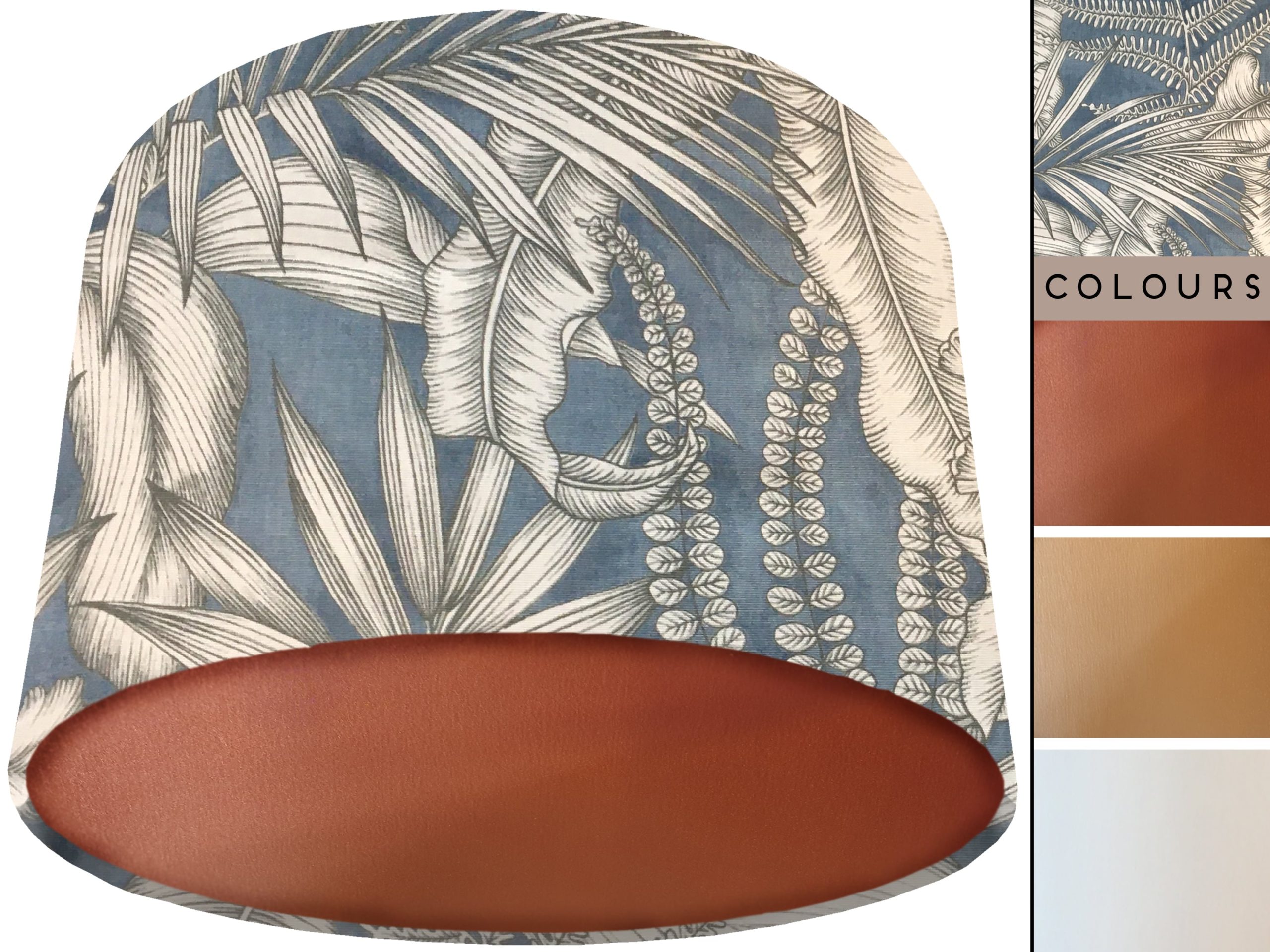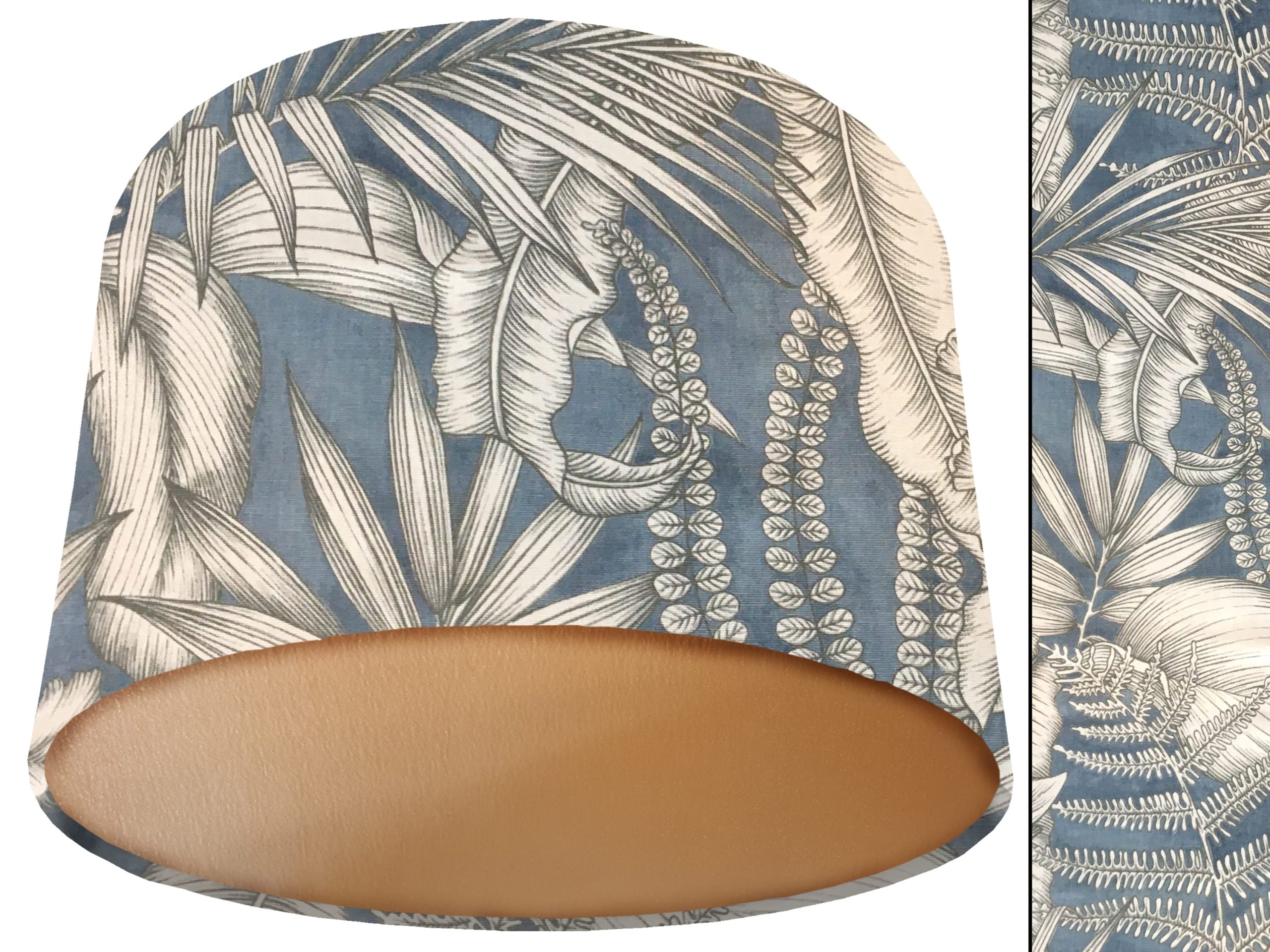 Our gorgeous blue tropical lamp shade is perfect for introducing a modern tropical feel into your home. Made from a stylish fabric which features exotic plants in grey & white, which contrasts with the soft blue background. Great if you’re looking to add a hint of colour & style into your home, this stunning lampshade is suitable for both table lamps & ceiling lights.