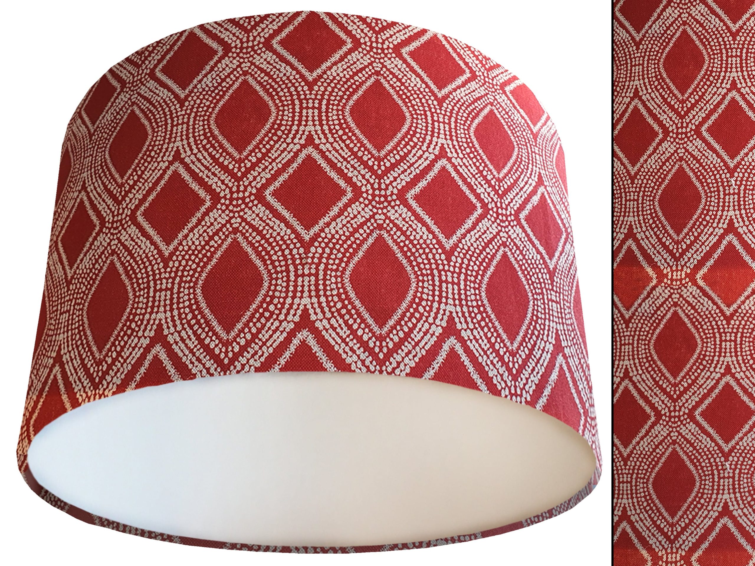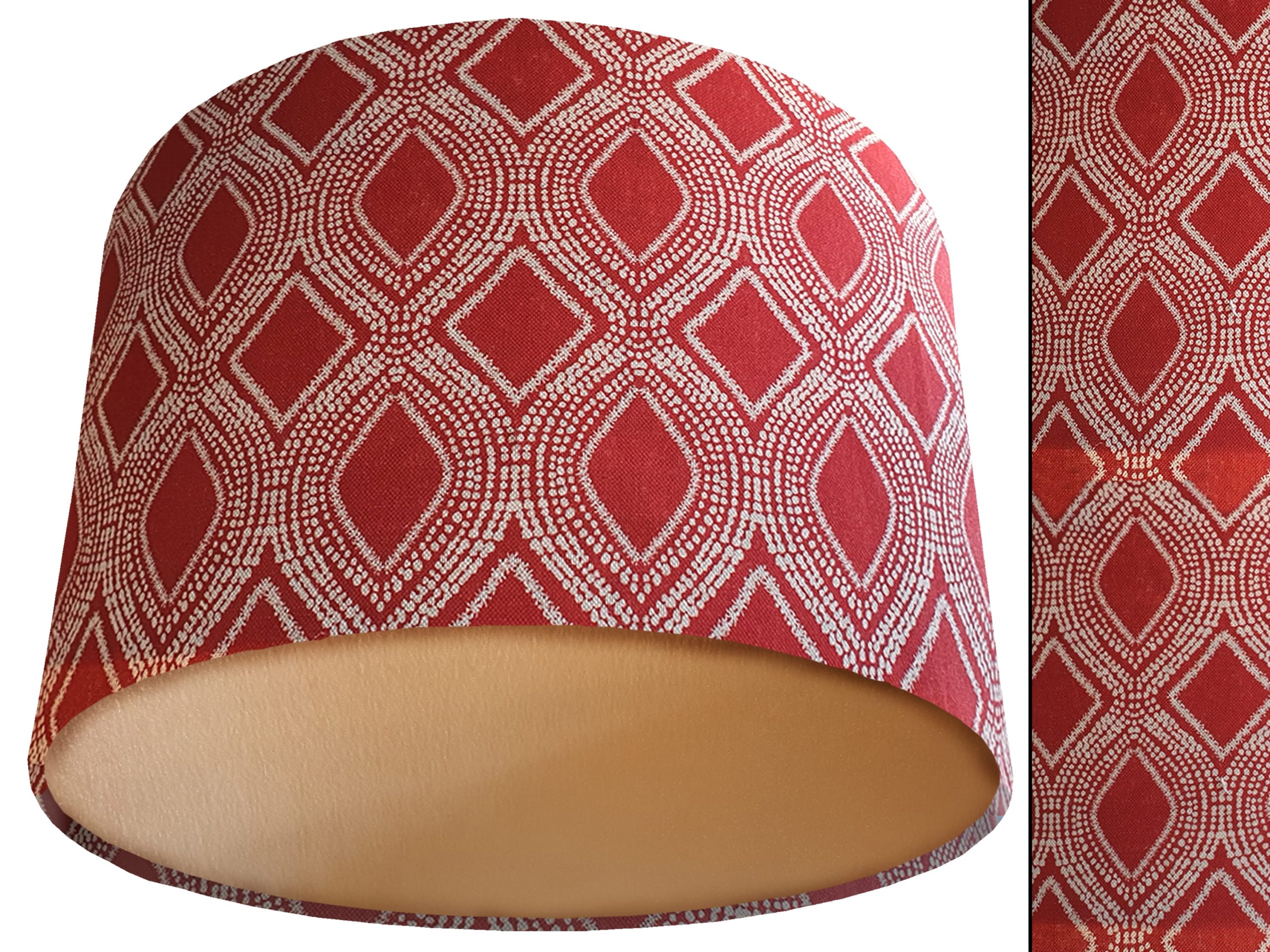 This is our stylish Bohemian red lamp shade, which features a modern BOHO home interior design fabric. The design is simple featuring spiralling white dot columns which cleverly forms alternating rows of ovals & diamonds in the deep red background. Perfect as a stylish table lamp or as a bedside lamp shade.
