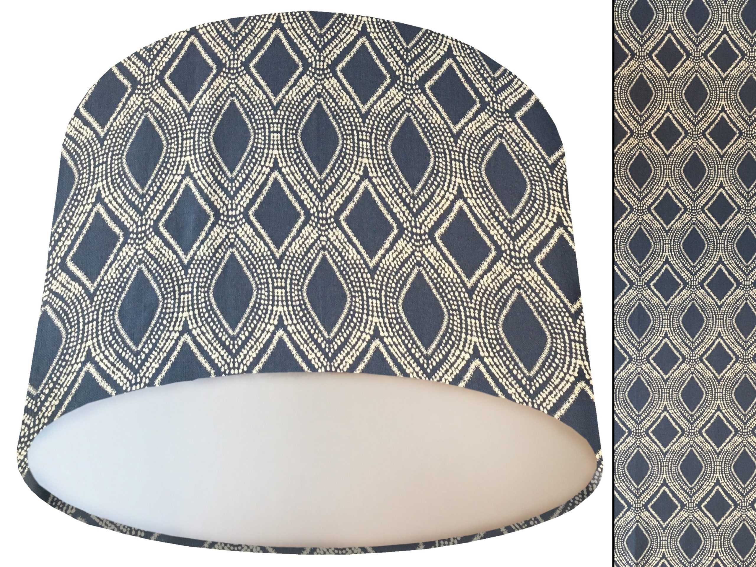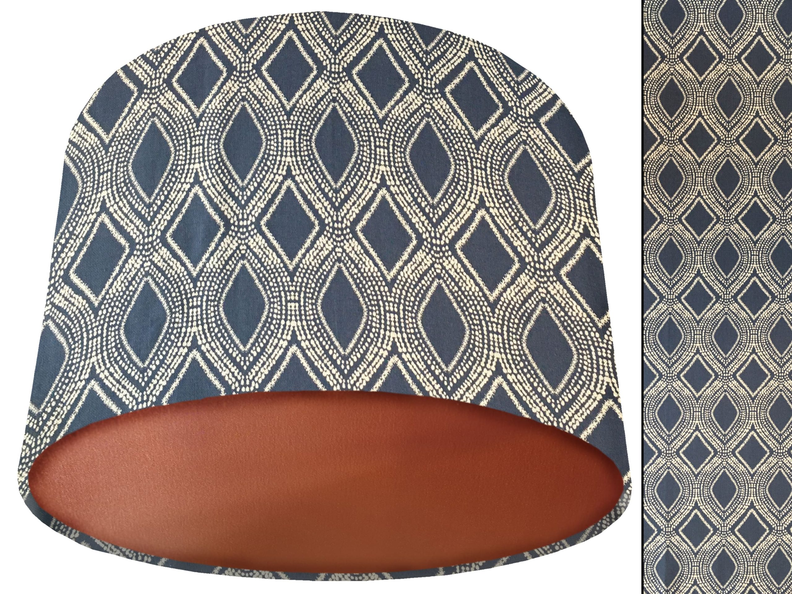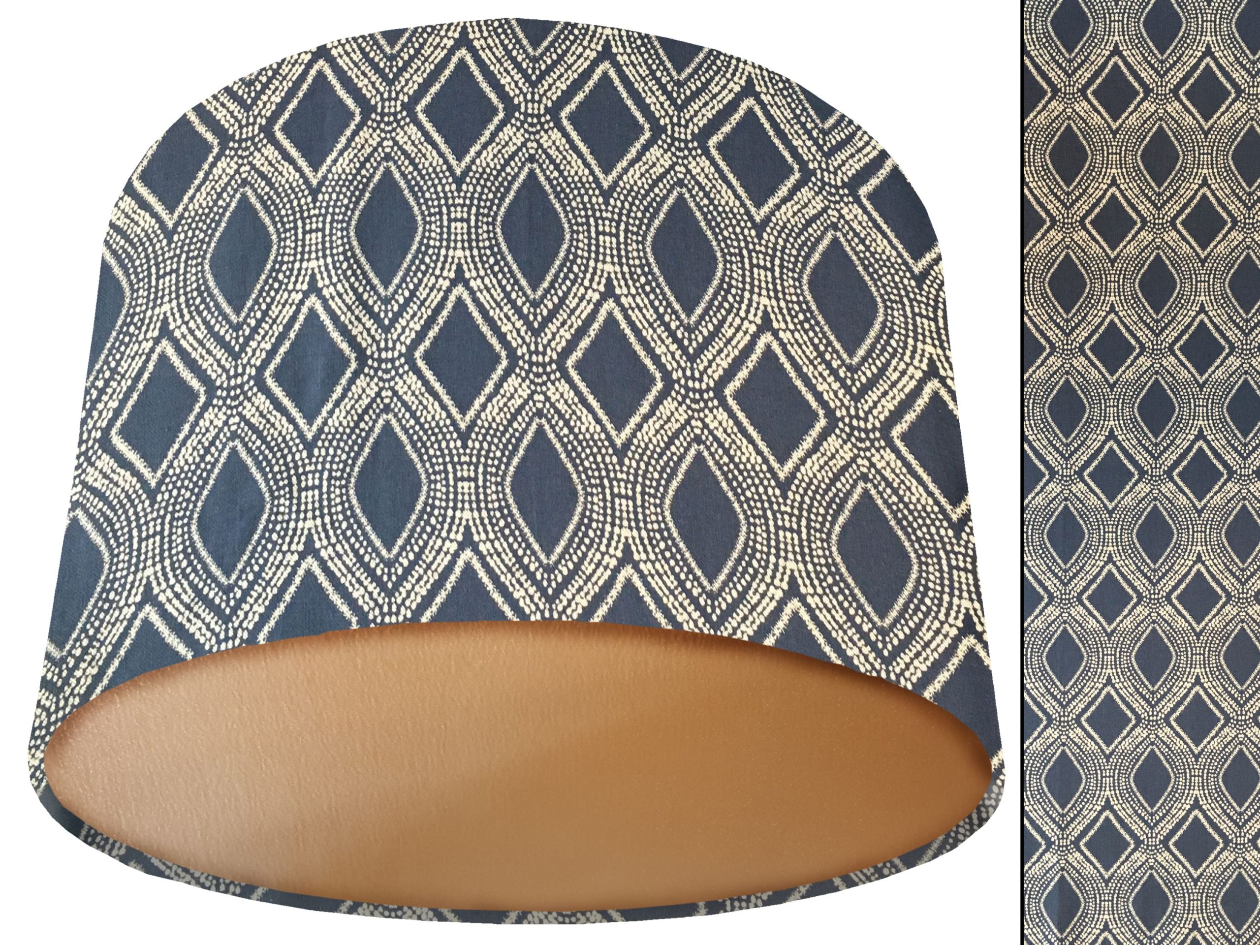 This is our stunning Boho blue lamp shade which is made from a modern Bohemian fabric. The patterned fabric features cleverly placed white dots which form spiral columns and alternating rows of diamonds & ovals, set against a dark blue background. This popular design is perfectly suited as a table lamp, but looks equally beautiful as a ceiling light.