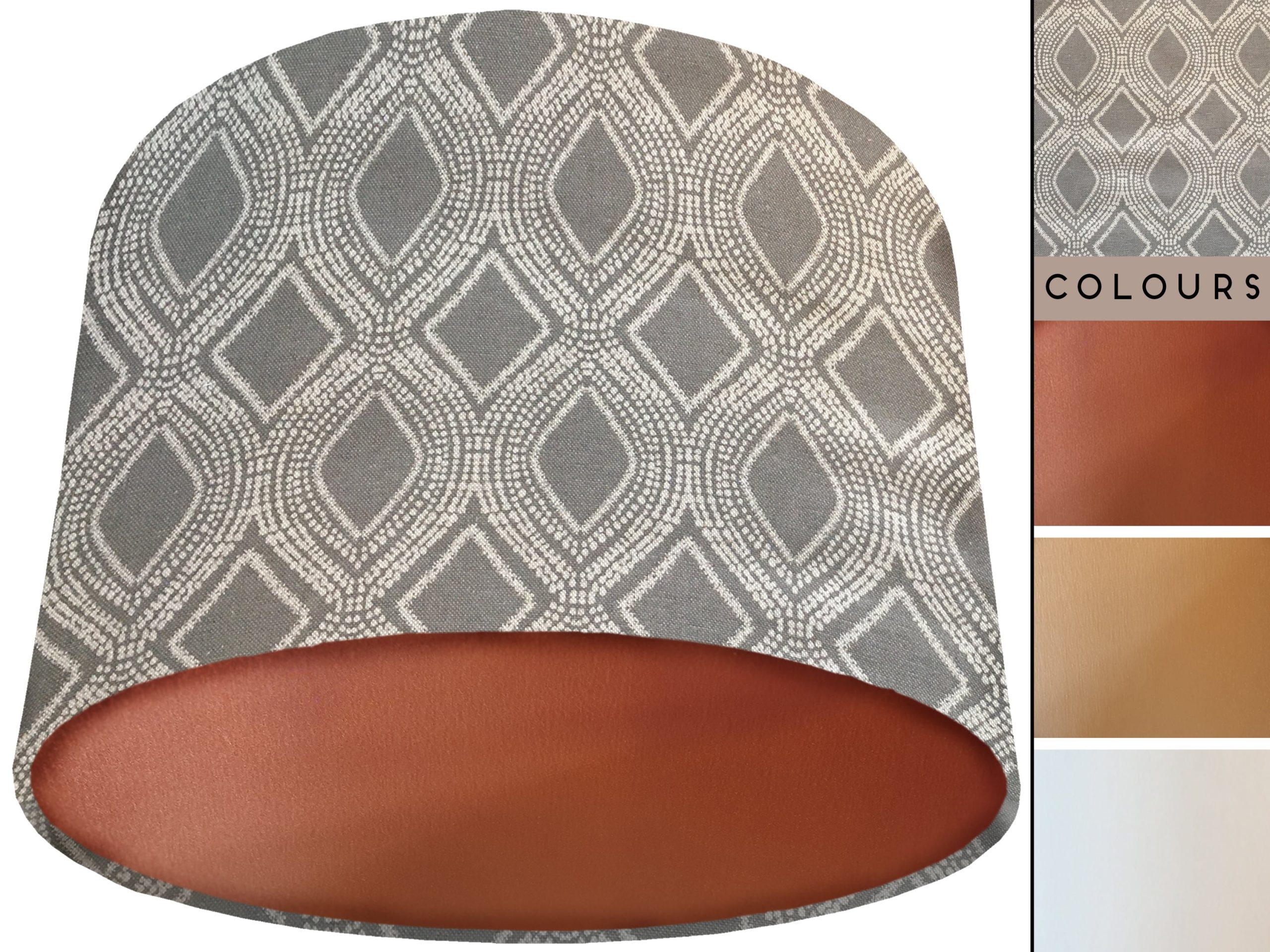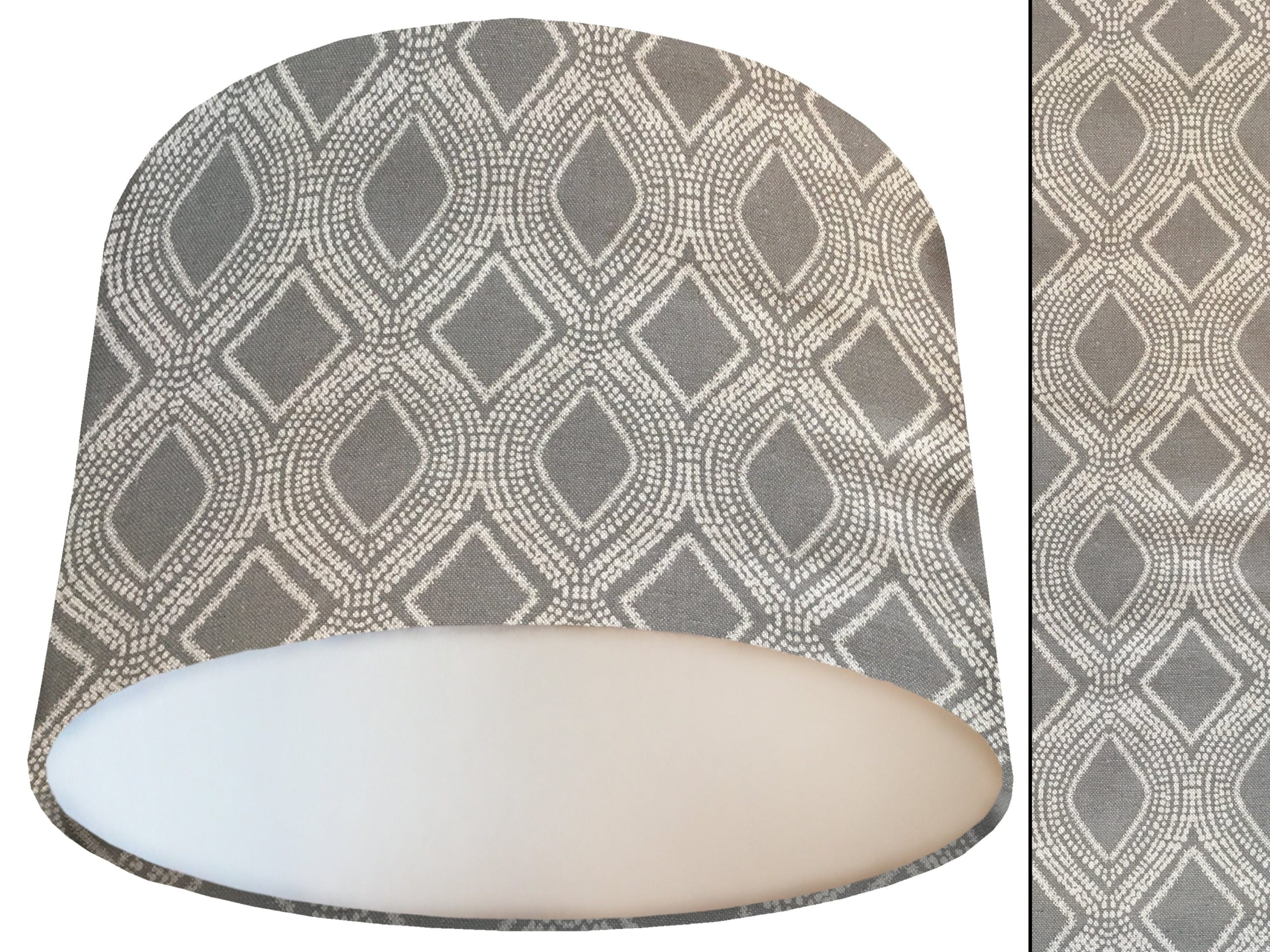 Our stunning Boho grey lamp shade is a stylish, modern look. The Boho grey patterned fabric features white dots aligned in such a way to create spiralling columns which cleverly forms alternating rows of diamonds & ovals set against a soft grey background. The light grey colour is a popular choice, and is suitable as a table lamp or a ceiling light.
