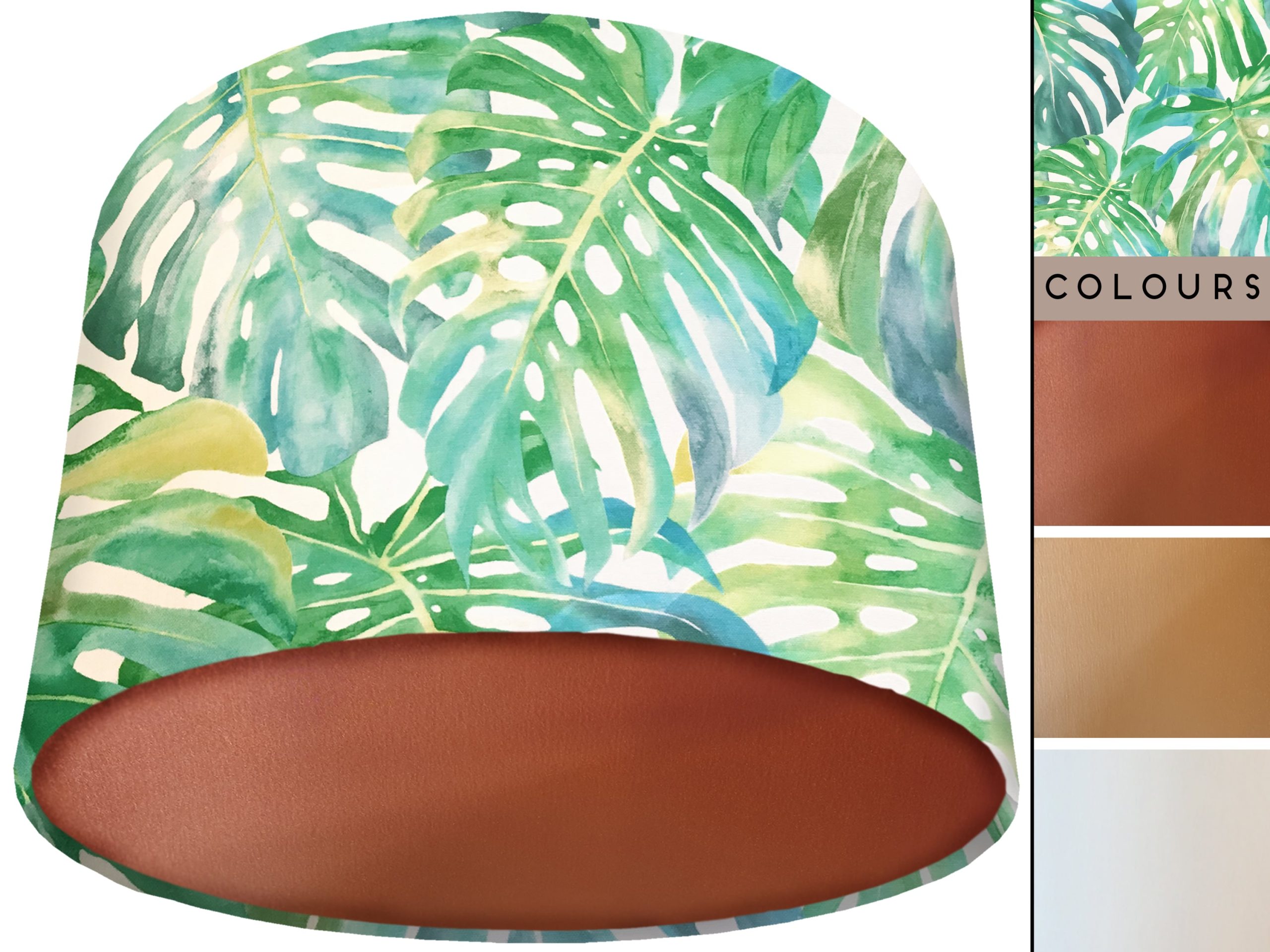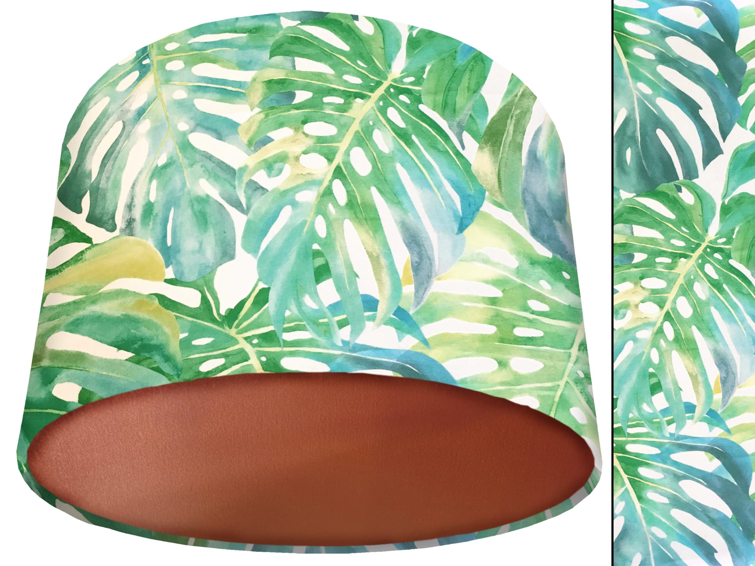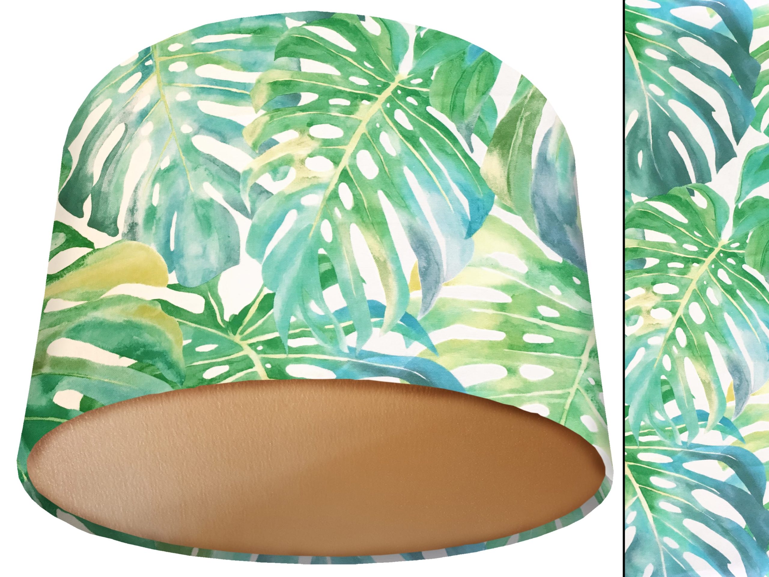 Our green tropical palm lamp shade has a modern palm leaf print inner, in a variety of green tones. This modern drum lampshade oozes style and looks tremendous when lit with beaming light above and below whilst highlighting the stunning design. Our green tropical palm lamp shade would be well suited to most interiors and would look wonderful as part of your bedroom or living room décor making a terrific bedside or sofa table lamp and reading light.