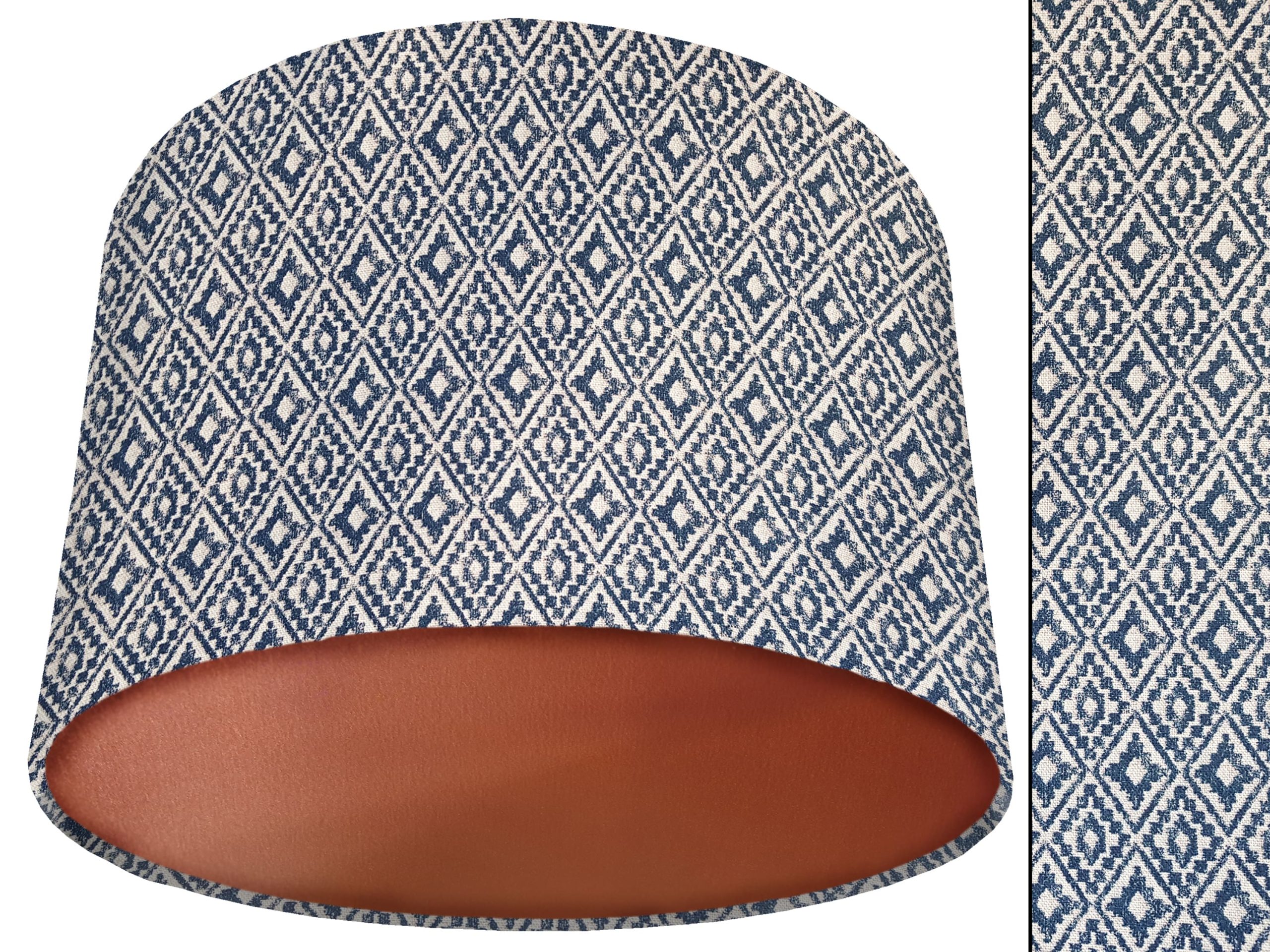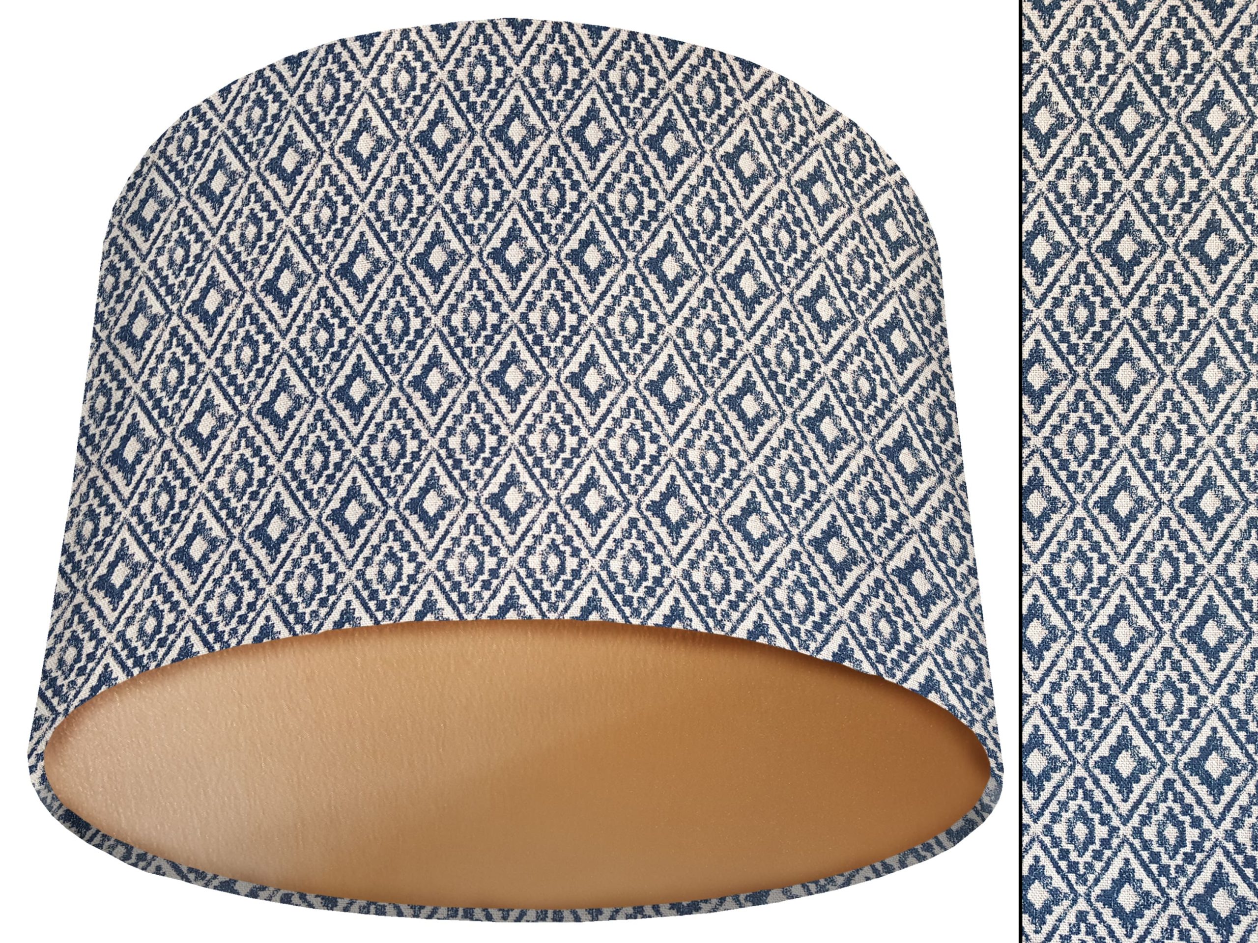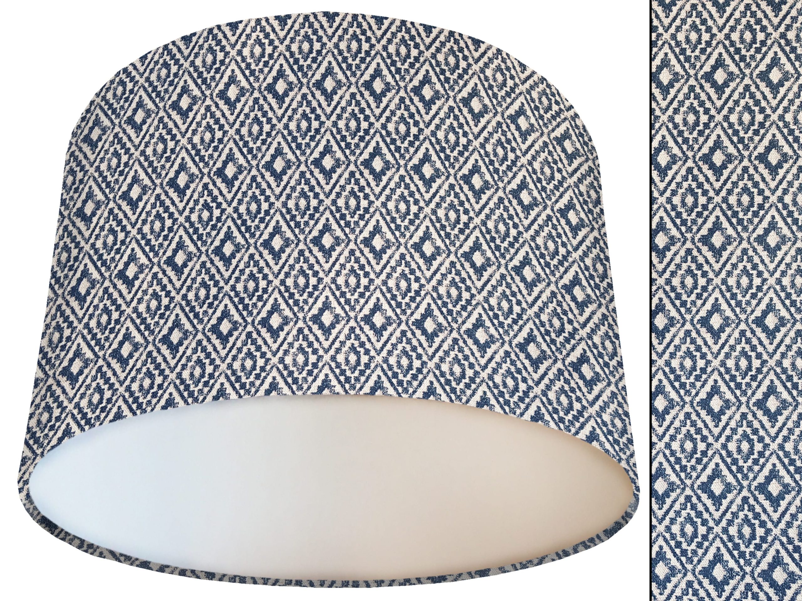 This is our stunning Navajo blue lamp shade which uses a stylish, contemporary blue diamond print fabric as the outer, with a selection of inners to reflect light. Inspired by traditional Native American art, this eye-catching Navajo Blue drum lampshade would be a stylish addition to your home, and is ideally suited as a reading light in the bedroom or living room.
