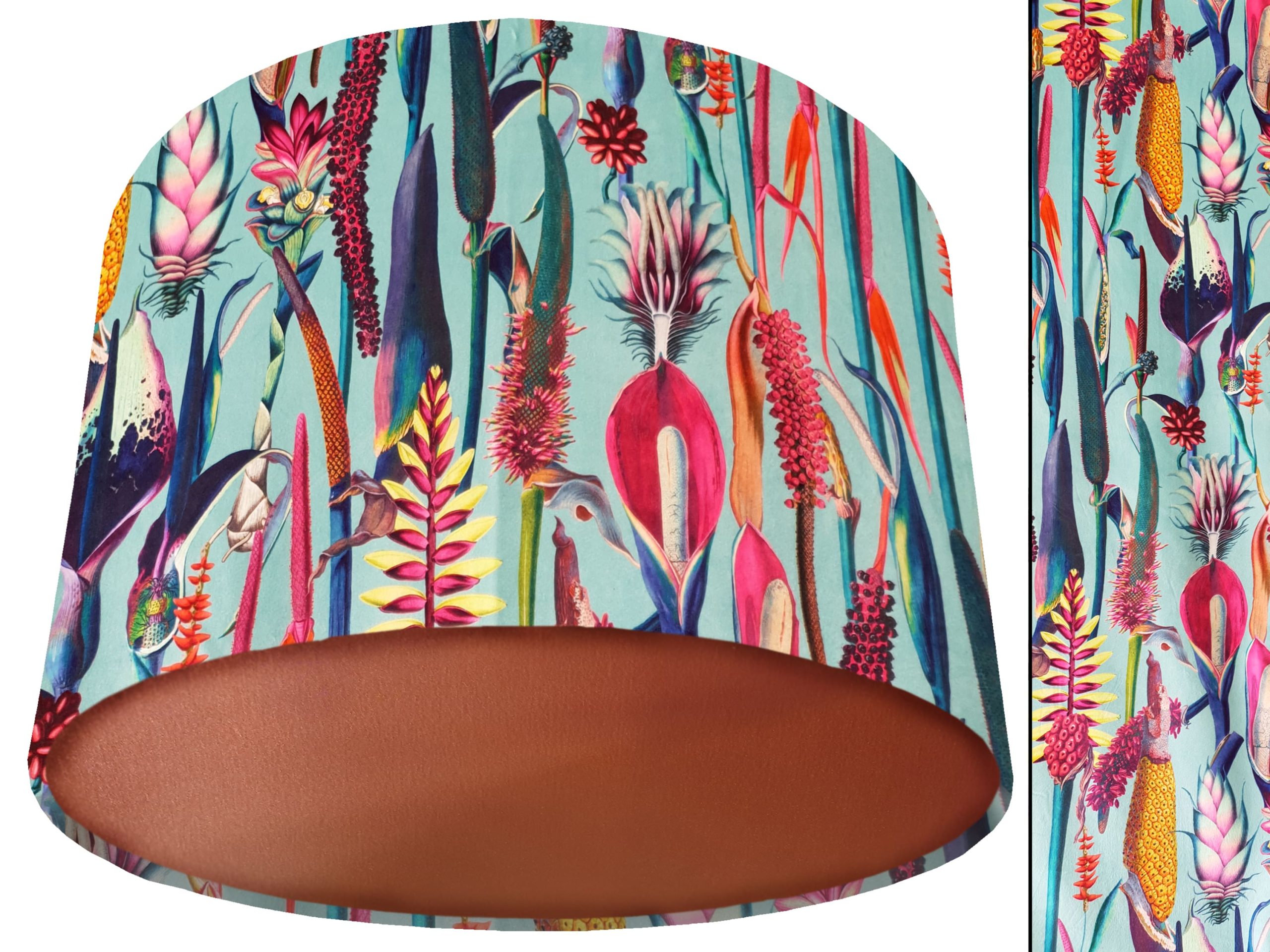 Our Green Floral Velvet Lampshade combines a luxurious patterned velvet exterior with a satin shimmer copper or gold lining. Perfect for adding copper or gold accents into your home décor. Our Green Floral Velvet Lampshade would make a stylish addition as either a table lamp or ceiling light. The design features a selection of colourful exotic flowers on a contrasting mint green background, ideal for adding a splash of colour into any room.