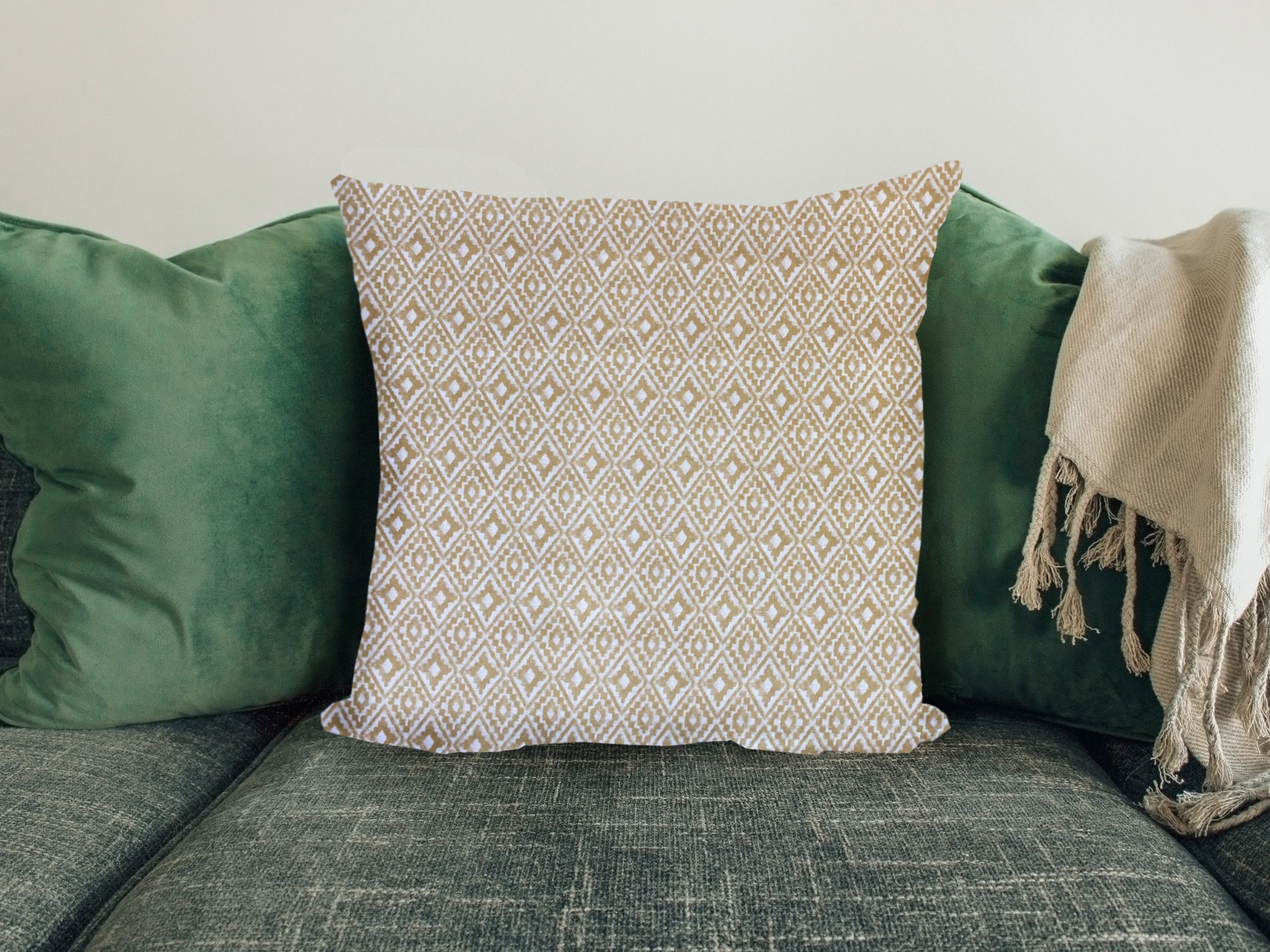 All sofa cushions at Light Owl are handmade to order from our workshop located in the North-East of England. Unless otherwise noted, the reverse of the cushion is a solid beige colour as shown in the picture.
