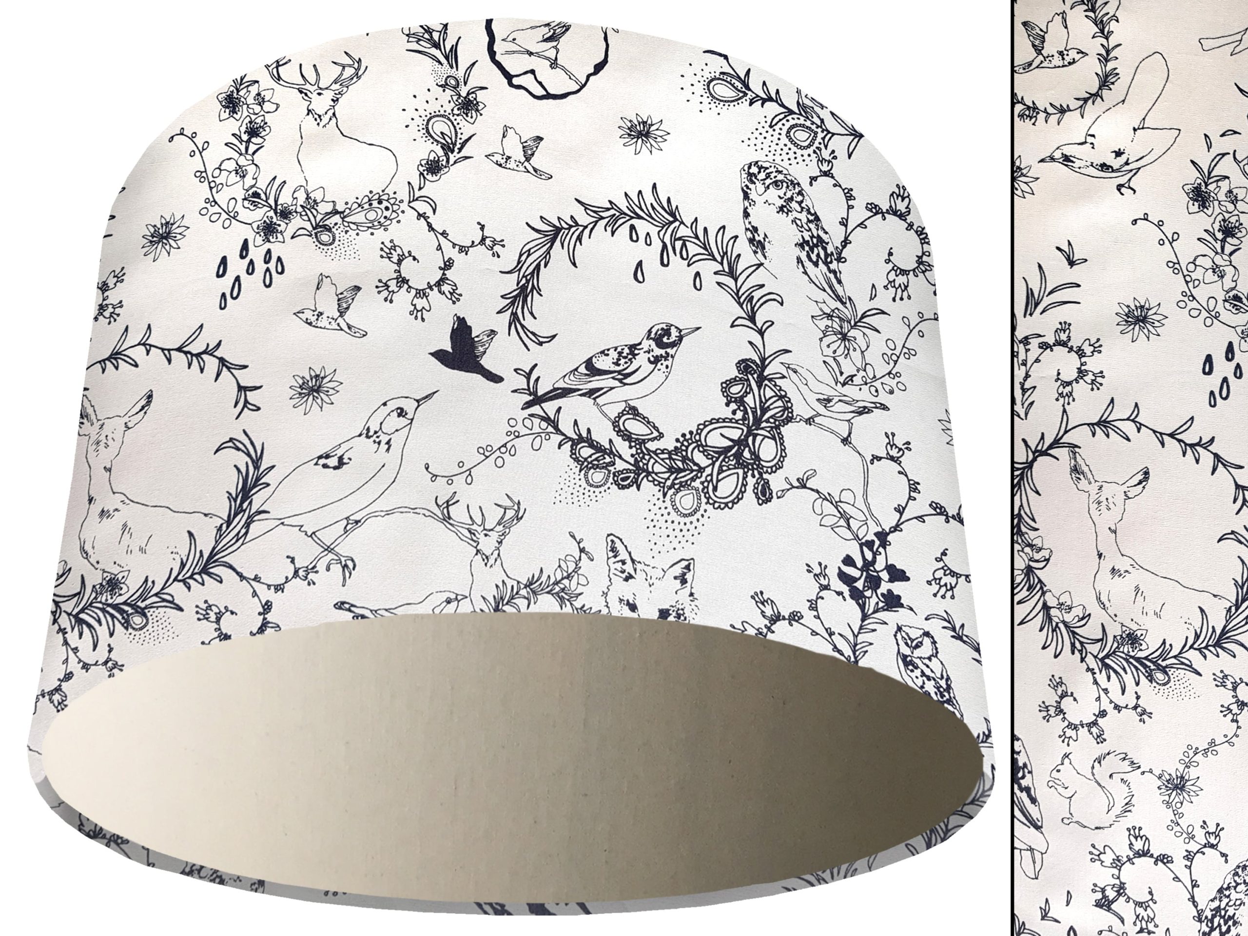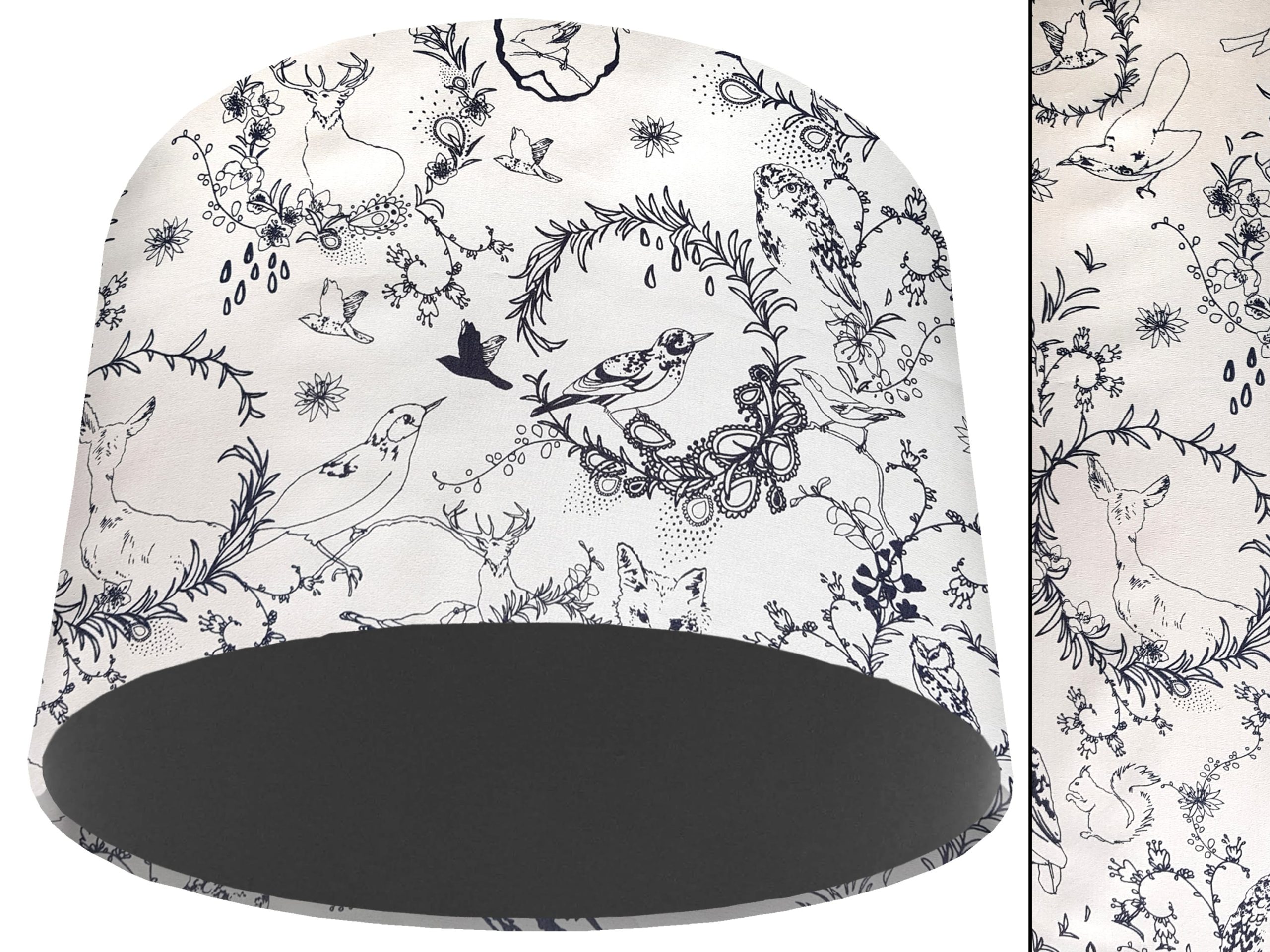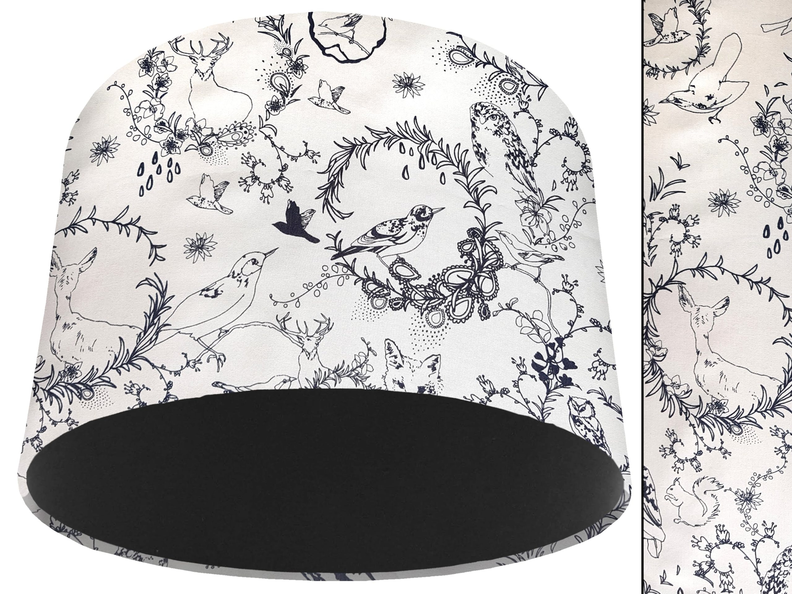 A stunning classic country design makes this black & white animal light shade a perfect addition to your country home interiors. Our light shades feature a patterned exterior combining a selection of British wildlife, including birds, foxes, & stags, with a classic botanical motif, all in a beautiful black & white colours. This can be paired with a solid cotton colour lining of your choosing, adding a pop of colour to the design & creating a modern twist for this black & white animal light shade.