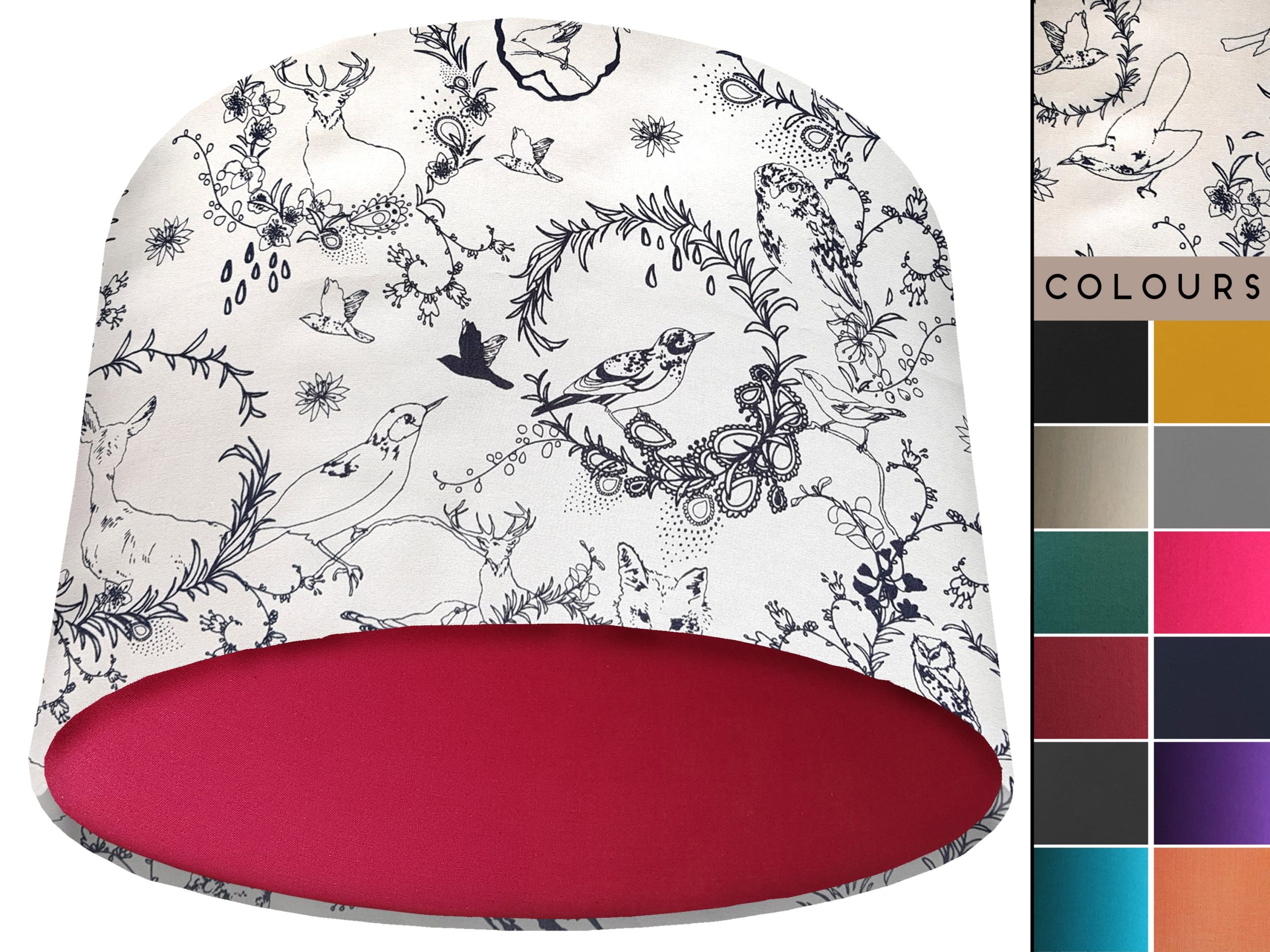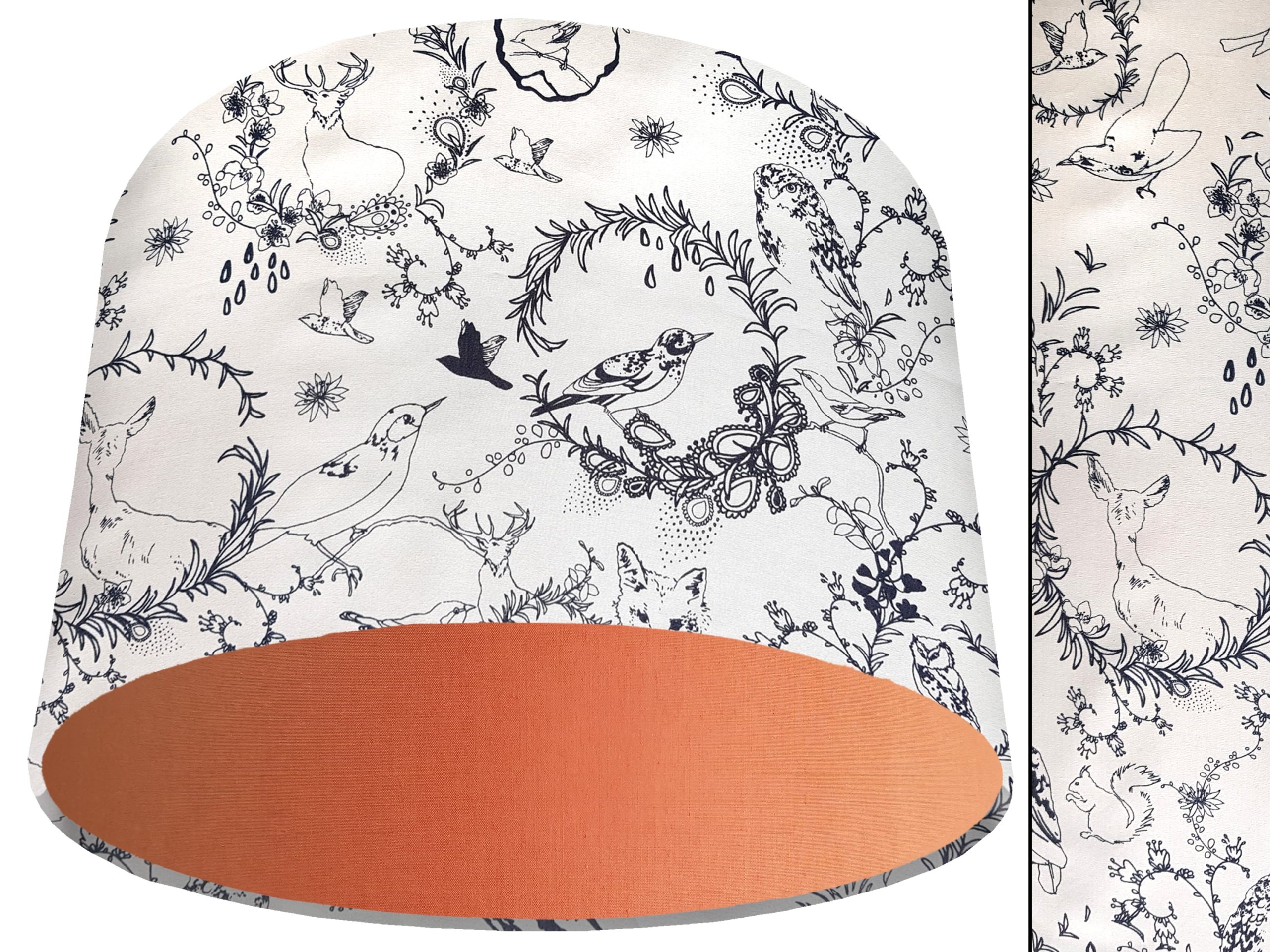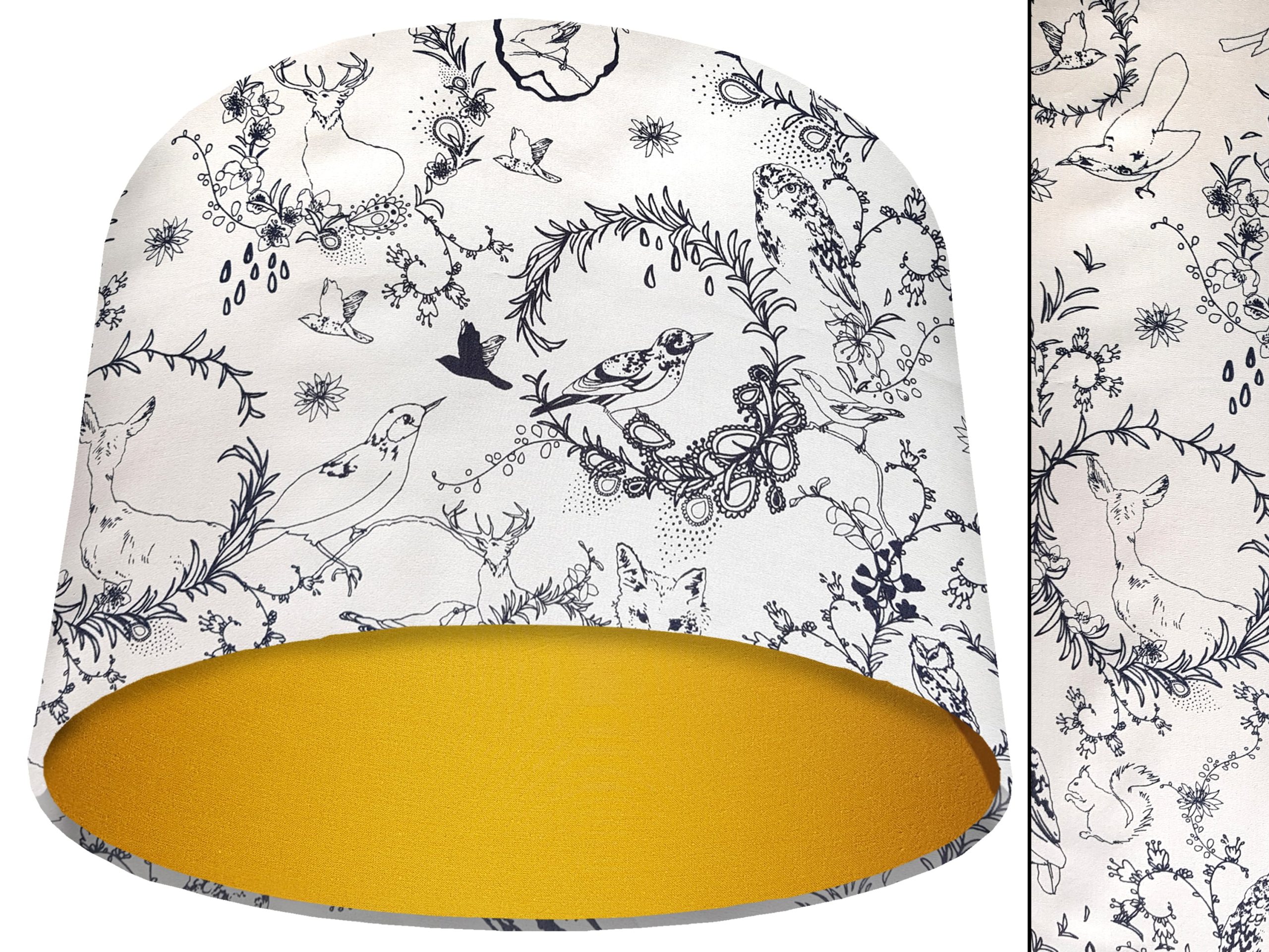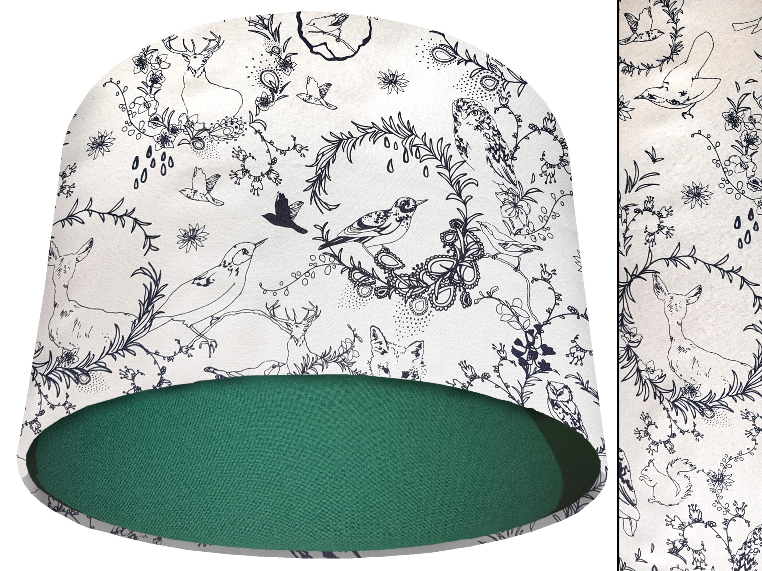 A stunning classic country design makes this black & white animal light shade a perfect addition to your country home interiors. Our light shades feature a patterned exterior combining a selection of British wildlife, including birds, foxes, & stags, with a classic botanical motif, all in a beautiful black & white colours. This can be paired with a solid cotton colour lining of your choosing, adding a pop of colour to the design & creating a modern twist for this black & white animal light shade.