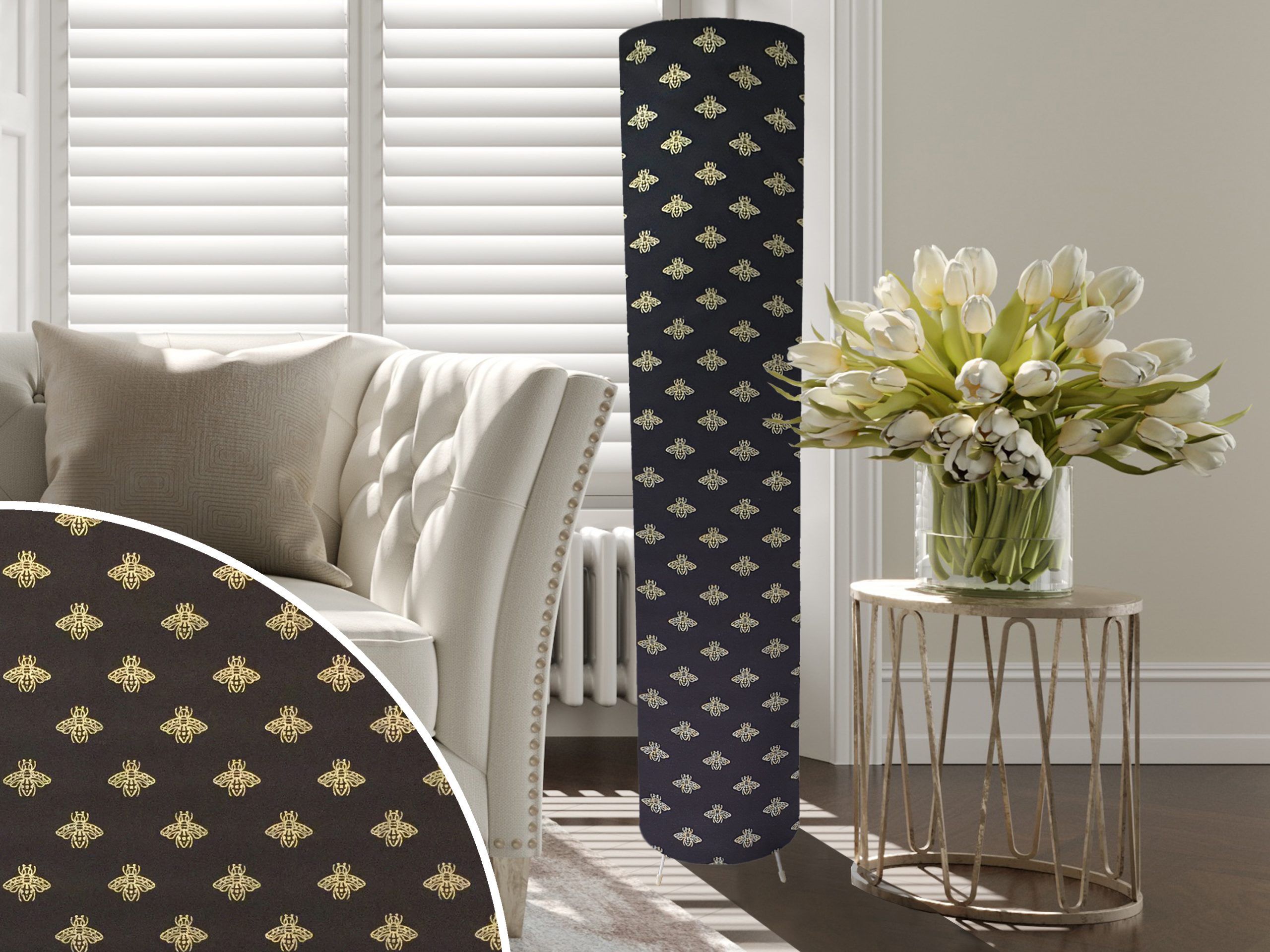 A stylish animal print fabric makes this golden bee floor lamp a colourful addition to your home interiors. This floor lamp features a gorgeous patterned exterior of shimmering gold bees on a contrasting black background. The fabric is backed onto a lampshade specific white PVC designed to provide reflect light internally to ensure the floor lamp will be well illuminated.