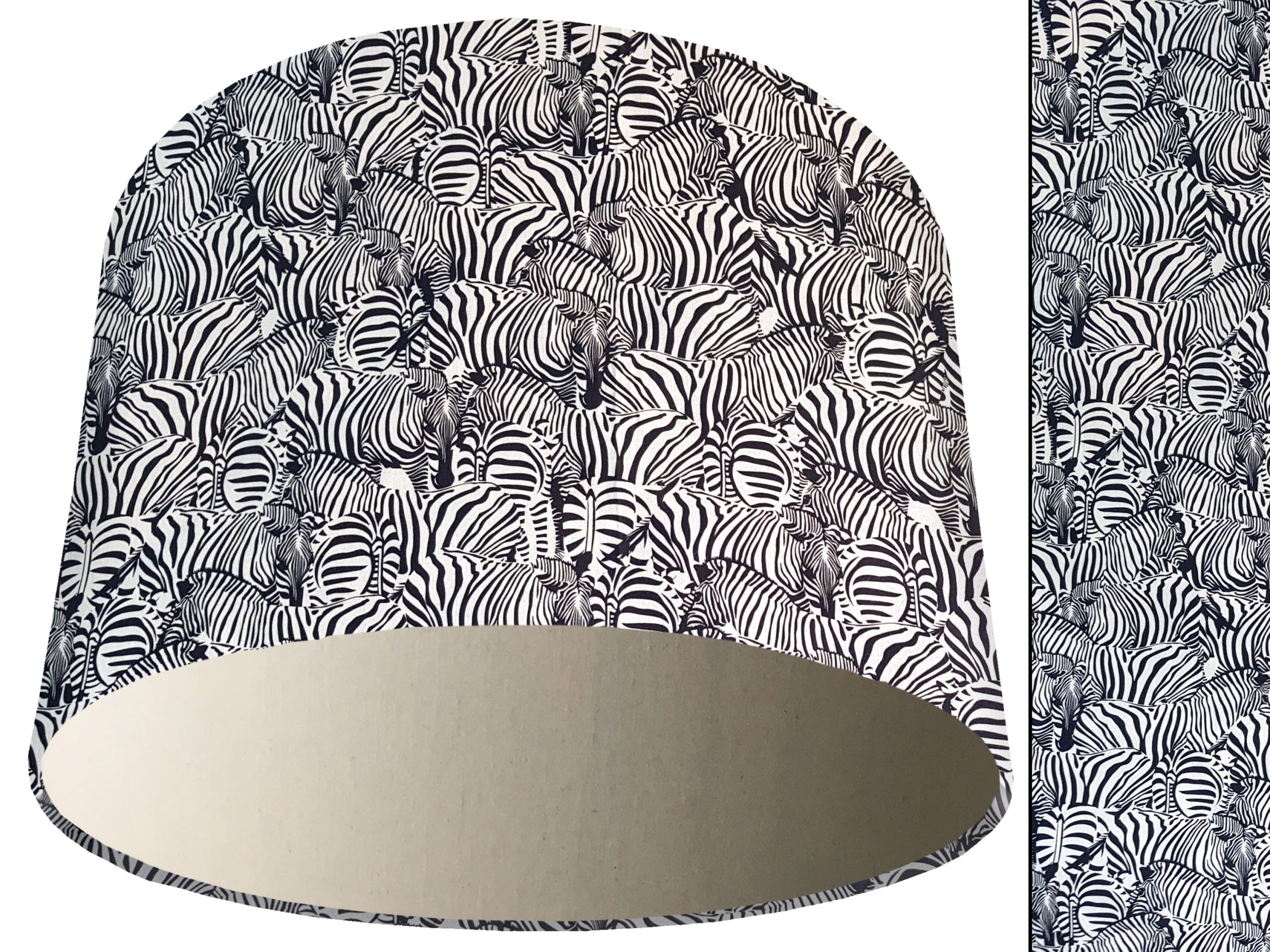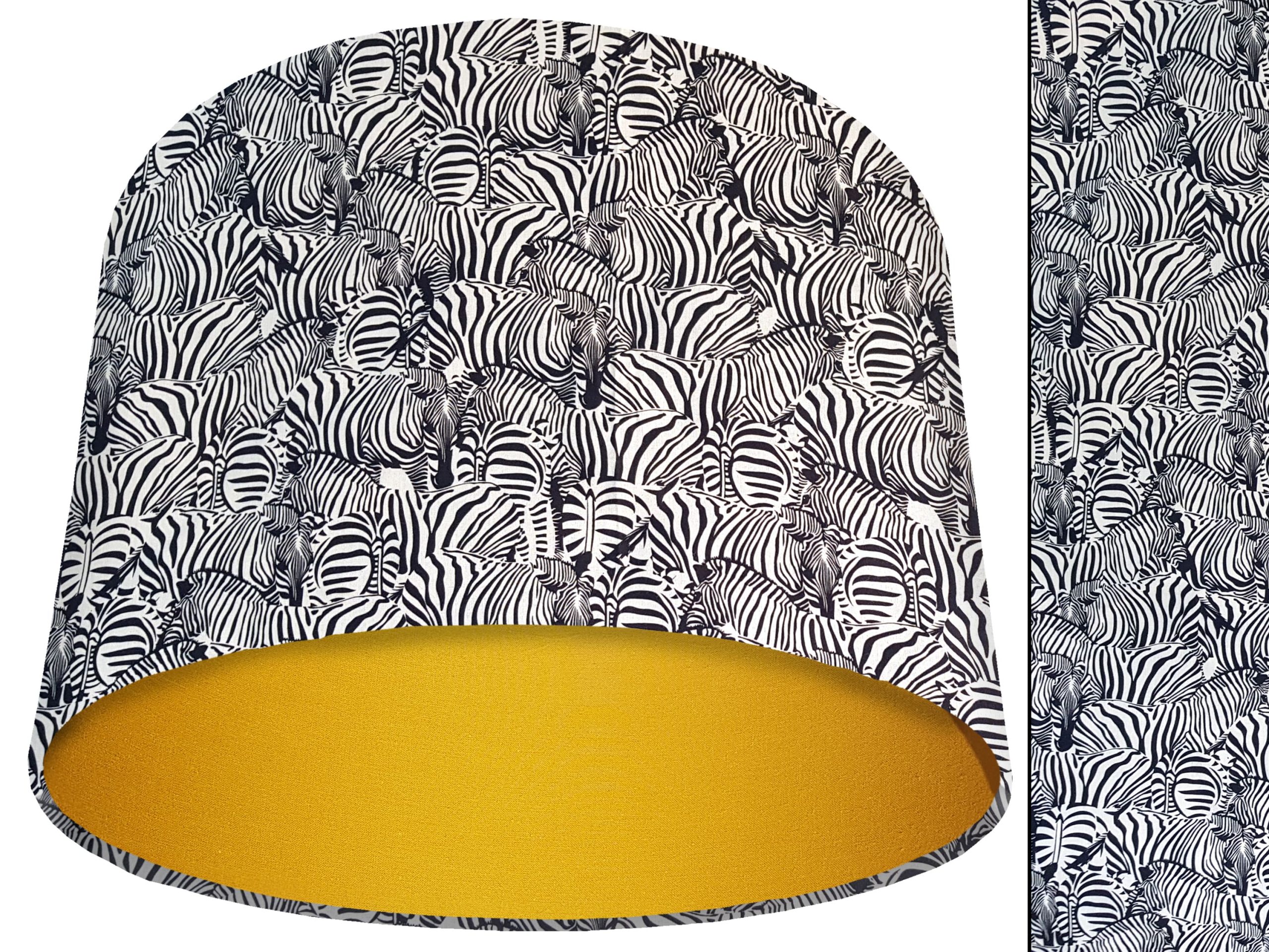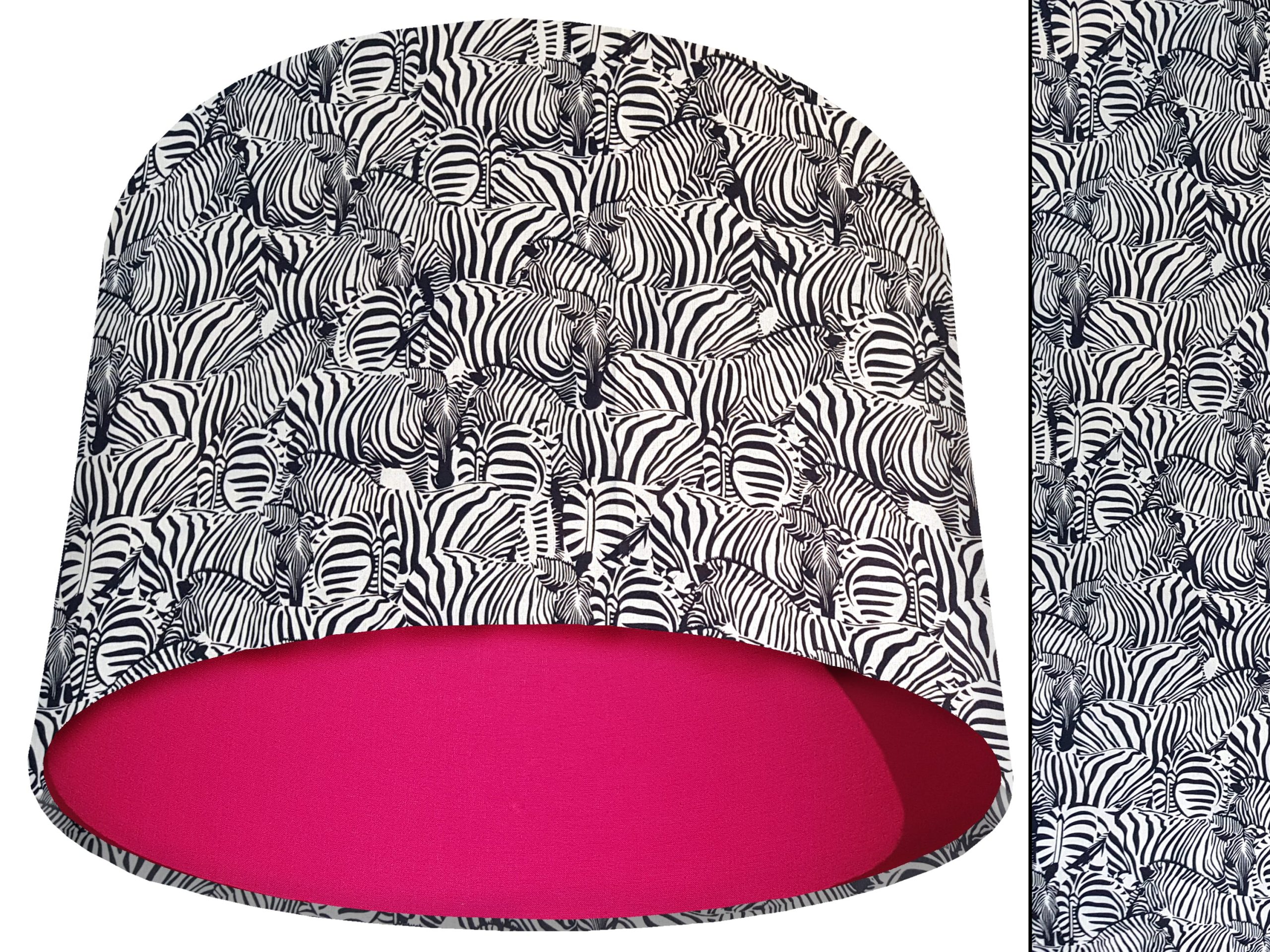 A striking animal print fabric makes this zebra print light shade a stylish addition to your bold home interiors. Our light shades feature an eye-catching outer of overlapping zebras, which almost creates a hypnotic effect. This can then be paired with a solid cotton colour lining of your choosing, adding a splash of colour to this zebra print light shade.