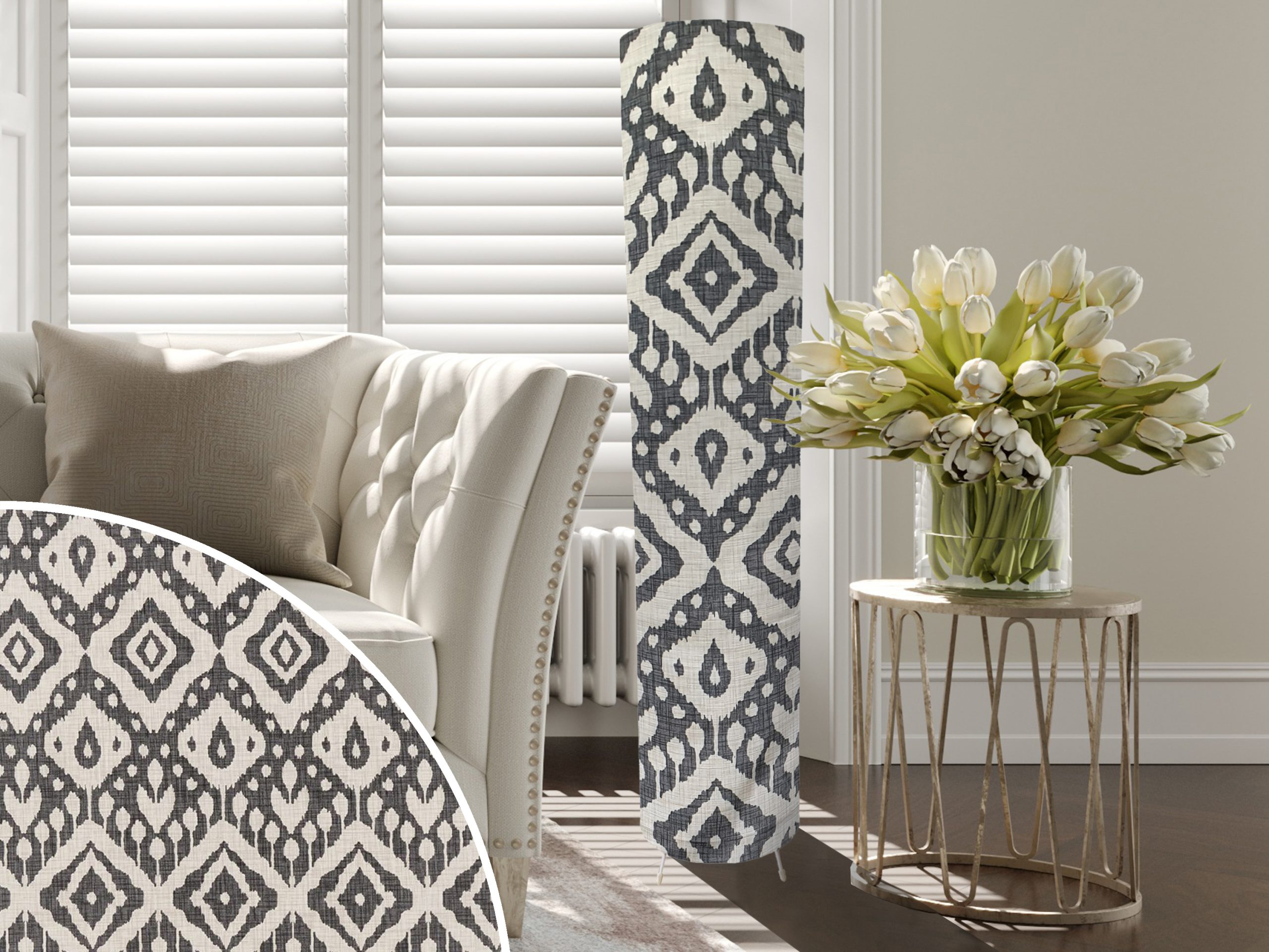 A modern geometric design makes this Marrakech grey floor lamp a stylish addition to your home interior. Our floor lamps feature a gorgeous patterned exterior of an African inspired design in grey & white. The fabric is backed onto a lampshade specific white PVC designed to provide reflect light internally to ensure the floor lamp will be well illuminated.