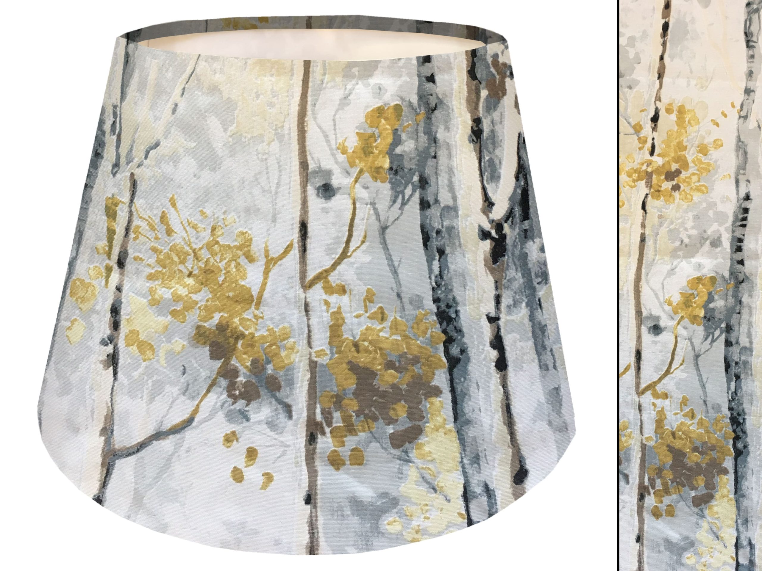 Our stunning Silver Birch Empire Lampshade features a stylish Scandinavian style fabric of stylised trees in varying grey tones ranging from light to dark, with an even lighter grey background. To add a pop of colour to this simple design are leaves in vibrant gold. The soft silver-grey tones allow the design to seamlessly integrate with almost any home décor, and the gold leaves bring enough flair to the design that your eye will notice the shade. It looks amazing in a variety of different locations, such as a table lampshade in the bedroom, or hanging from the ceiling in the living room. Our Silver Birch empire lampshade is perfect for creating a soft, calming environment whilst being beautiful & eye-catching.