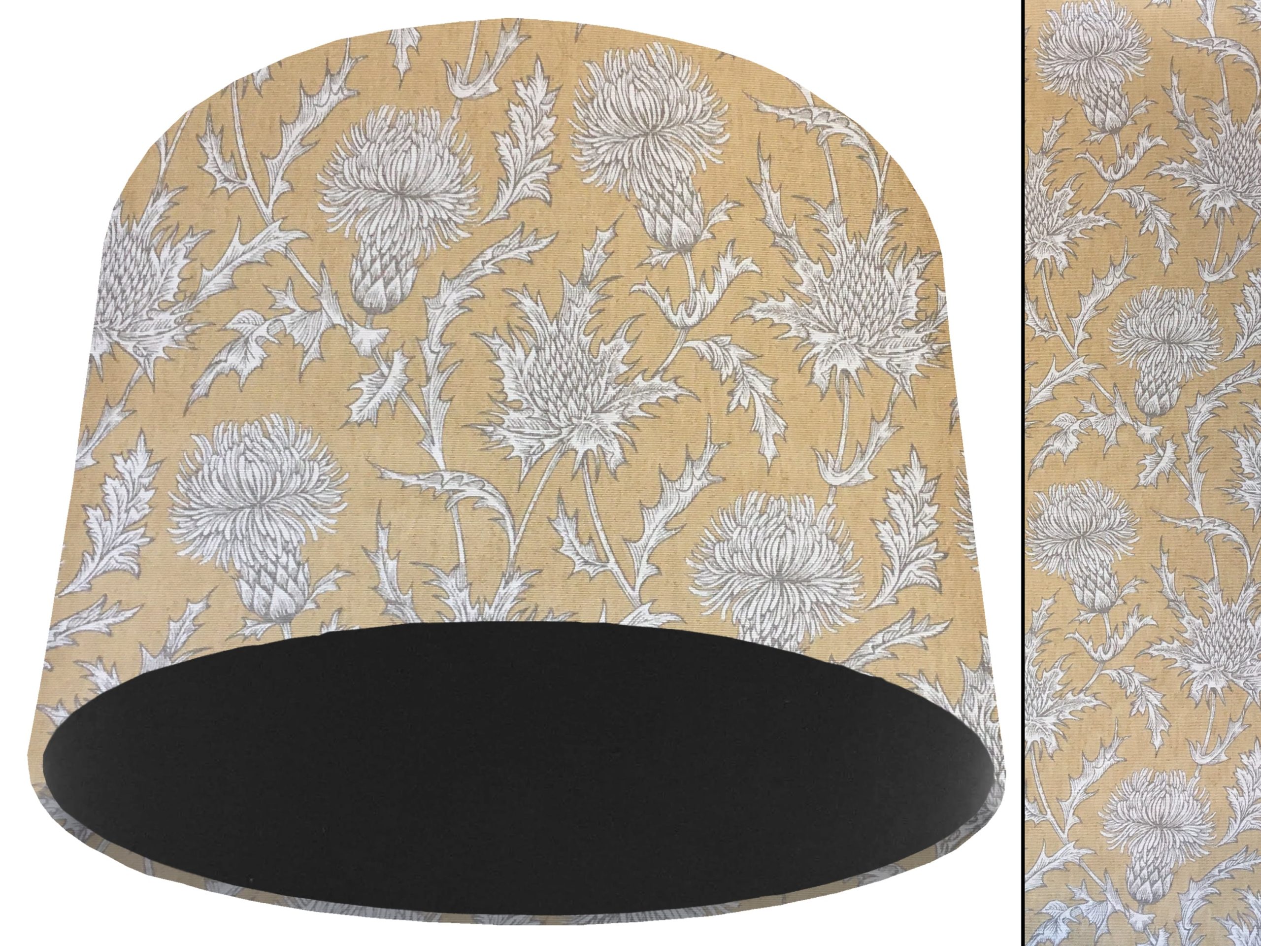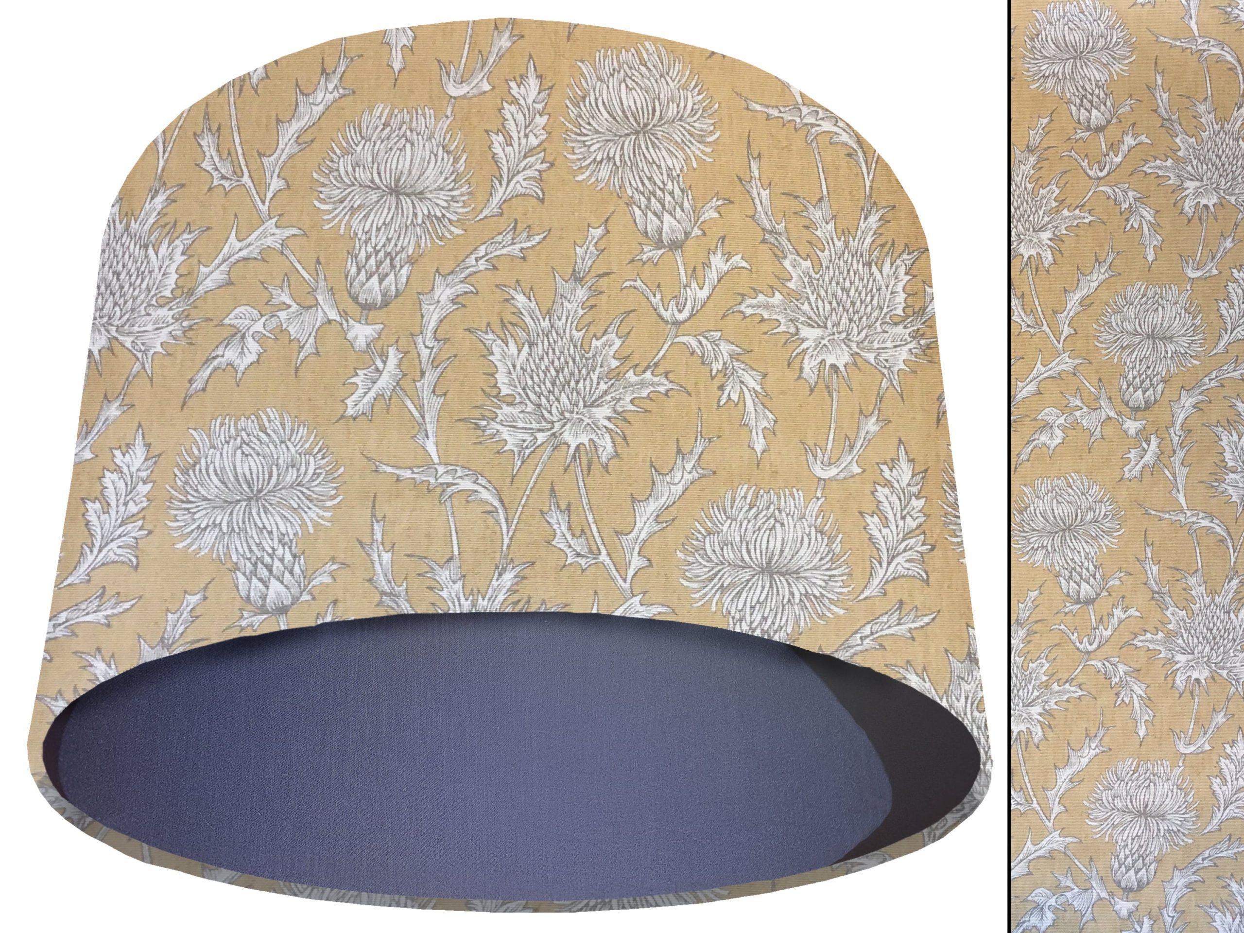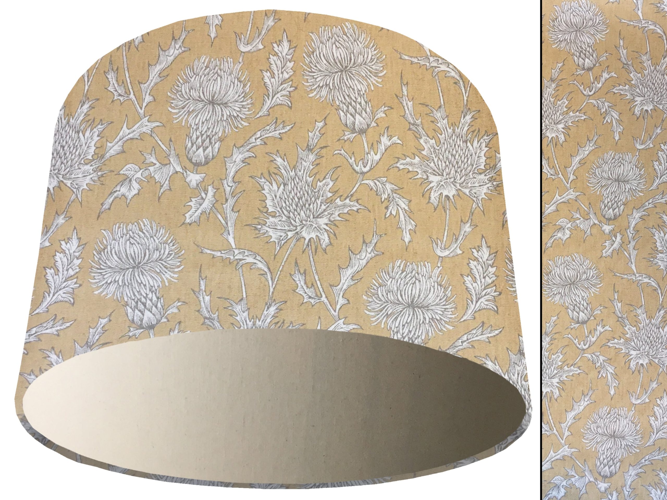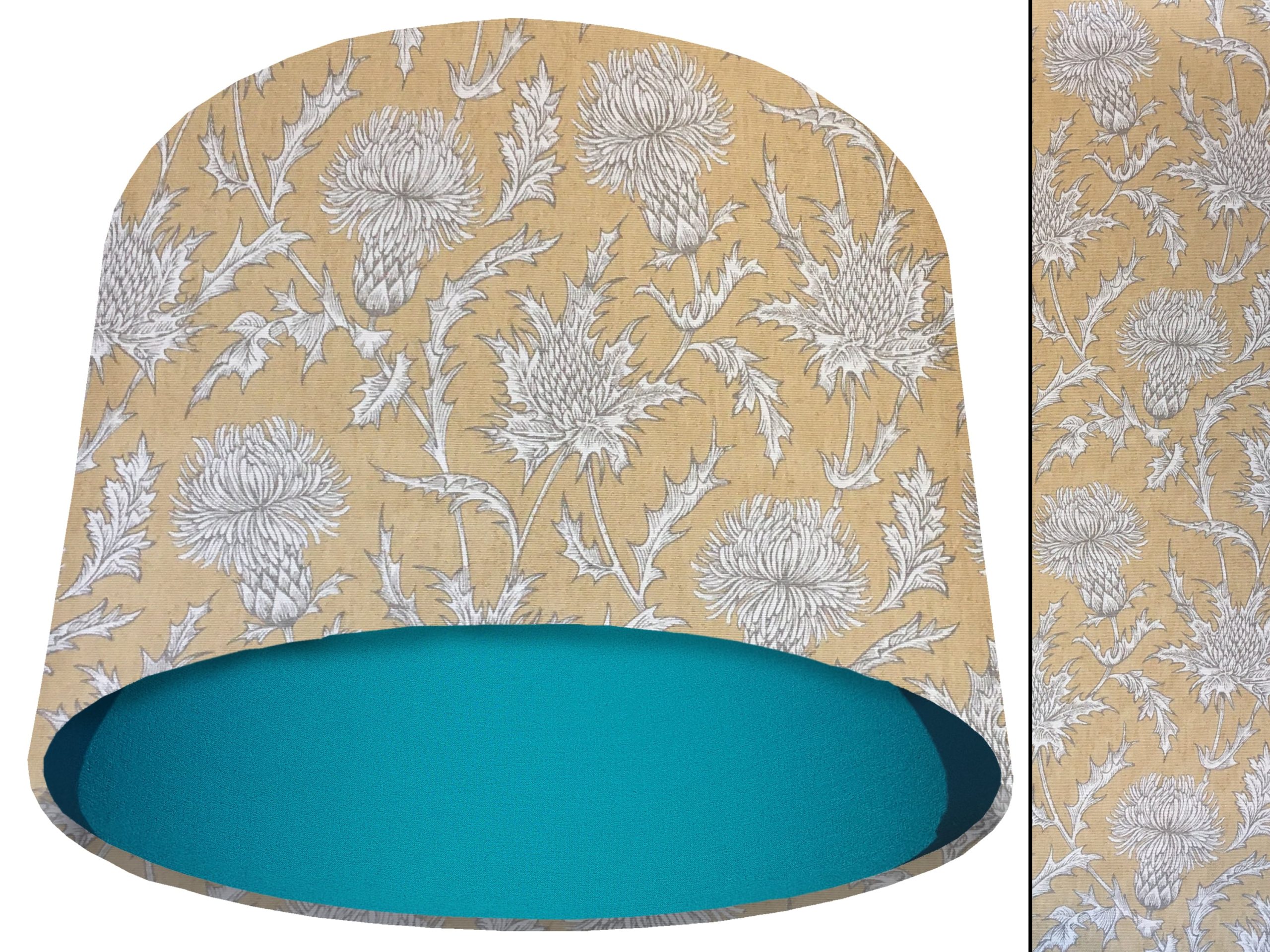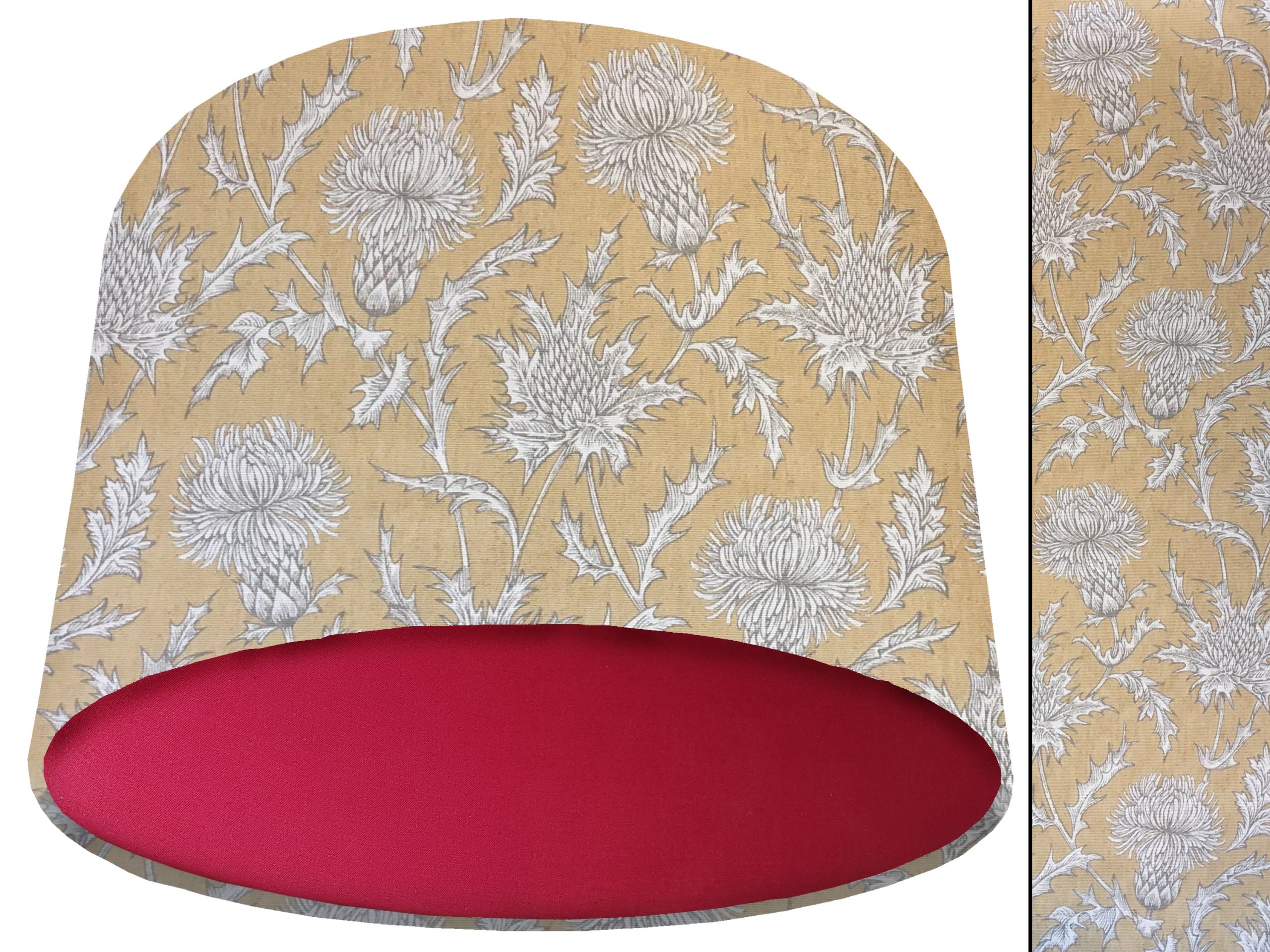 A stylish classic country home fabric makes this mustard thistle light shade a perfect addition to your contemporary home interiors. Our light shades feature a patterned exterior featuring a classic thistle print in white & grey, but on a modern on-trend mustard yellow background. This can be paired with solid cotton colour lining of your choosing, adding an extra burst of colour to this mustard thistle light shade.