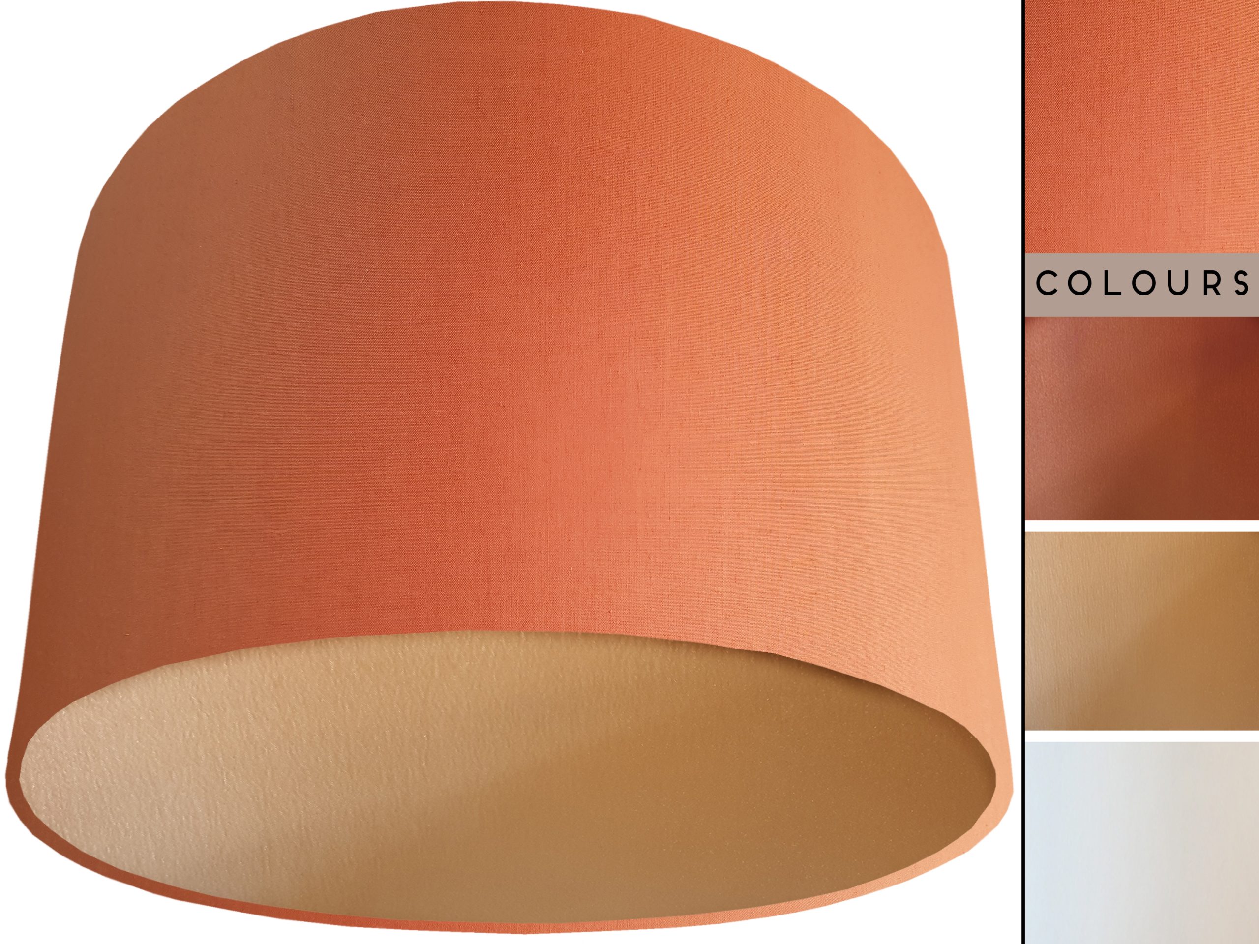 Orange lampshade with shimmer fabric lining, perfect for creating a subtle yet stylish look into any room. The outer fabric is a plain earthy orange cotton, and can be paired with either a plain white PVC lining or a gorgeous shimmer fabric which adds an extra splash of colour to the shade. Perfect as a ceiling light shade or table lamp shade in your home.