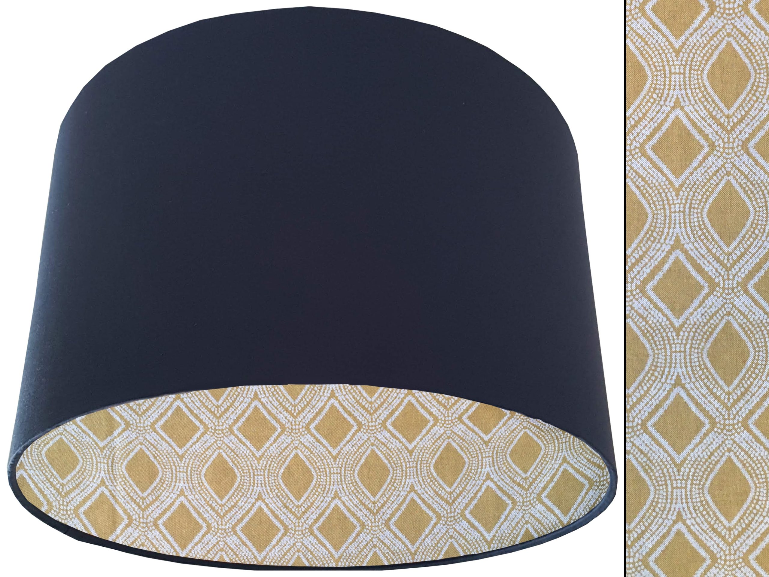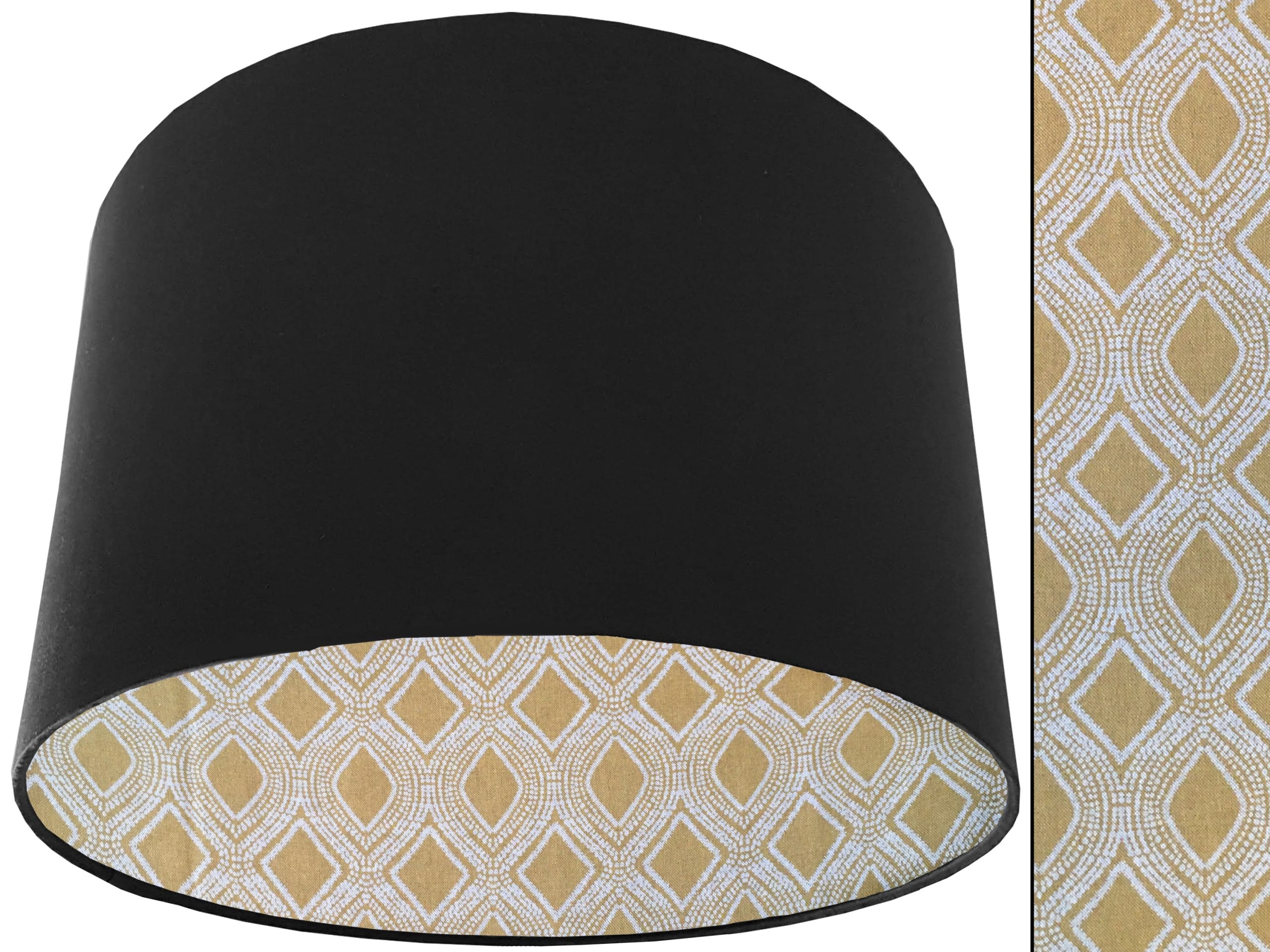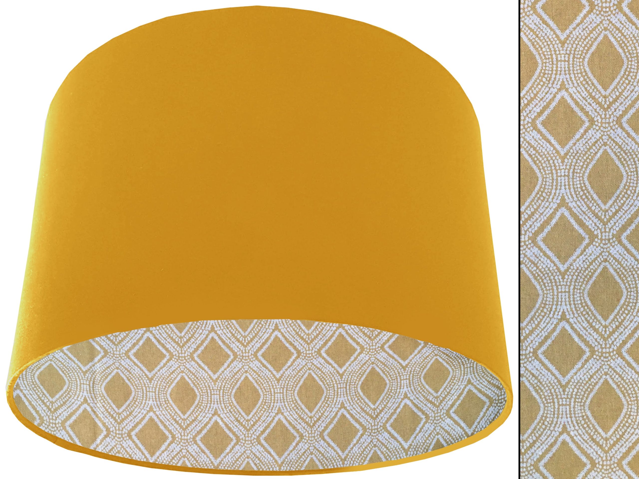 A gorgeous yellow Bohemian fabric makes this Boho yellow lampshade a vibrant addition to your home interiors. Our lampshades are stylishly lined with an eye-catching Bohemian print of spiralling white dots which are arranged to create alternating diamond & oval rows in the mustard yellow background. It can paired with an outer cotton colour of your choosing, giving this Boho yellow lampshade an extra splash of colour and style.