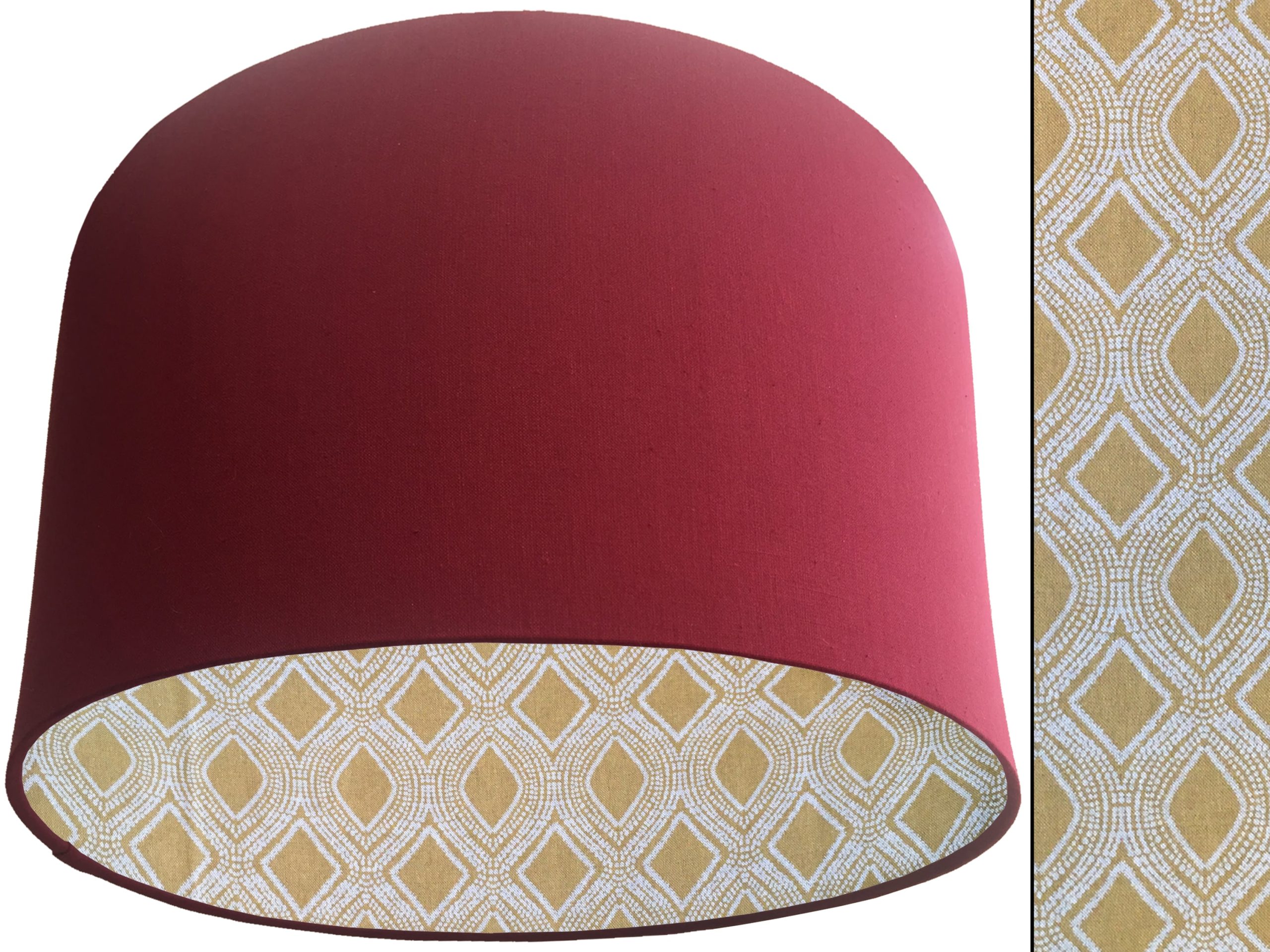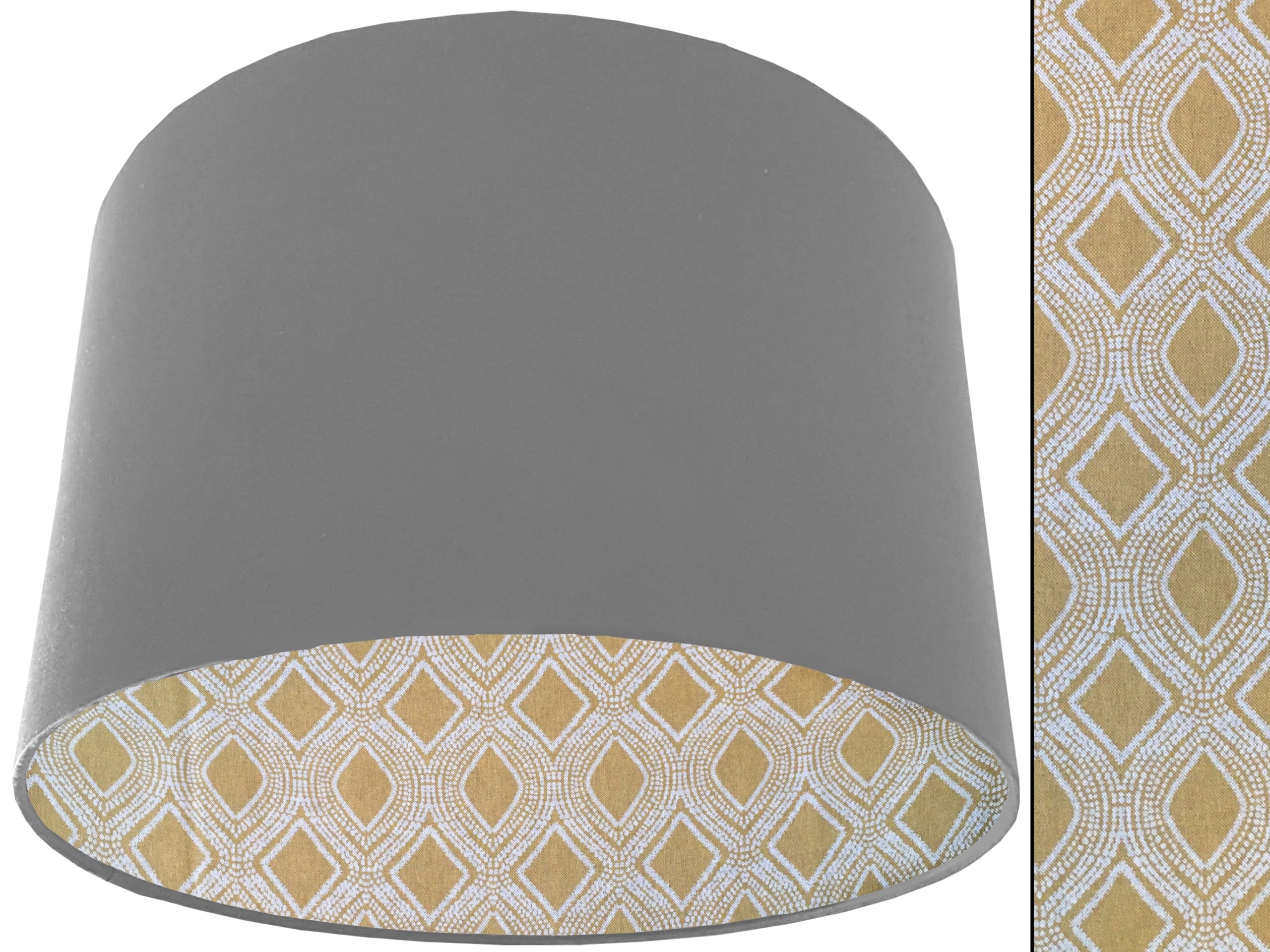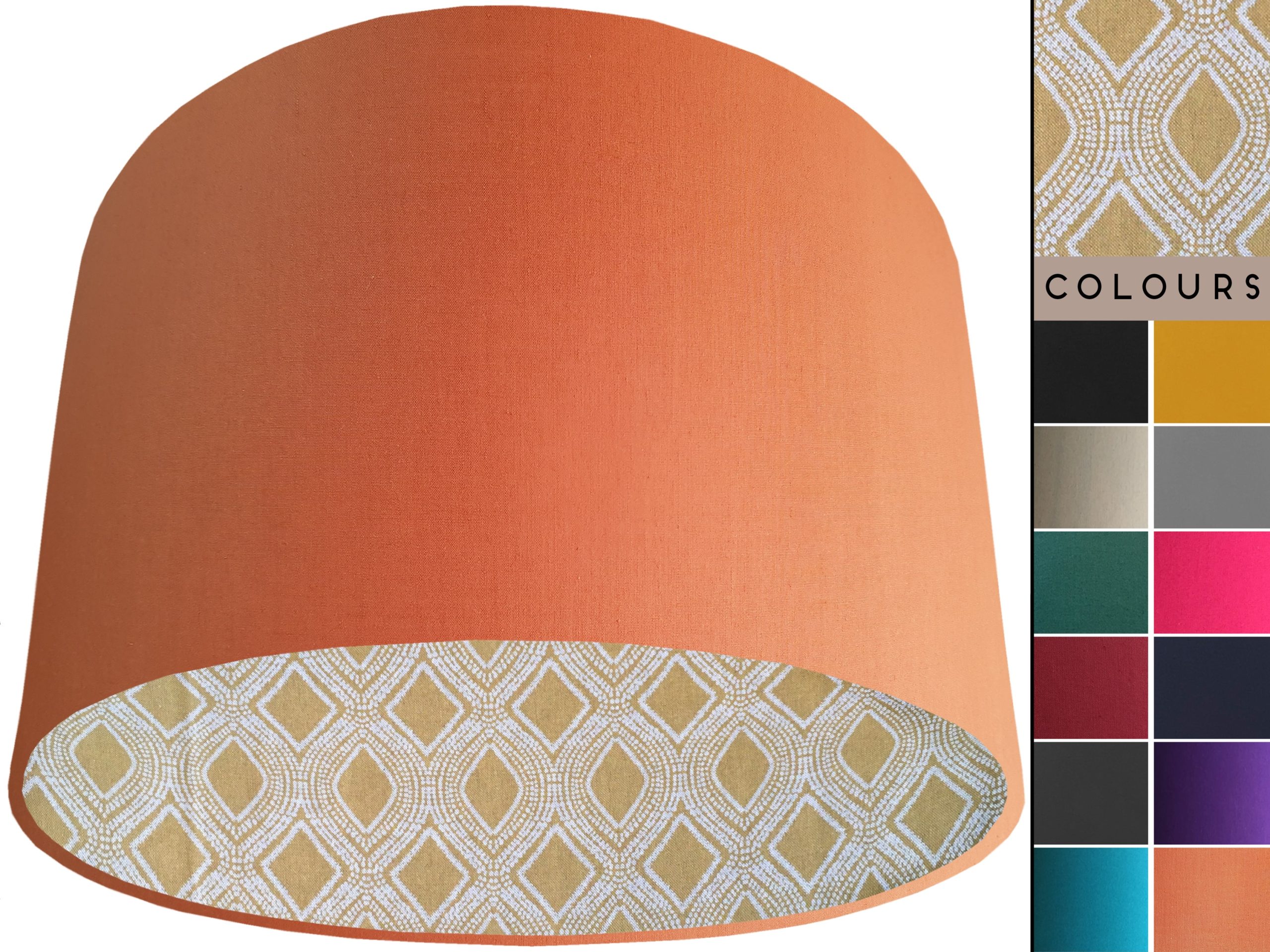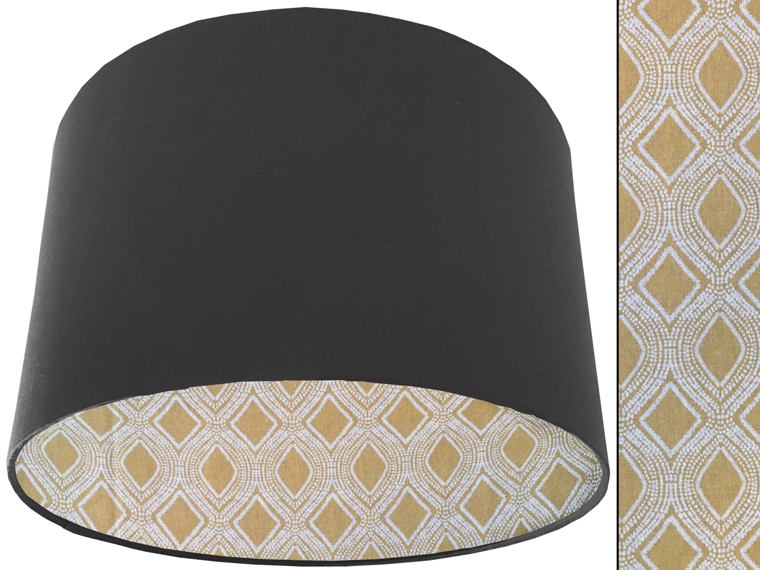 A gorgeous yellow Bohemian fabric makes this Boho yellow lampshade a vibrant addition to your home interiors. Our lampshades are stylishly lined with an eye-catching Bohemian print of spiralling white dots which are arranged to create alternating diamond & oval rows in the mustard yellow background. It can paired with an outer cotton colour of your choosing, giving this Boho yellow lampshade an extra splash of colour and style.
