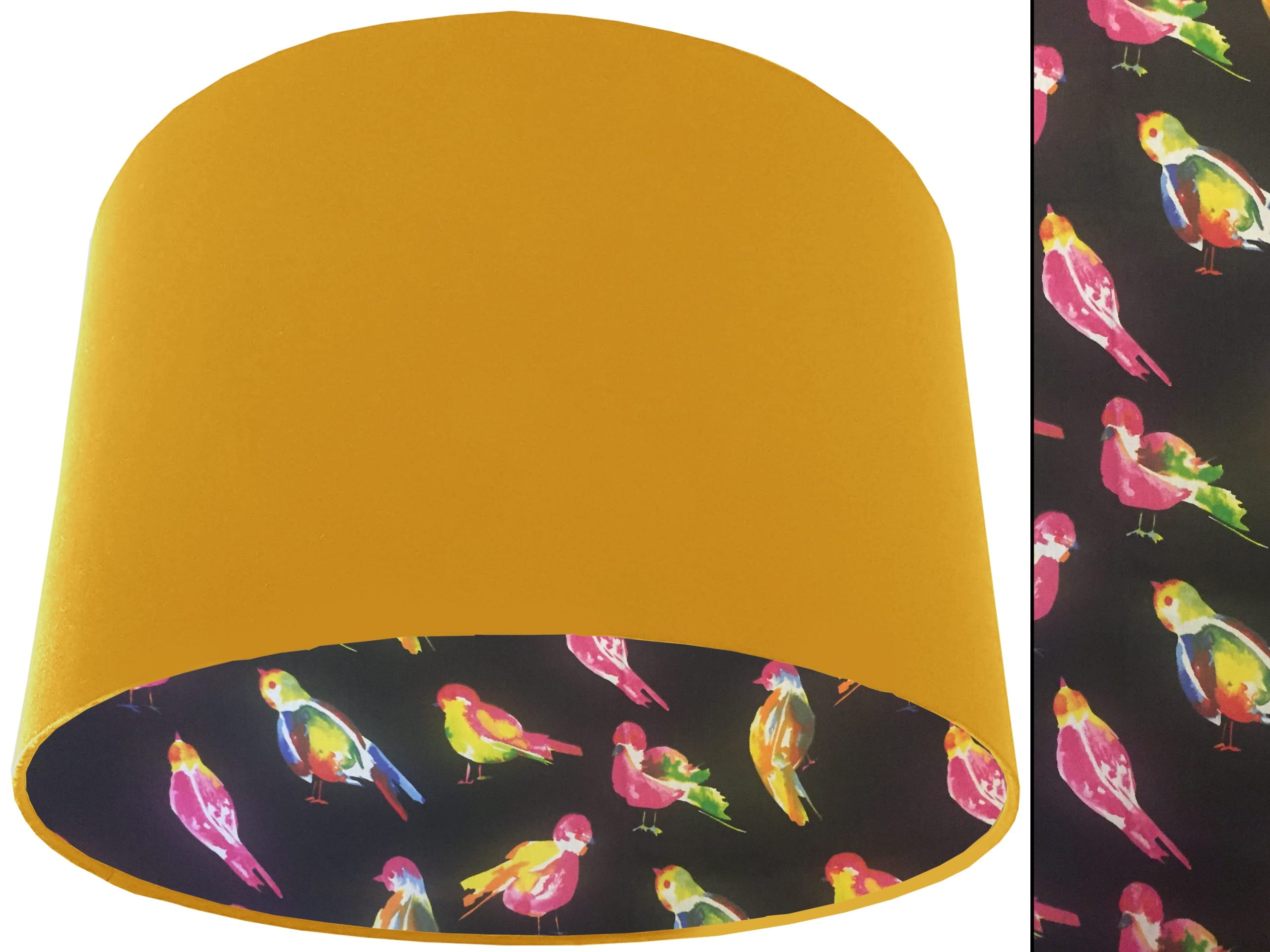 A striking bird print fabric make this bright bird lampshade a vibrant addition to your home interiors. Our lampshades are lined beautifully with a stylish bird print fabric featuring electric neon birds on a contrasting black background, which helps the colours pop. You can then pair this with an outer cotton colour of your choosing, giving this bright bird lampshade an extra splash of colour and style.