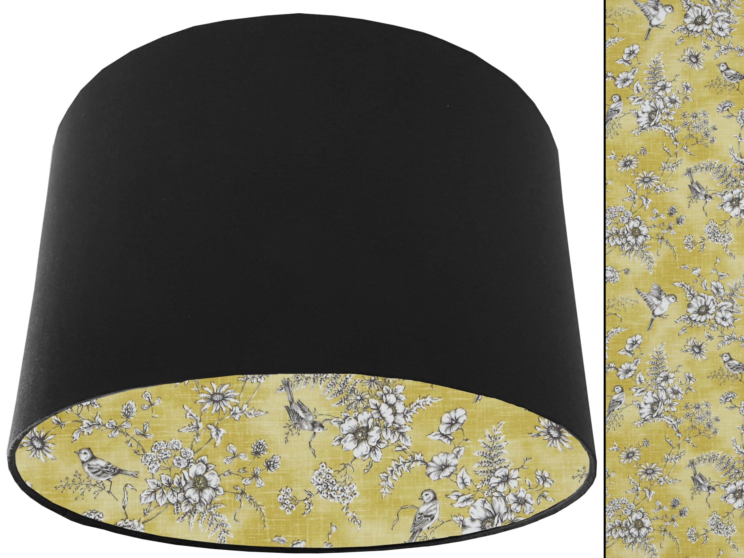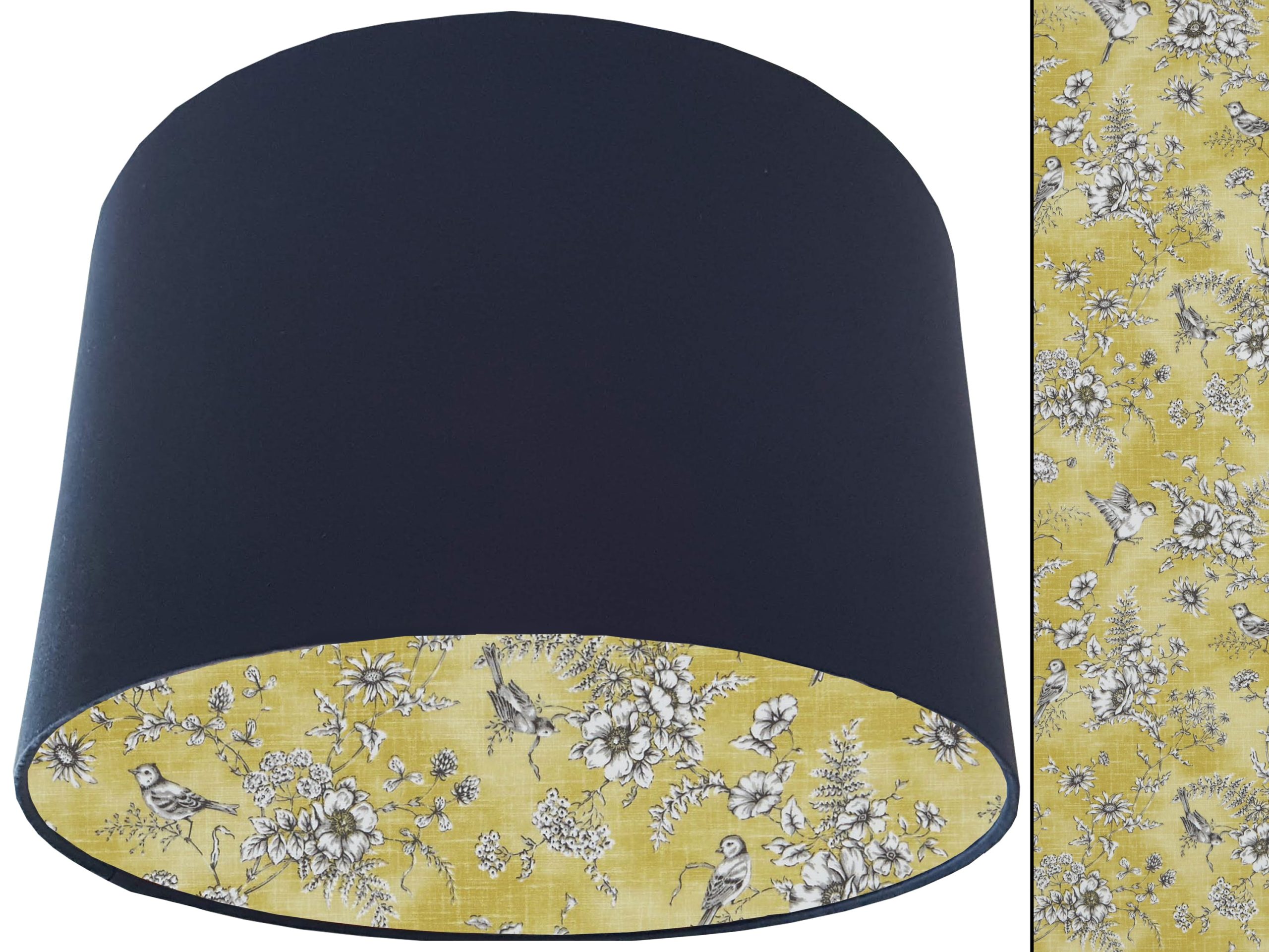 A stylish country style fabric makes this French toile yellow lampshade a perfect addition to your home interiors. Our lampshades are lined beautifully with a traditional bird & flower pattern on a yellow background. Paired with an outer cotton colour of your choosing, gives this French toile yellow lampshade an extra burst of colour and style.