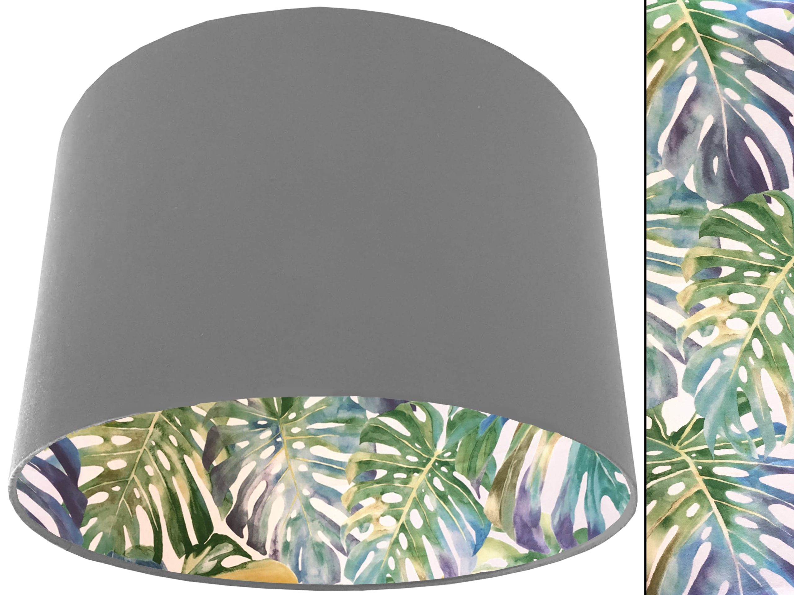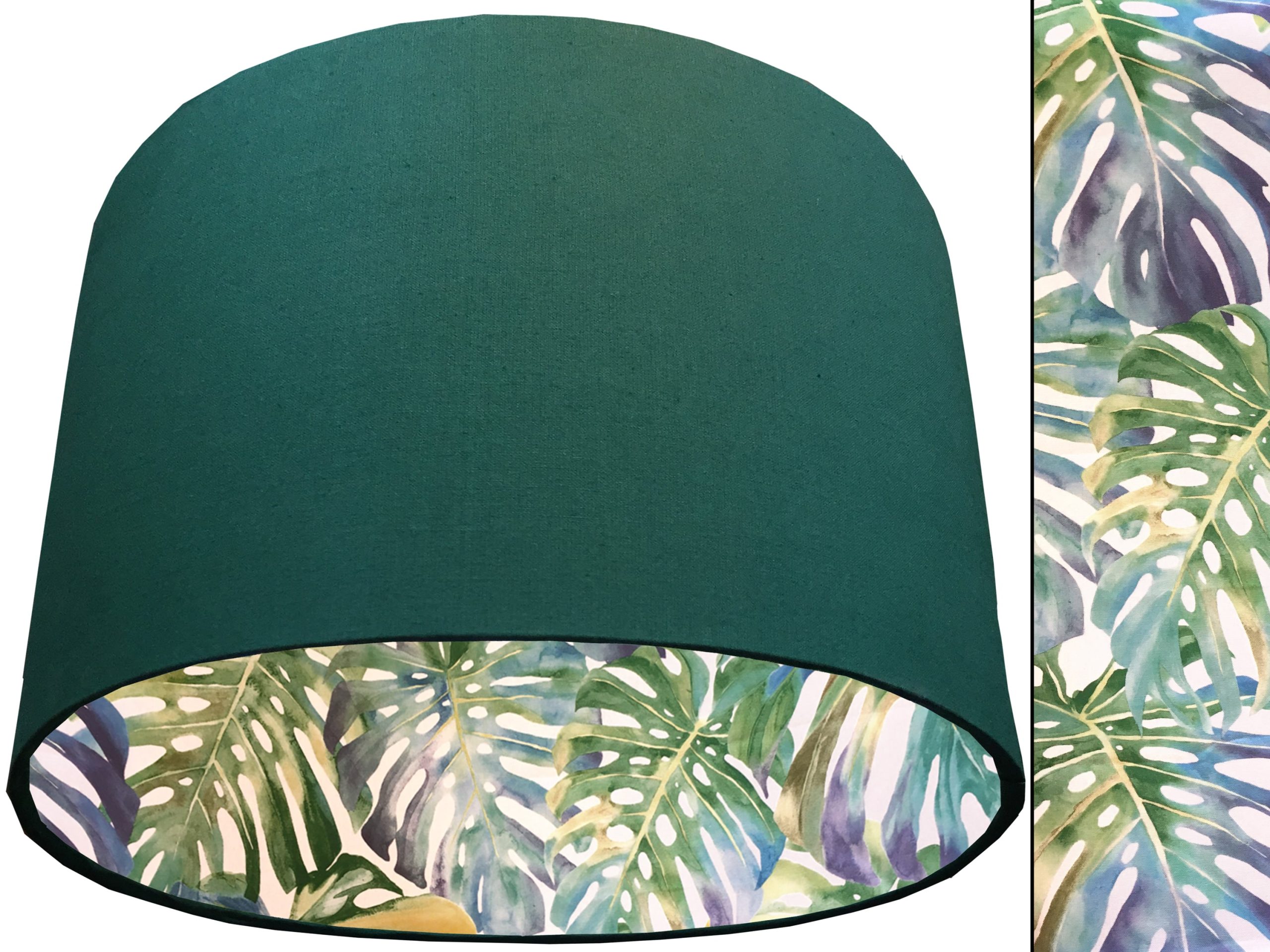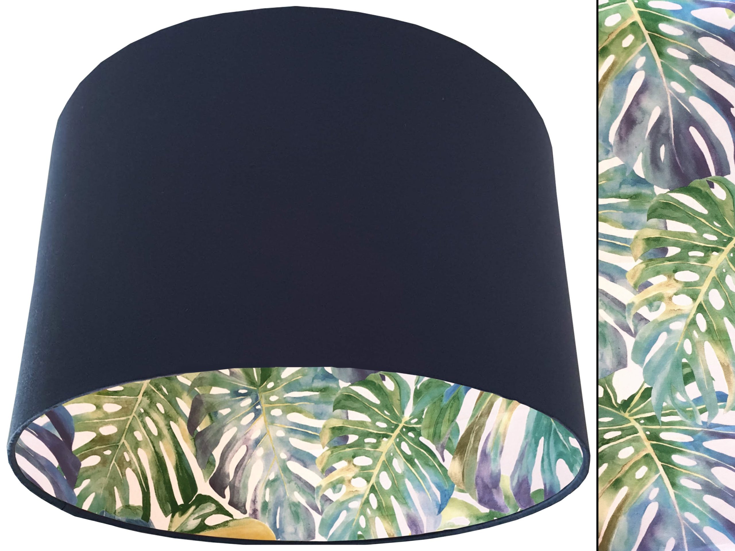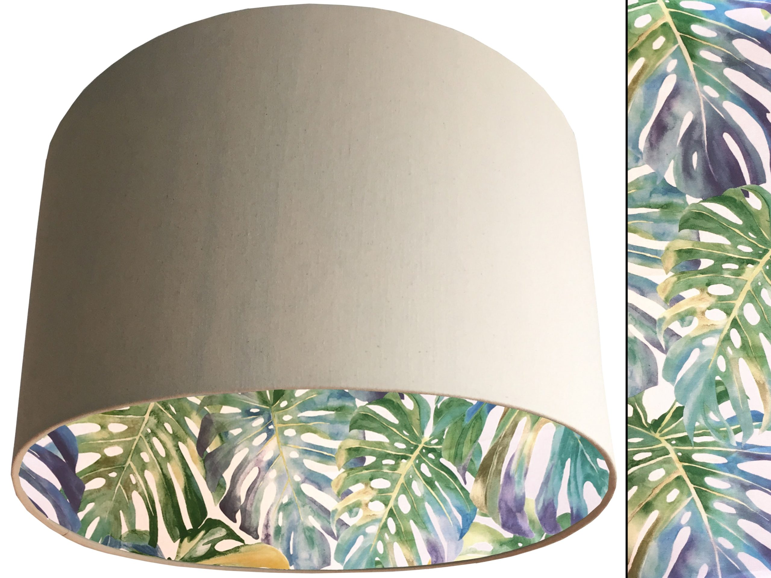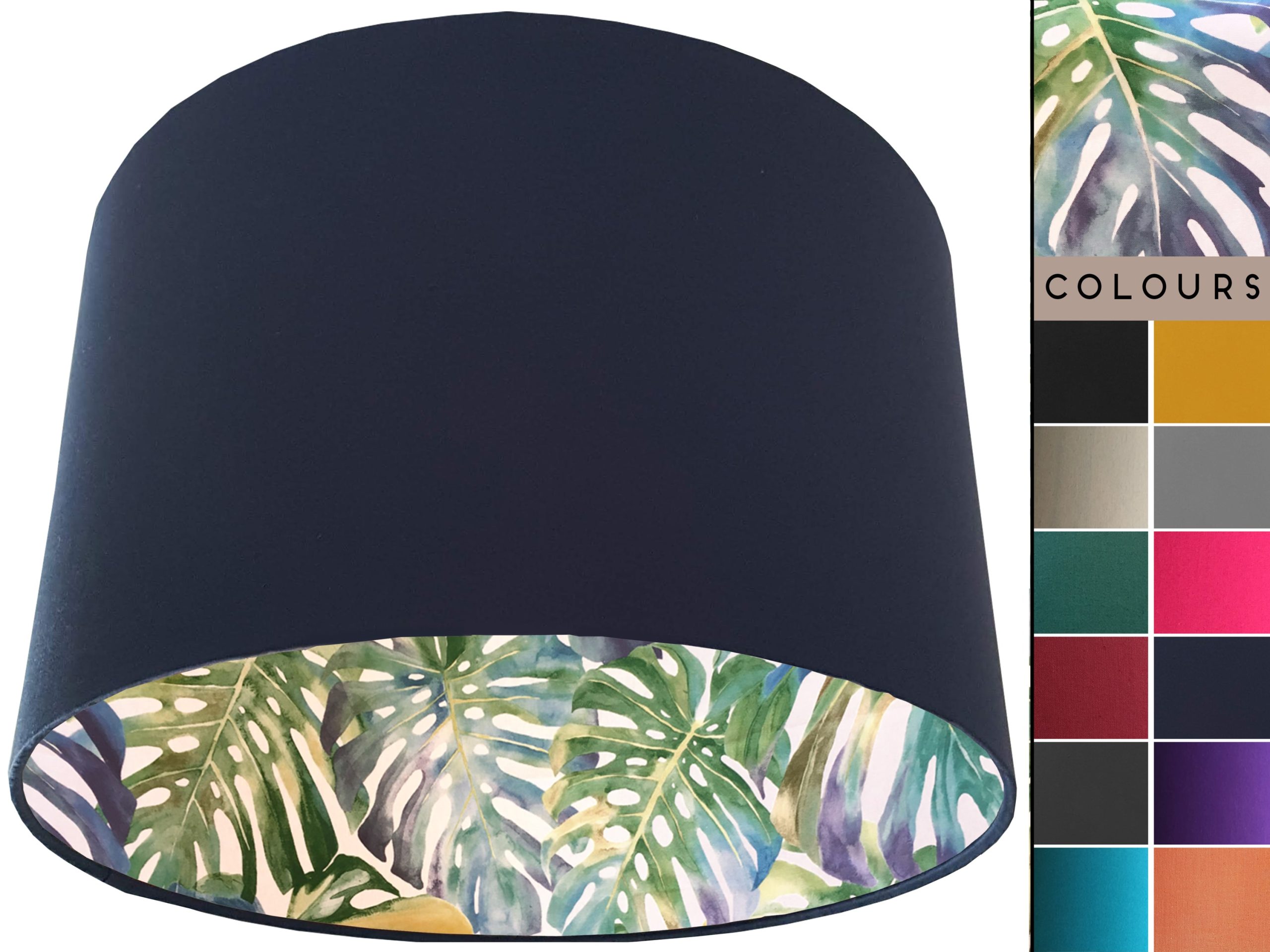 A beautiful mixture of palm leaves make this green palm leaf lampshade a stylish addition to your home interior. Our lampshades are carefully lined with a tropical leaf design feature pale green & blue coloured leaves which you can pair with an outer cotton colour of your choosing, giving this green palm leaf lampshade an extra burst of colour and style.