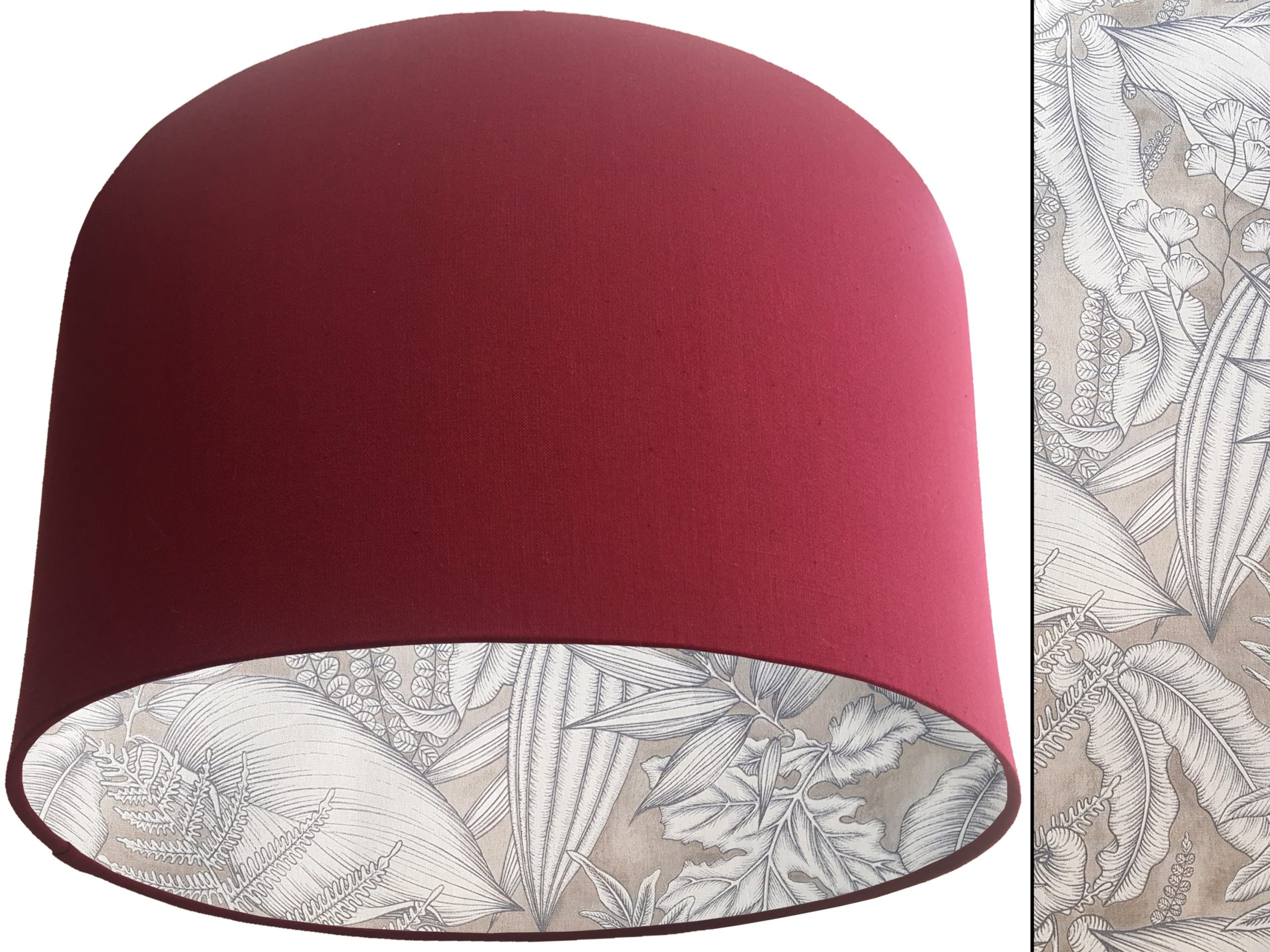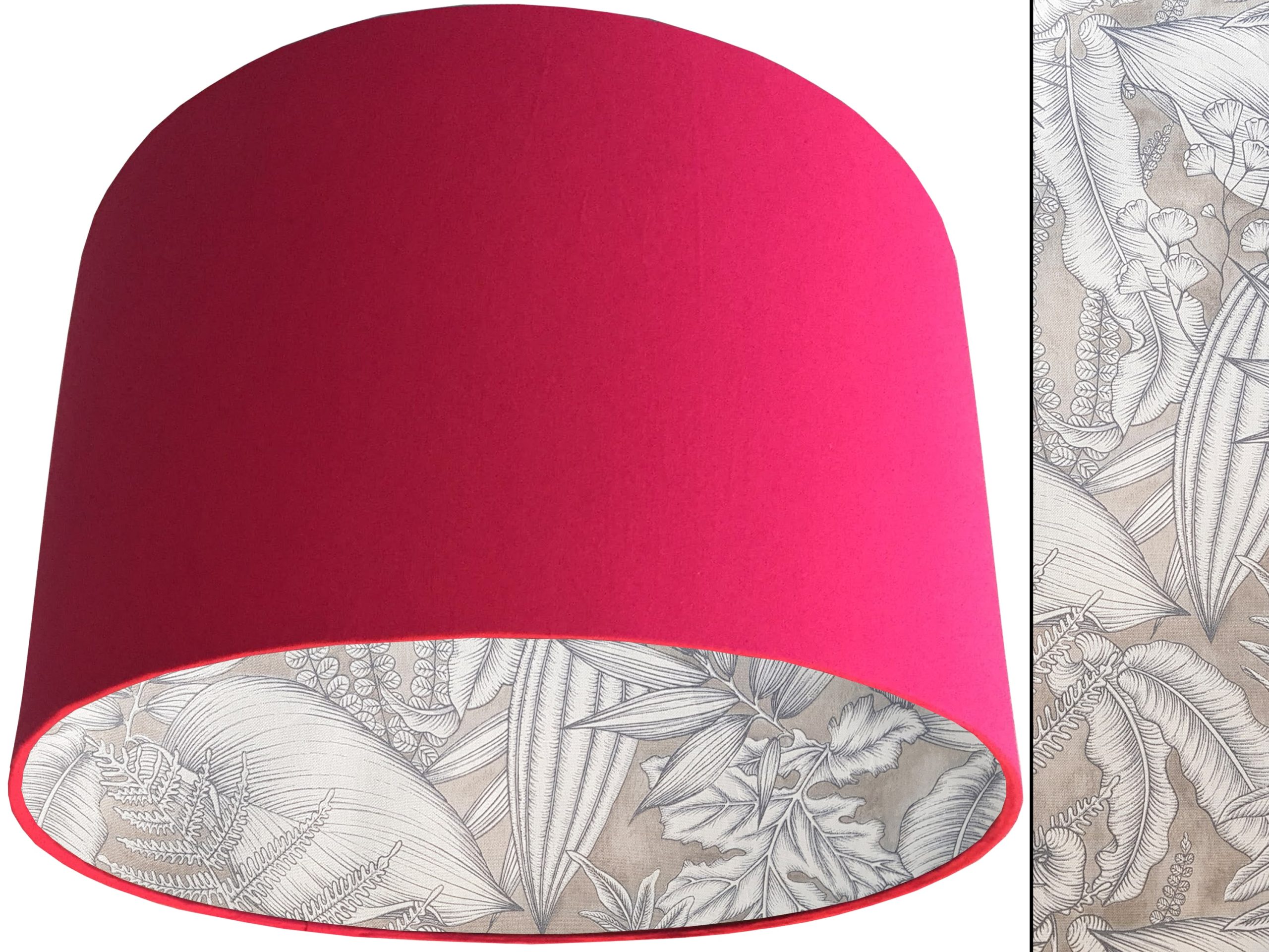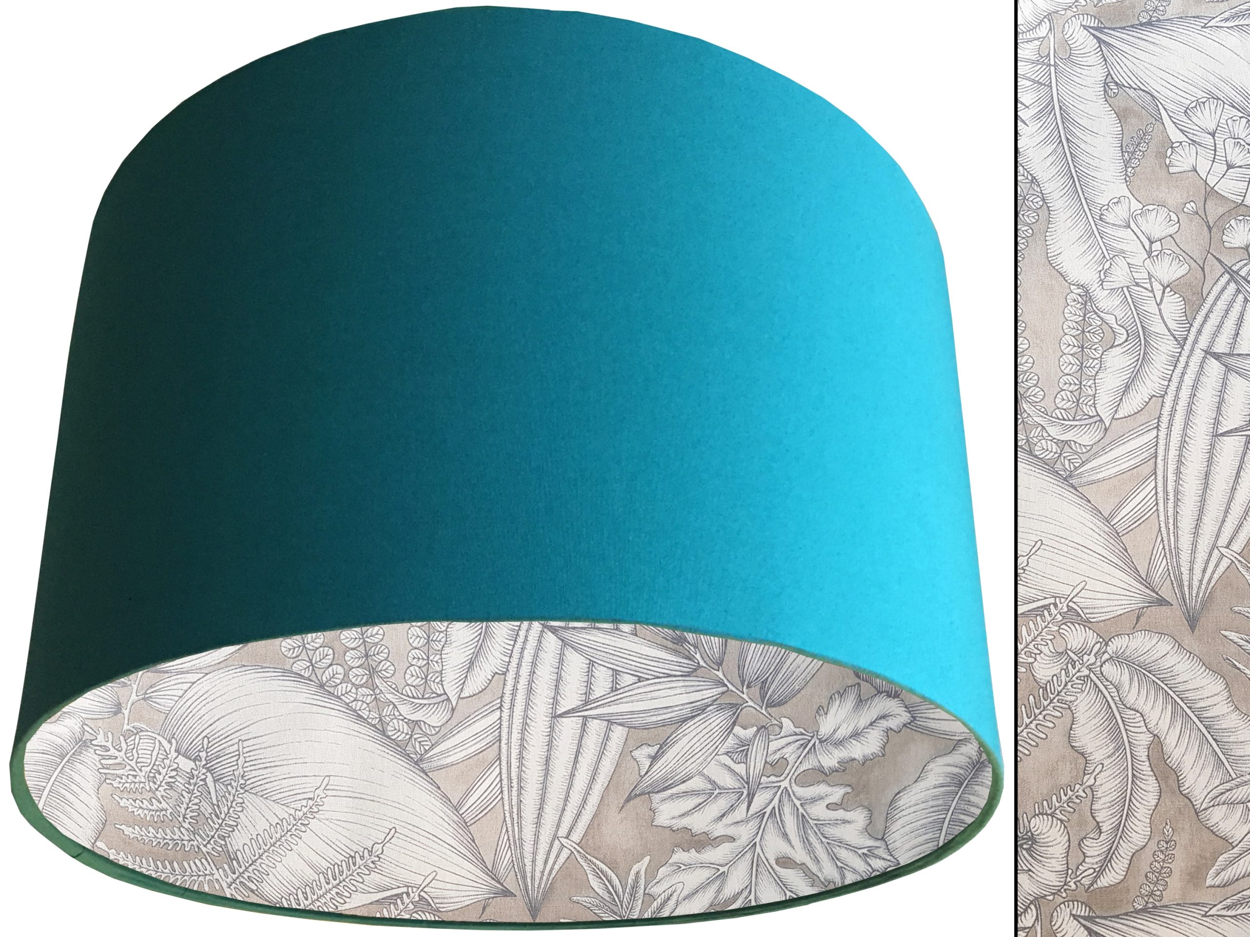 A stylish tropical leaf print fabric make this grey tropical lampshade a beautiful addition to any modern home interior. Our lampshades are beautifully lined with an exotic leaf print fabric featuring leaves in white with dark grey detailing, all on a light grey background. It is then paired with an outer cotton colour of your choosing, giving this grey tropical lampshade an extra splash of colour and style.