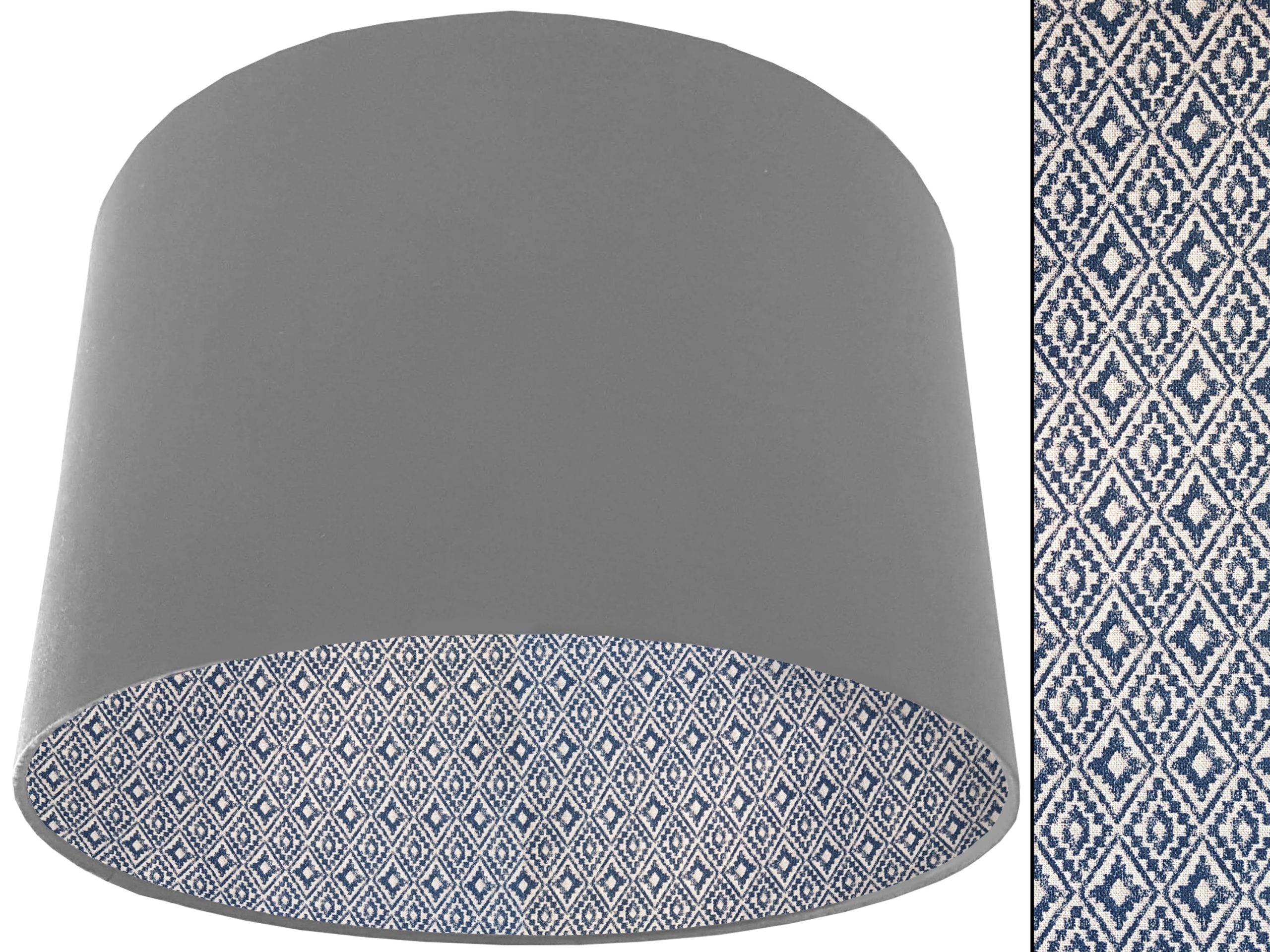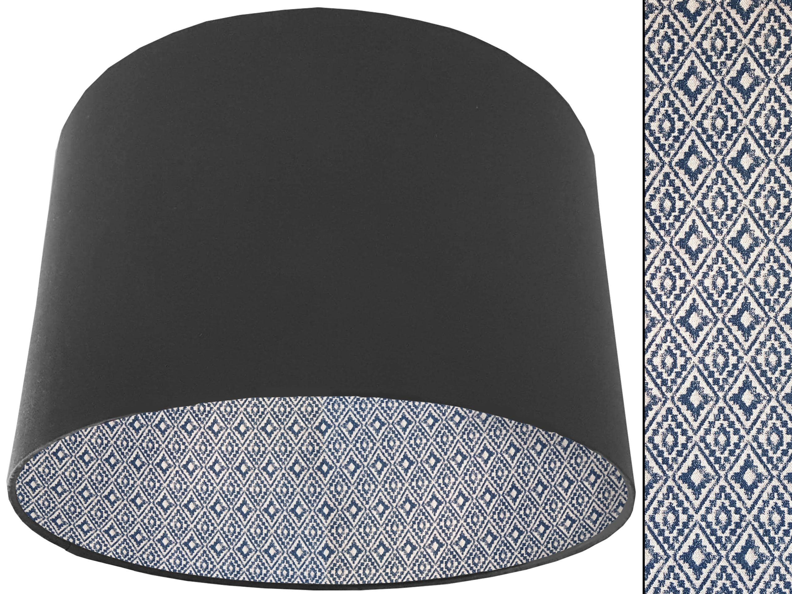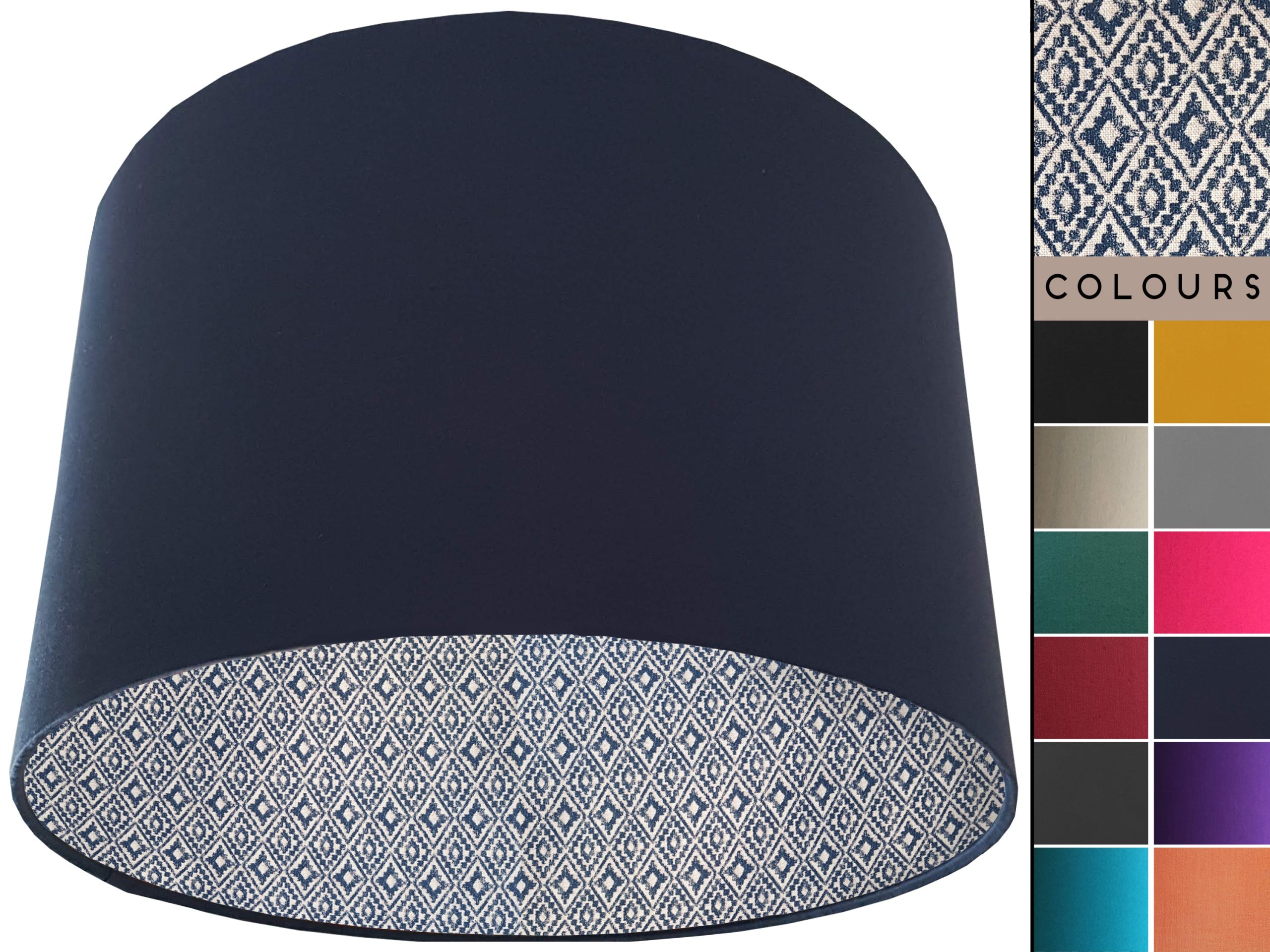 A modern geometric print makes this Navajo blue lampshade a stylish addition to your home interior. Our lampshades are gorgeously lined with a Native American inspired print of stylised diamonds in dark blue on a white background. It can be paired with an outer cotton colour of your choosing, giving this Navajo blue lampshade a bold, impressive look in any room.