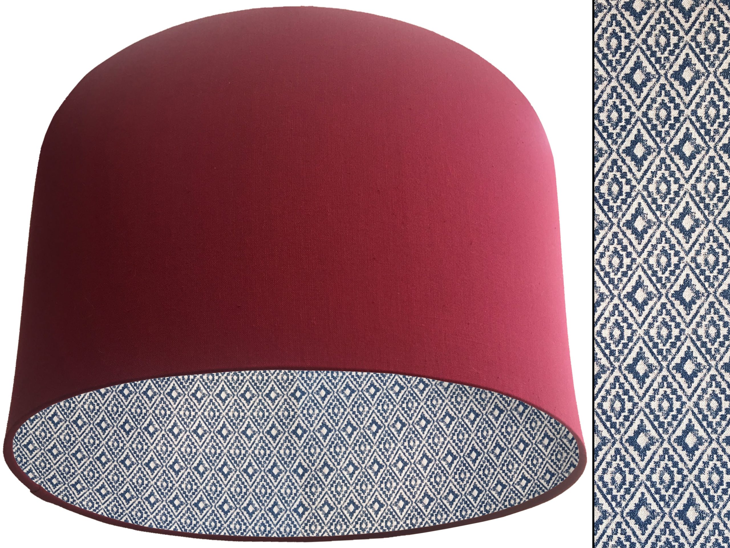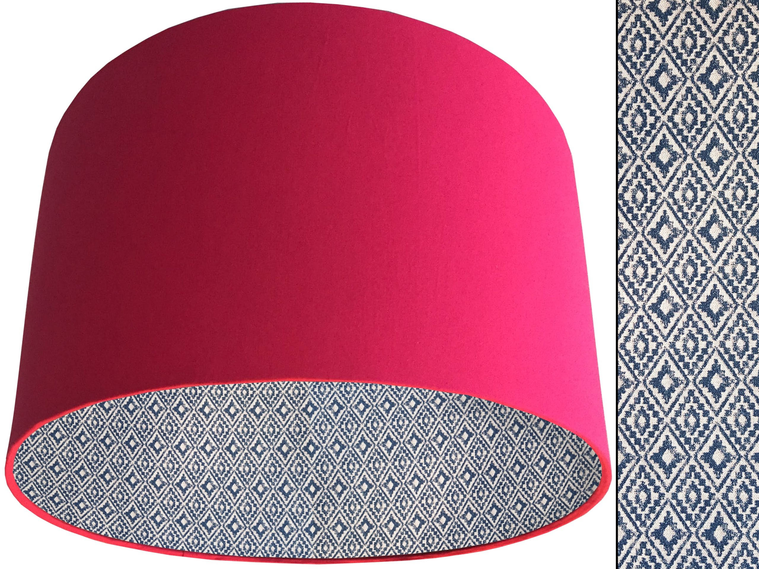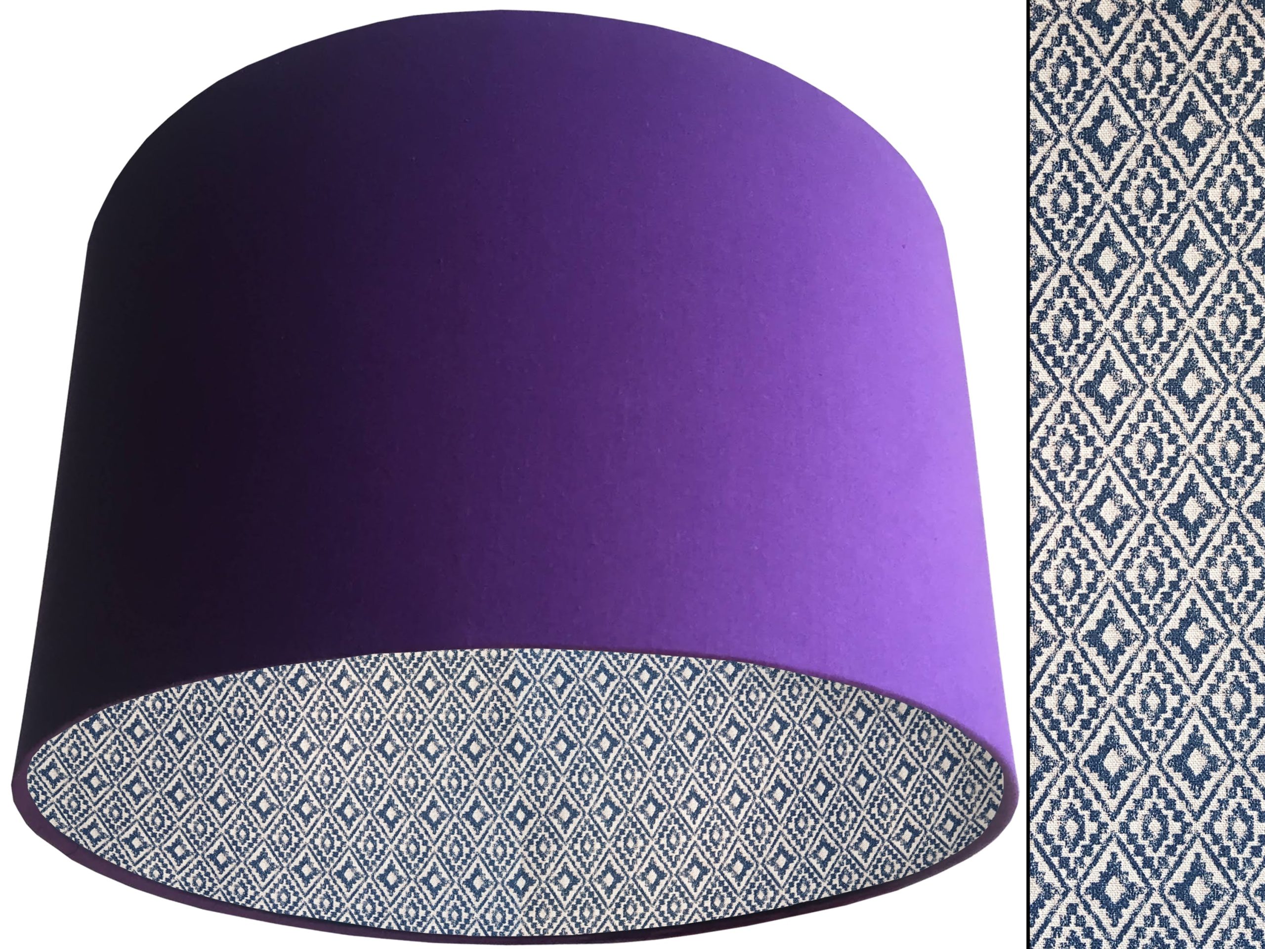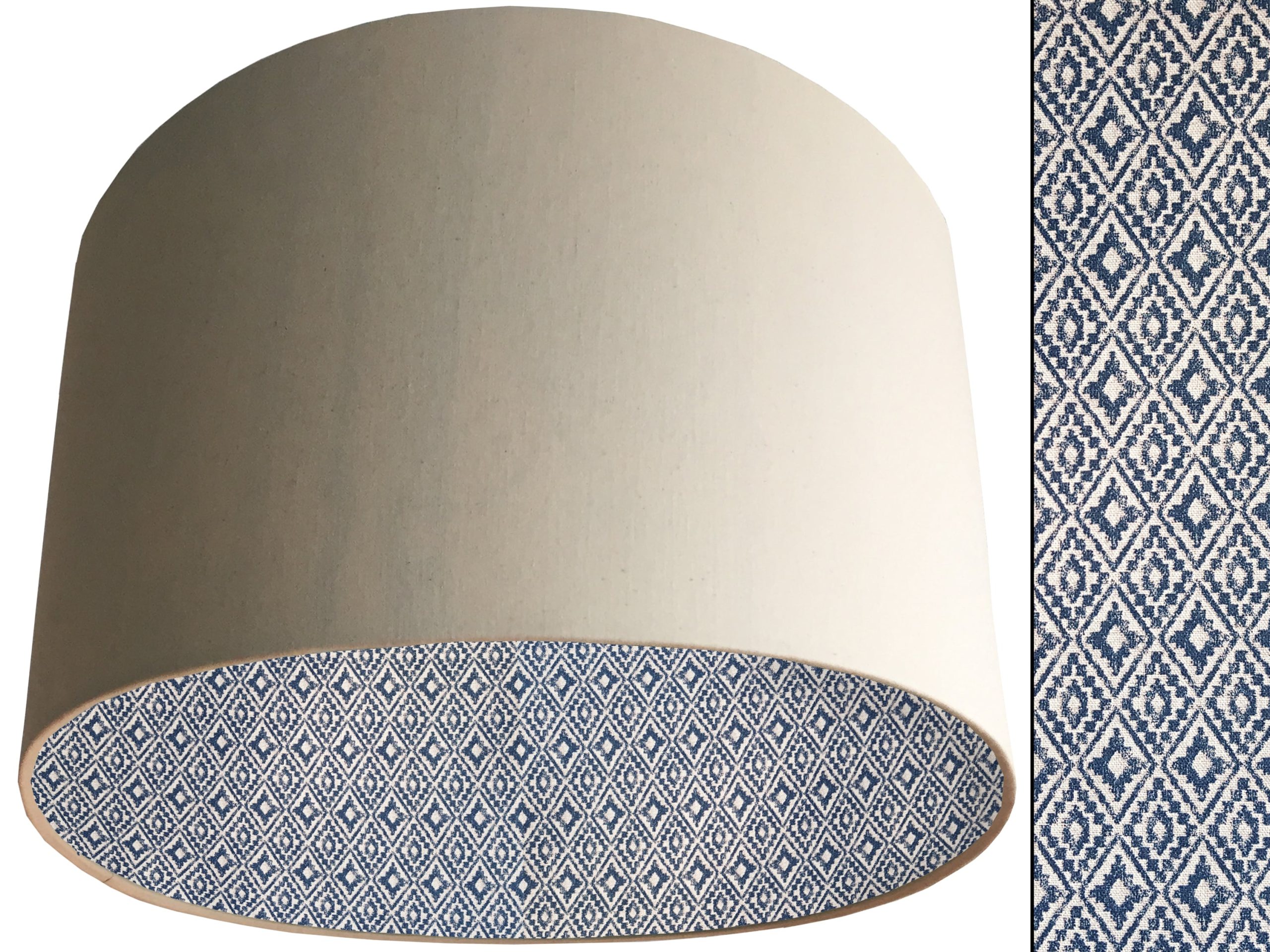 A modern geometric print makes this Navajo blue lampshade a stylish addition to your home interior. Our lampshades are gorgeously lined with a Native American inspired print of stylised diamonds in dark blue on a white background. It can be paired with an outer cotton colour of your choosing, giving this Navajo blue lampshade a bold, impressive look in any room.