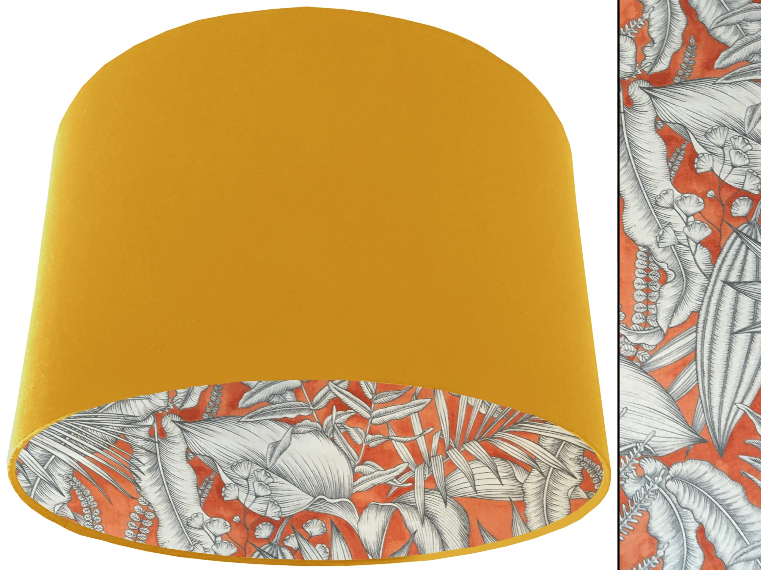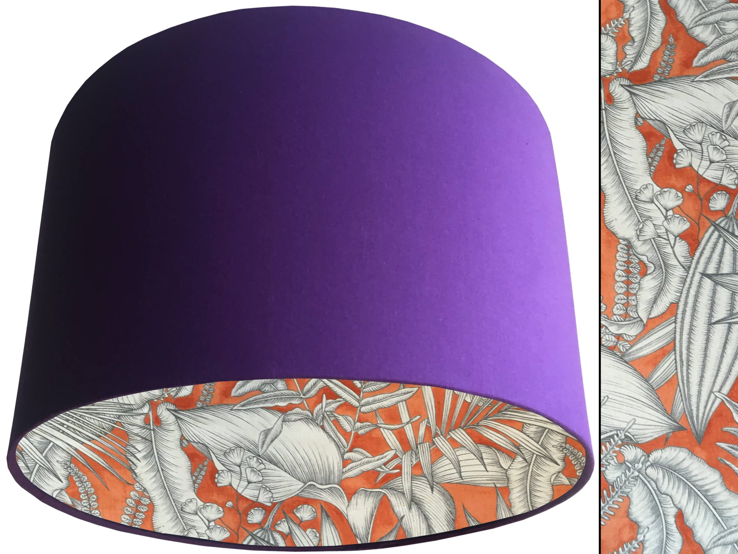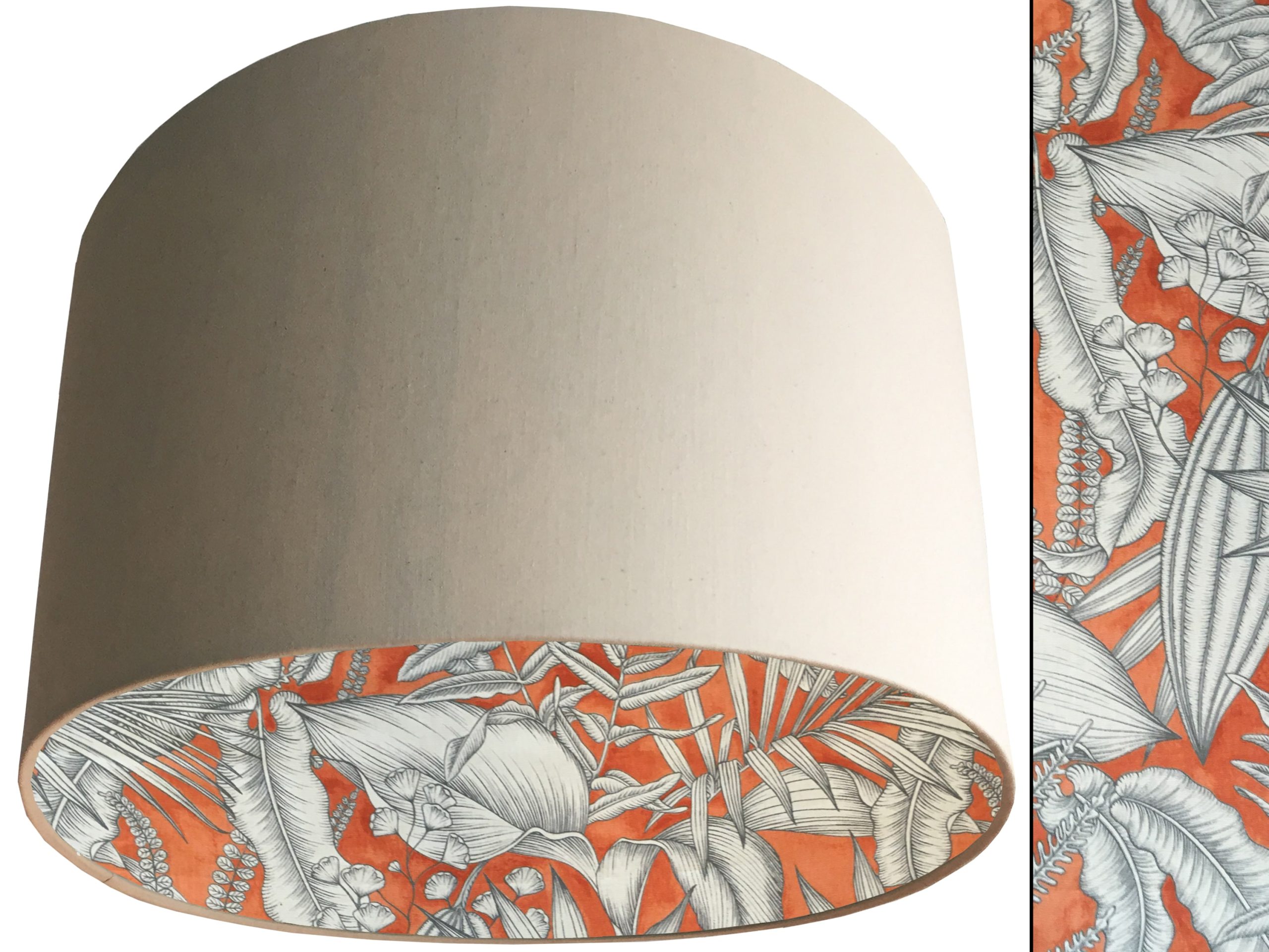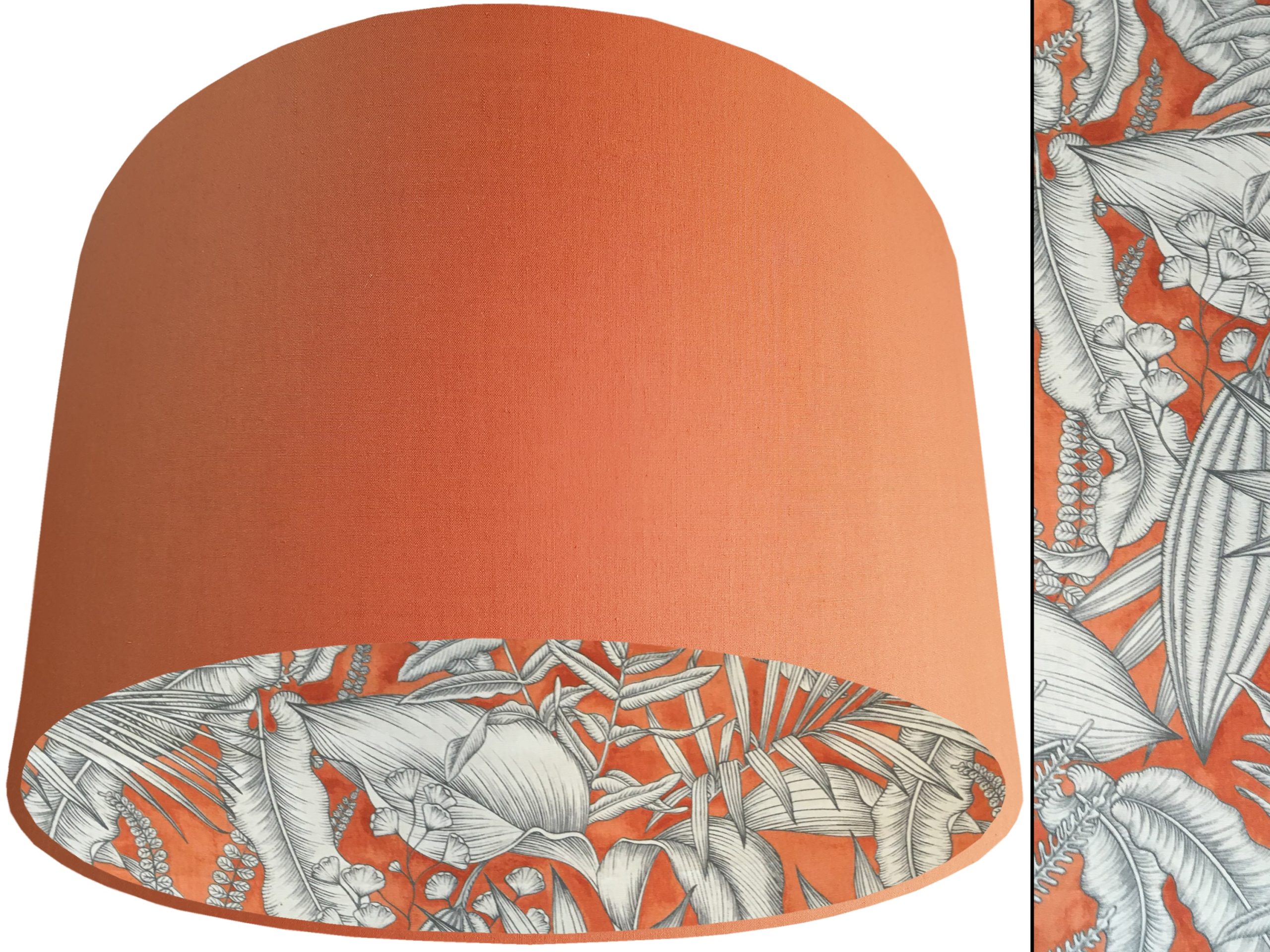 A stunning mixture of vibrant fern leaves make this orange tropical lampshade a vibrant addition to your home interior. Our lampshades are lined beautifully with a tropical orange design featuring white & grey topical leaves on an eye-catching burnt orange background. This can then be paired with an outer cotton colour of your choosing, giving this orange tropical lampshade an extra burst of colour and style.