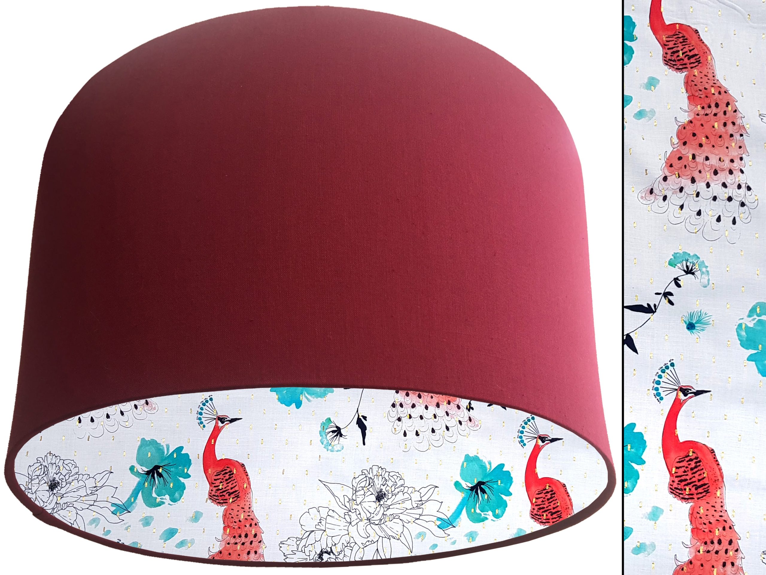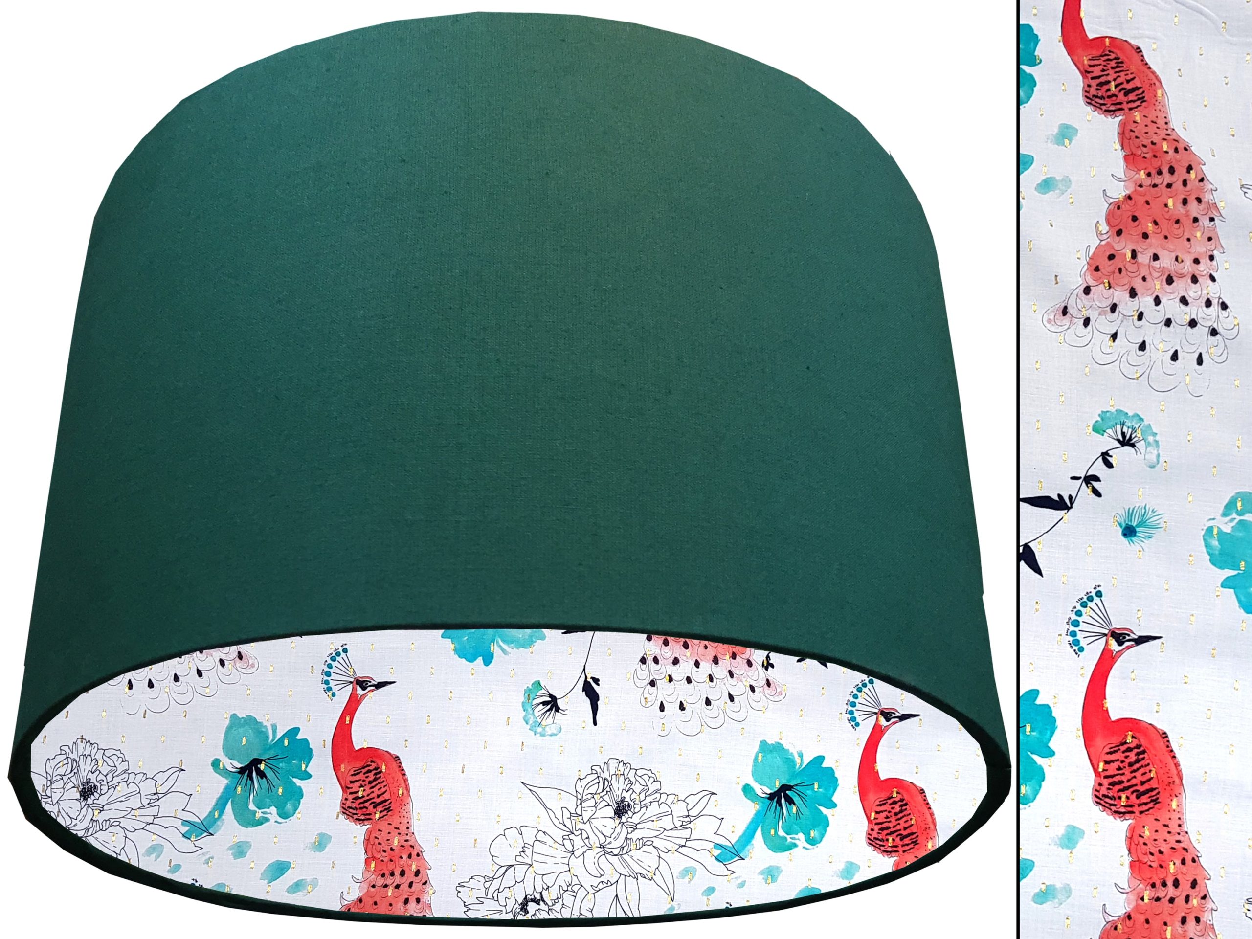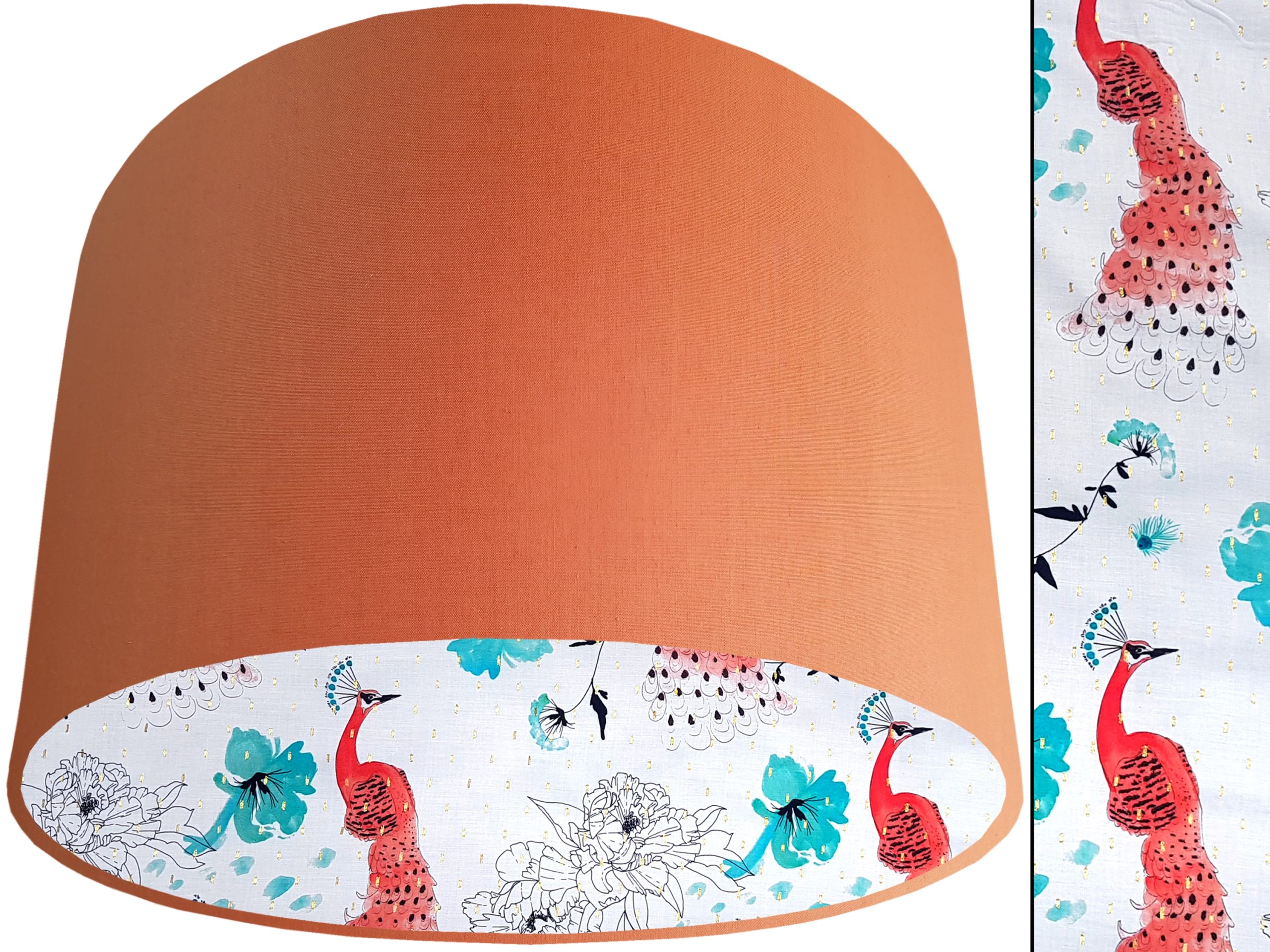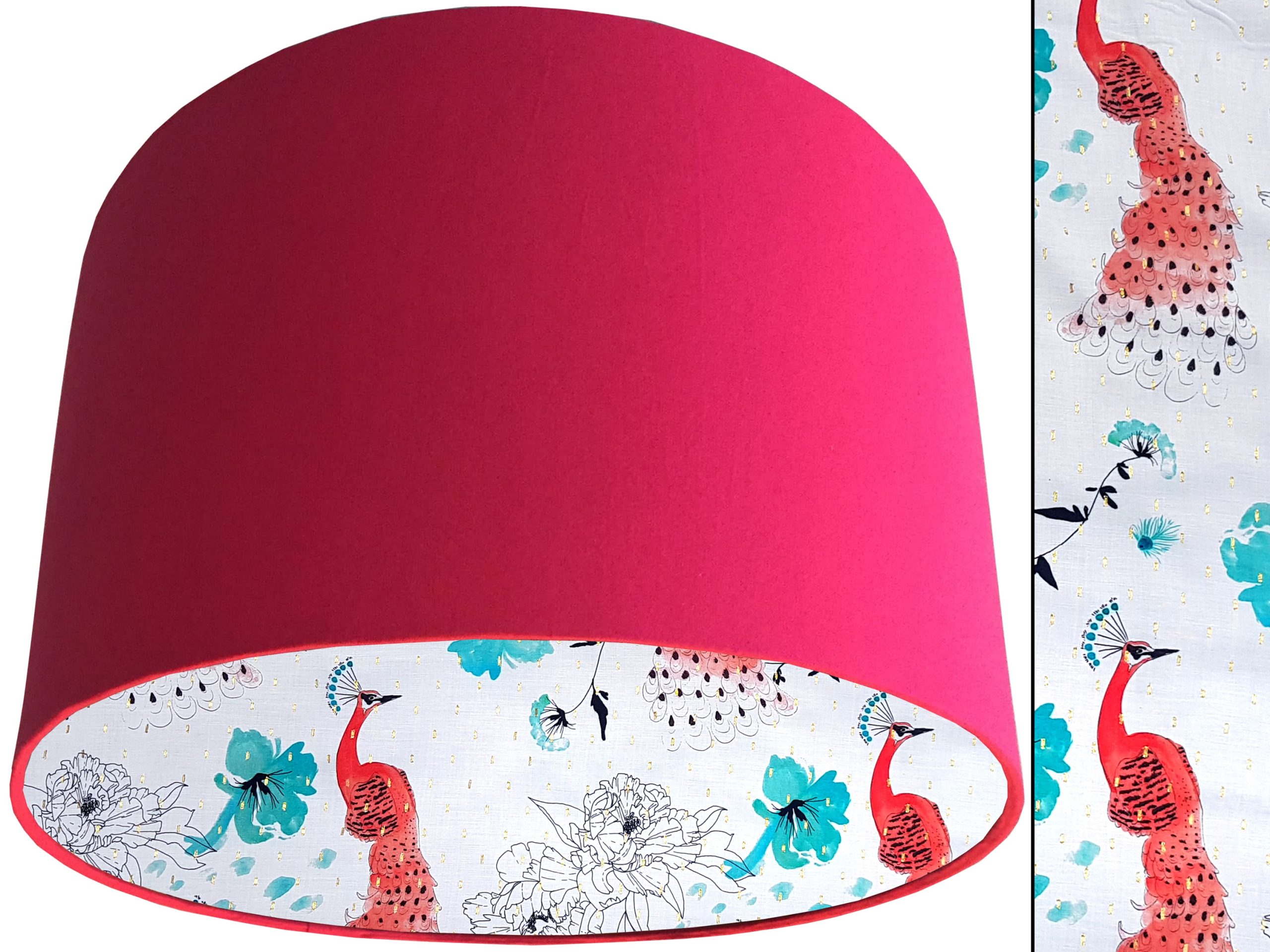 A stunning modern country fabric makes this pink peacock lampshade a stylish addition to your colourful home interior. Our lampshades are lined beautifully with an eye-catching design featuring pink peacocks, white & teal flowers with golden flecks throughout adding a beautiful pop of colour to the design. This is then paired with an outer cotton colour of your choosing, ensuring this pink peacock lampshade will make a statement in your home.