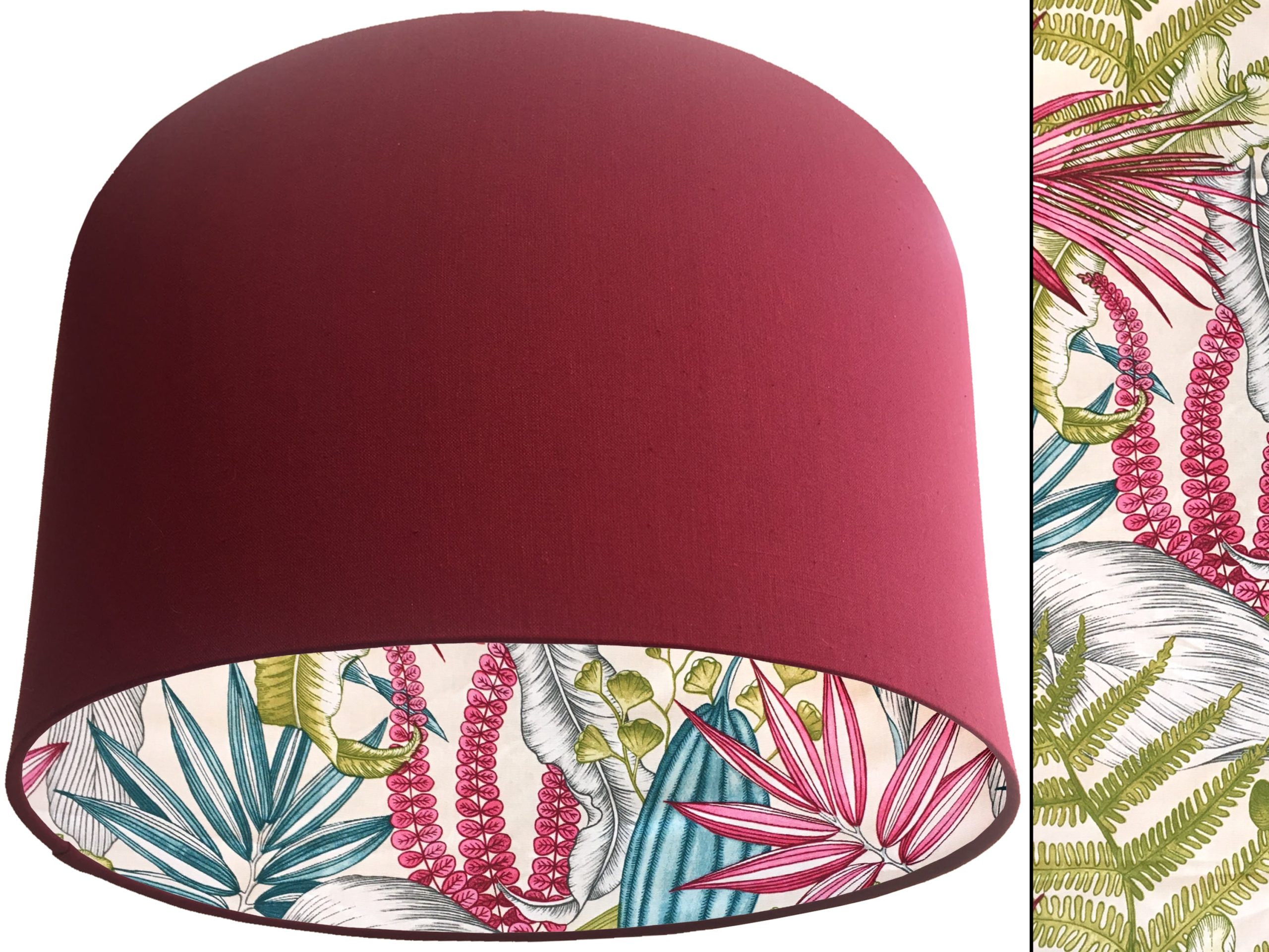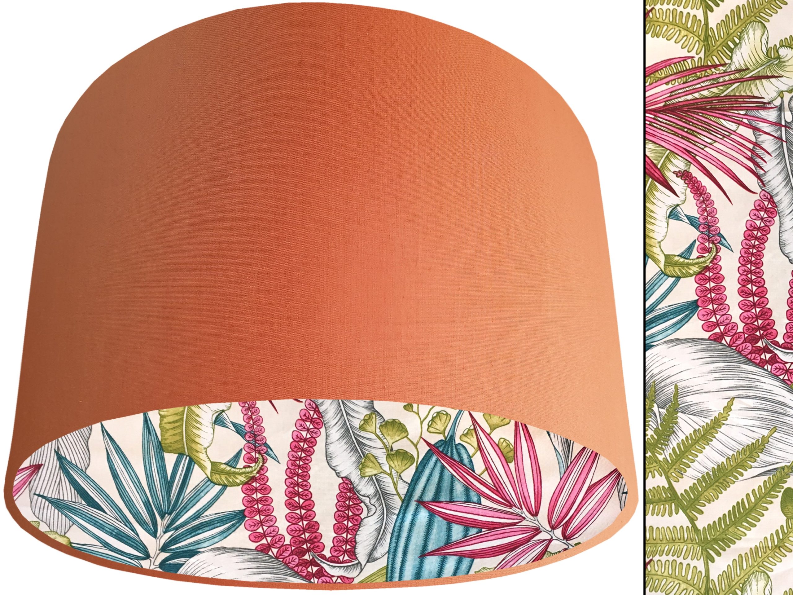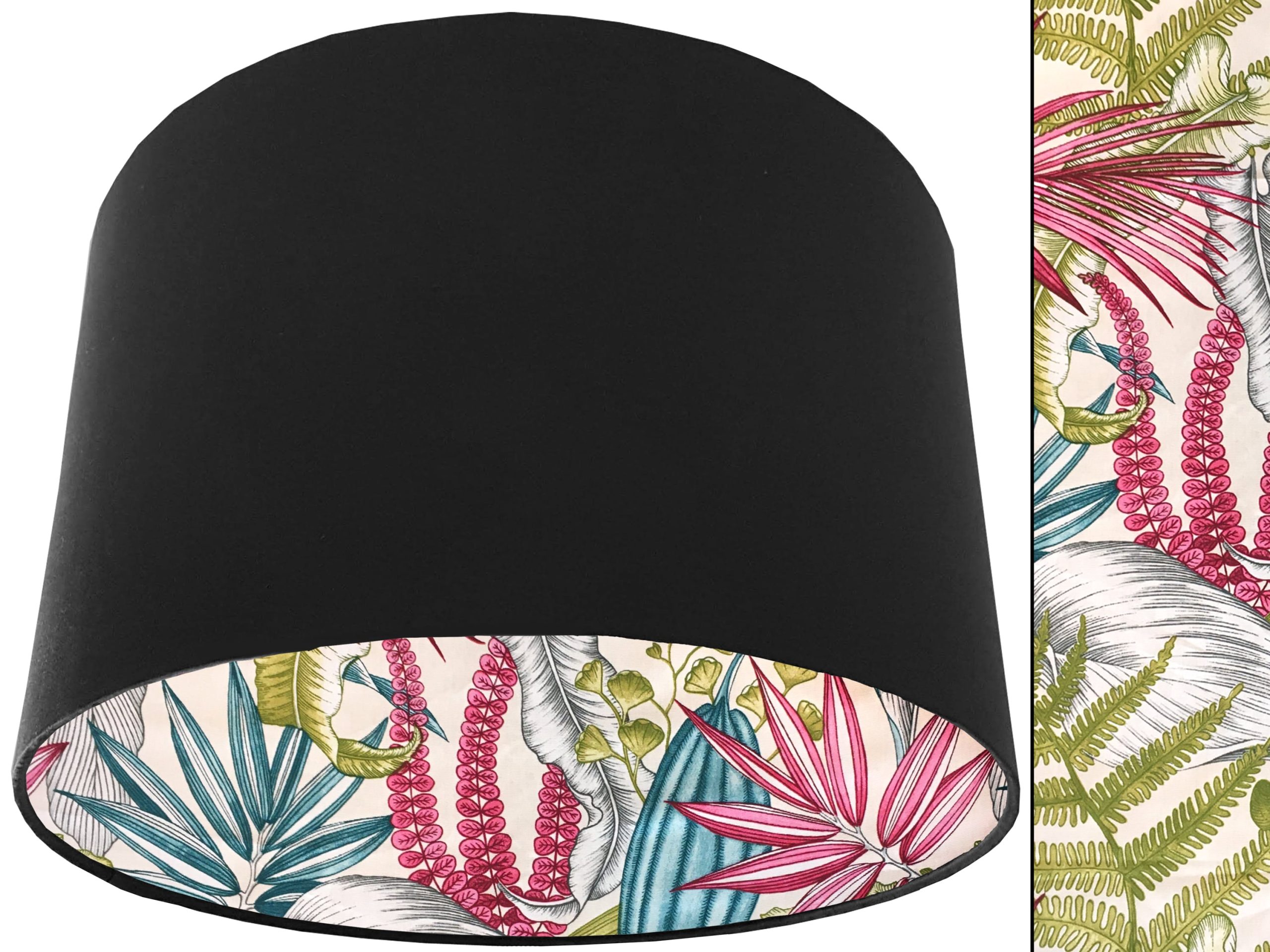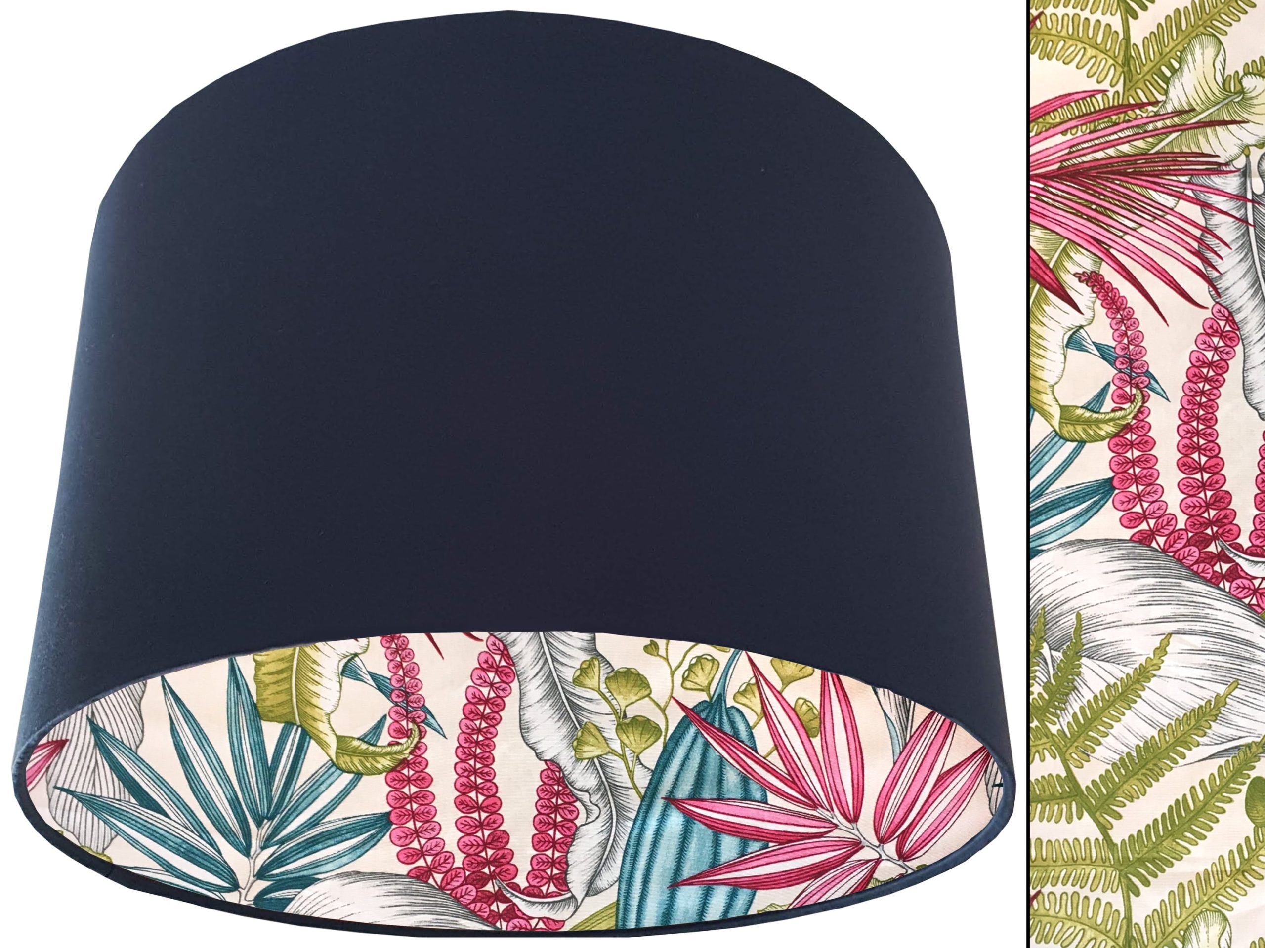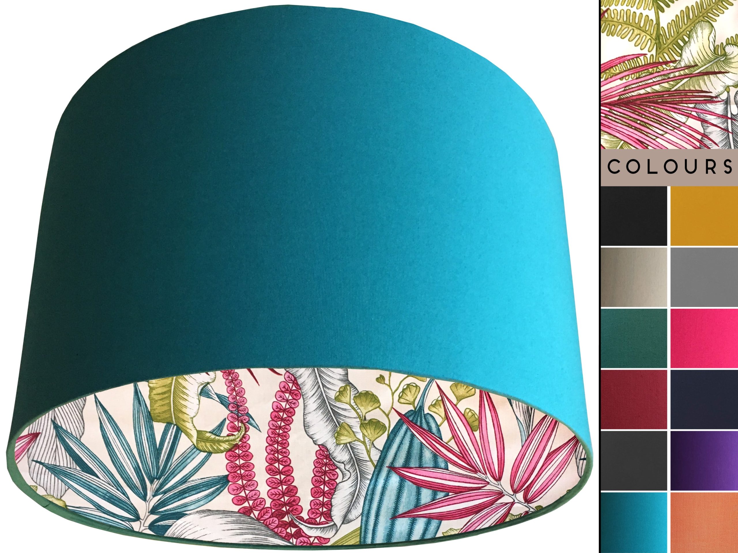 An eye-catching mixture of vibrant exotic leaves makes this white tropical pink lampshade a colourful addition to any modern home interior. Our lampshades are lined beautifully with a tropical design featuring tropical leaves in bold pink, blue, and green tones, all on a white background to allow the colours to burst off the fabric. This can then be paired with an outer cotton colour of your choosing, ensuring this lampshade will complement any home décor and become a stylish focal point for your room.