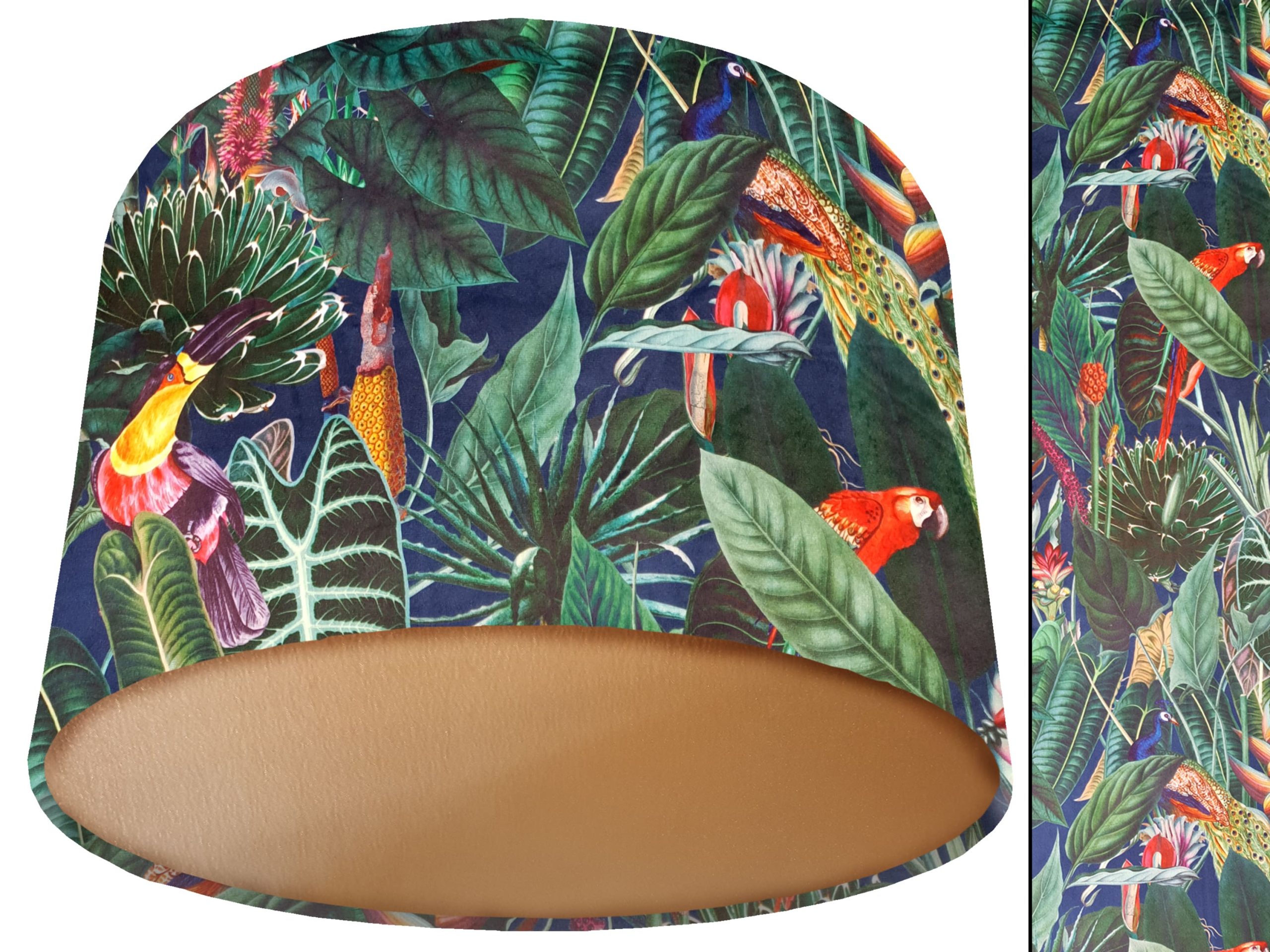 Our blue birds velvet lampshade combines a luxurious patterned velvet exterior with a satin shimmer copper or gold lining. Ideal for adding copper or gold accents into your home décor. The stunning design features a deep rich blue background with green jungle leaf print with colourful flowers and exotic birds, such as parrots and toucans, hidden throughout.