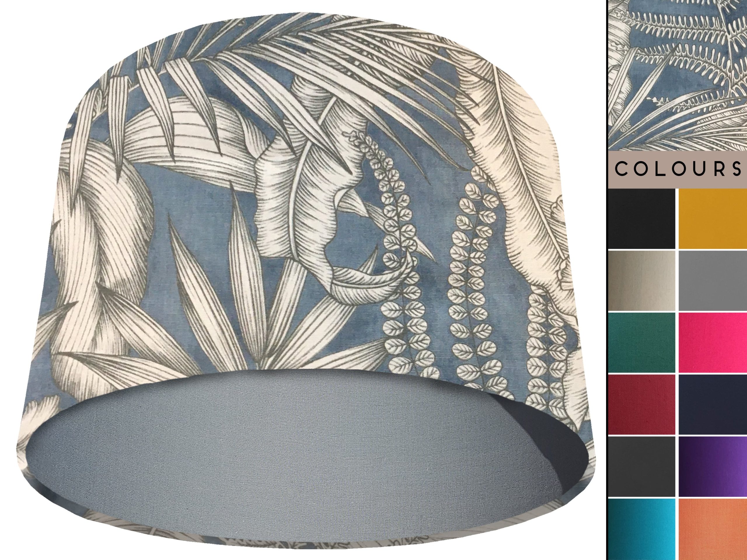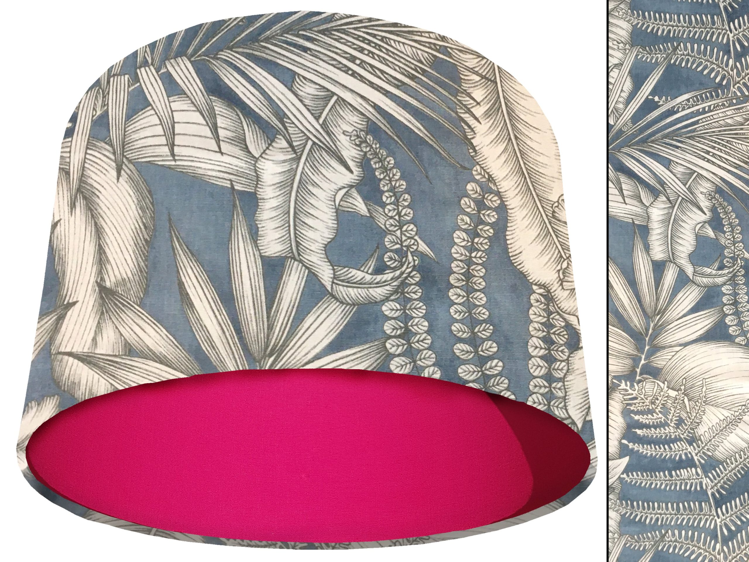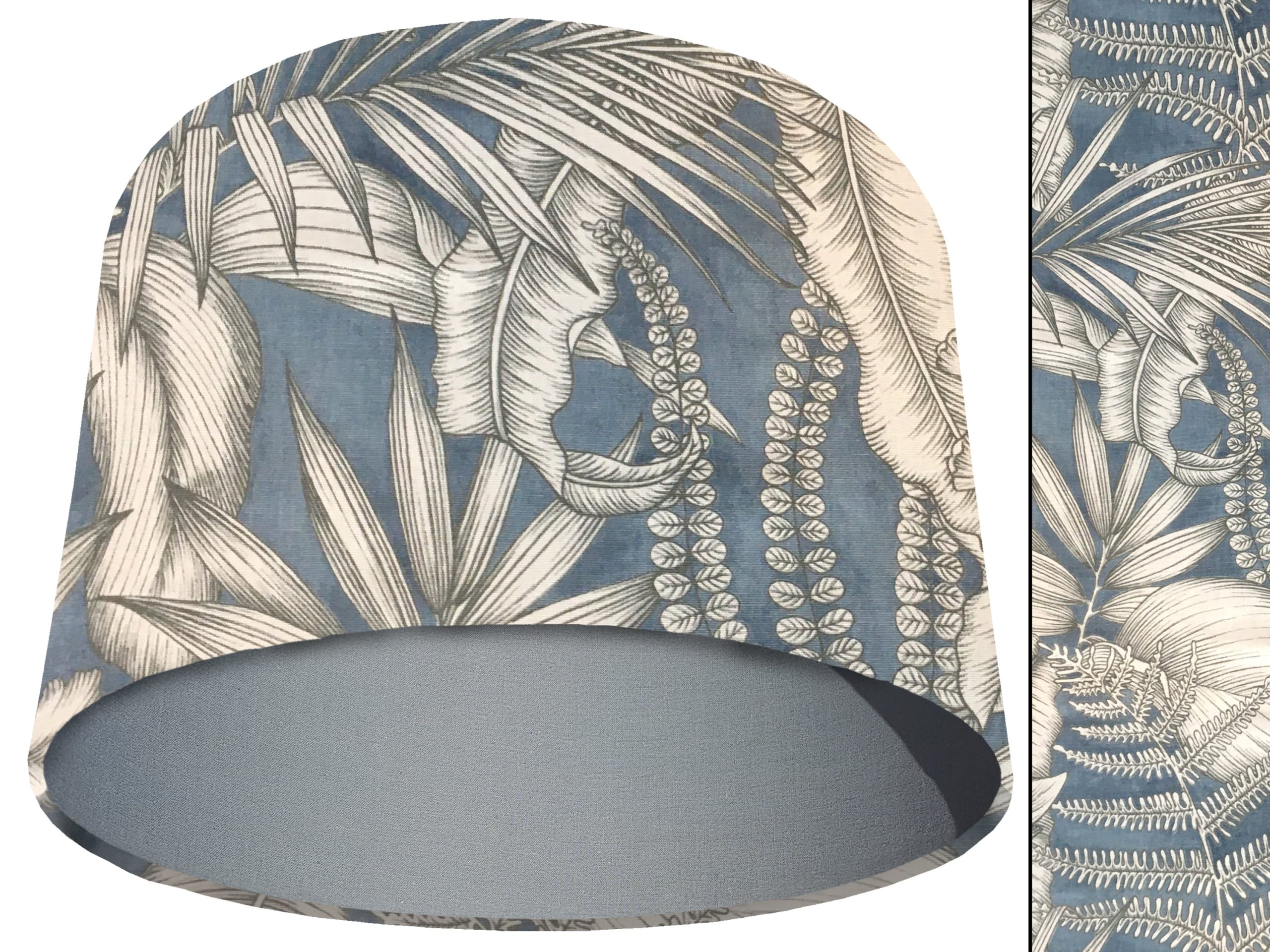 A gorgeous modern tropical fabric make this blue tropical light shade a stunning addition to your contemporary home interiors. Our light shades feature a stylish outer of a tropical design with grey & white leaves on a blue background. When paired with solid cotton colour lining of your choosing, this blue tropical light shade will create a statement in any room.
