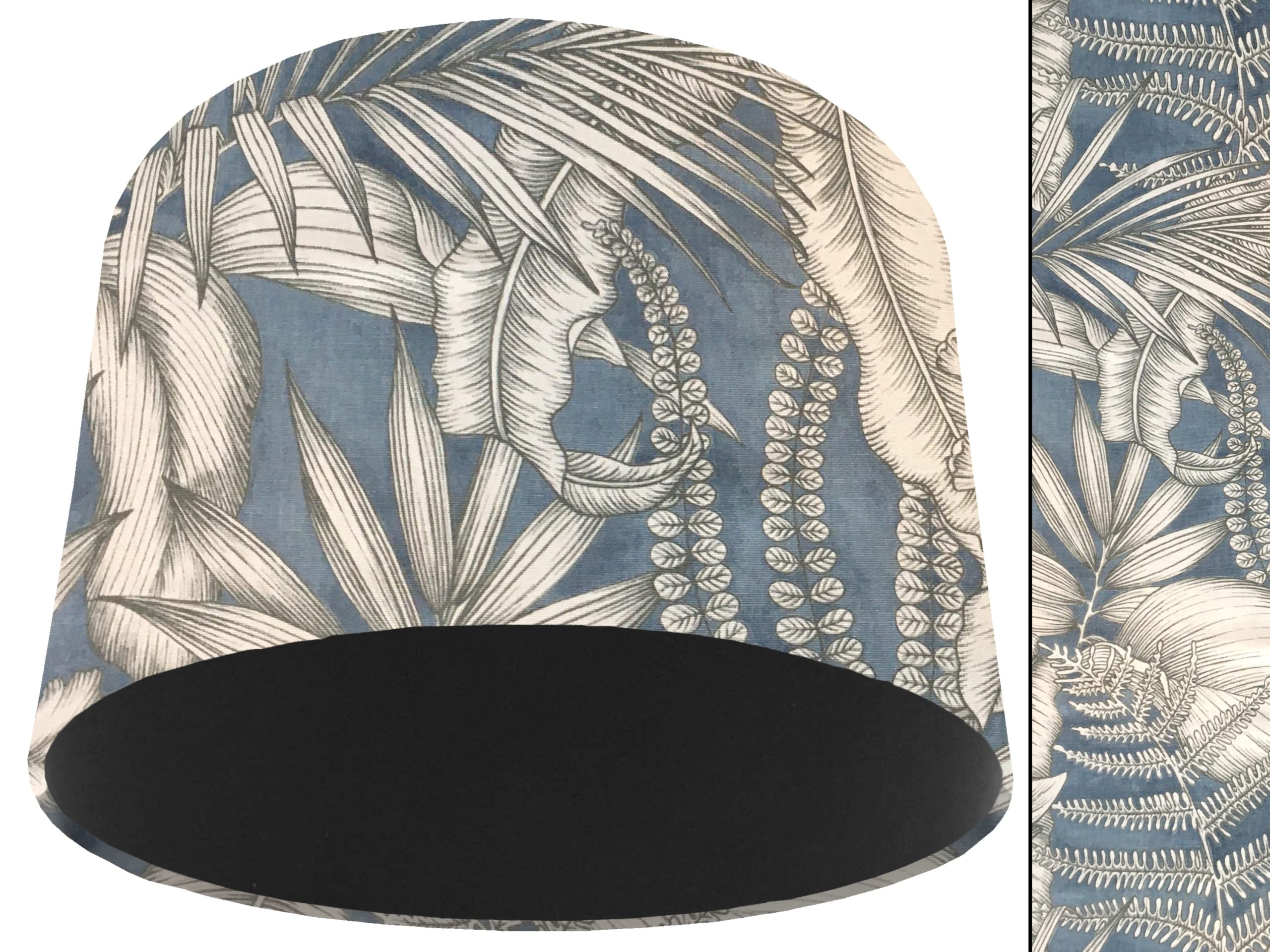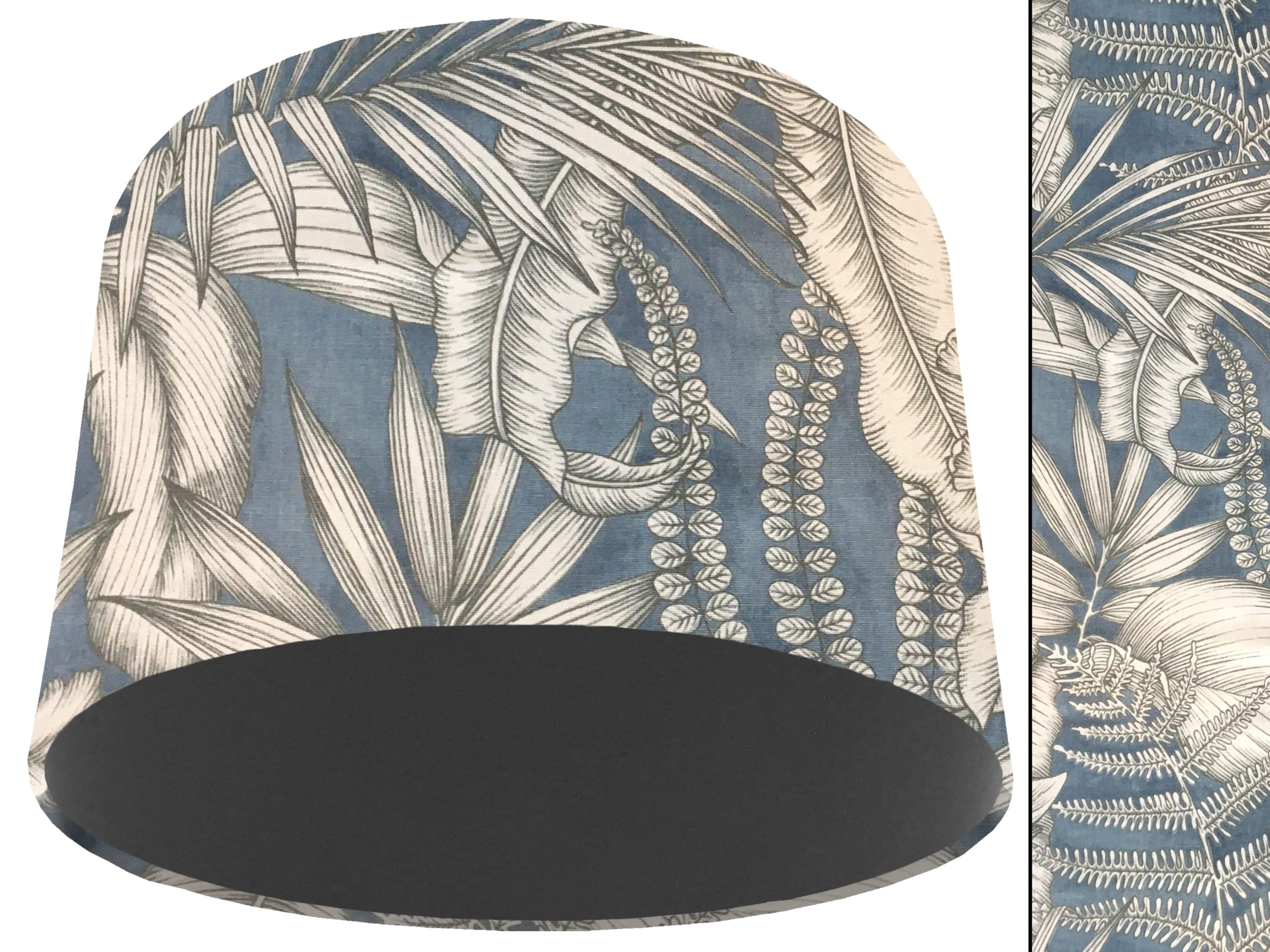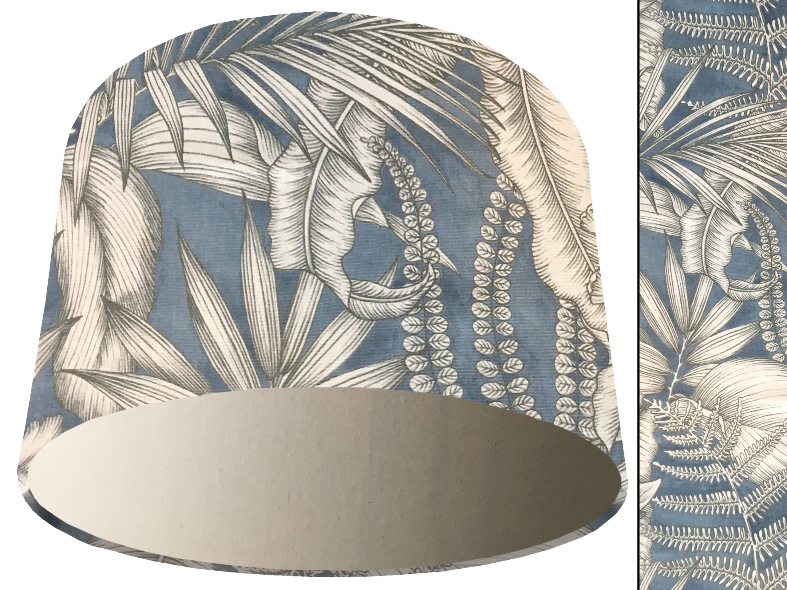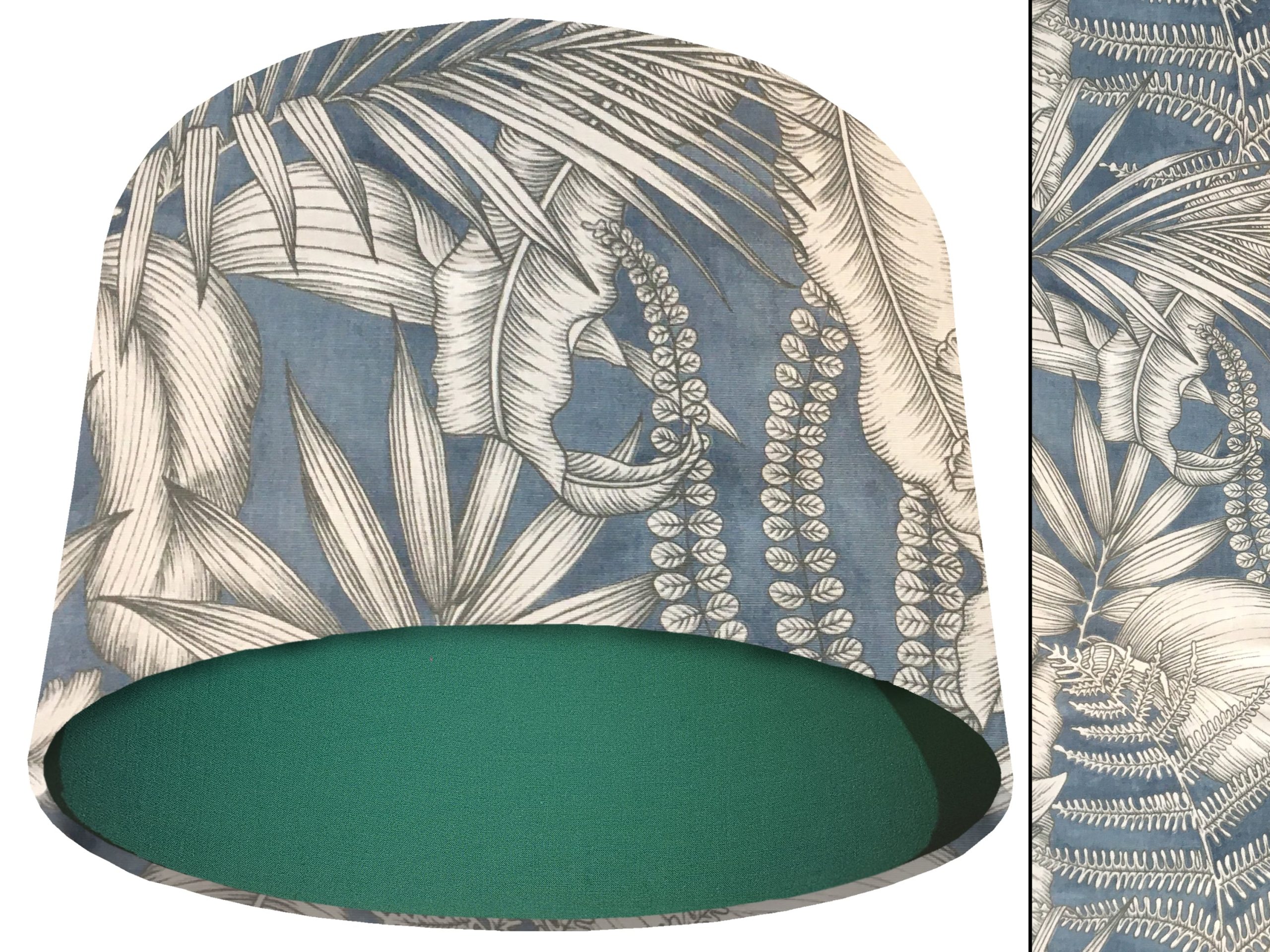 A gorgeous modern tropical fabric make this blue tropical light shade a stunning addition to your contemporary home interiors. Our light shades feature a stylish outer of a tropical design with grey & white leaves on a blue background. When paired with solid cotton colour lining of your choosing, this blue tropical light shade will create a statement in any room.