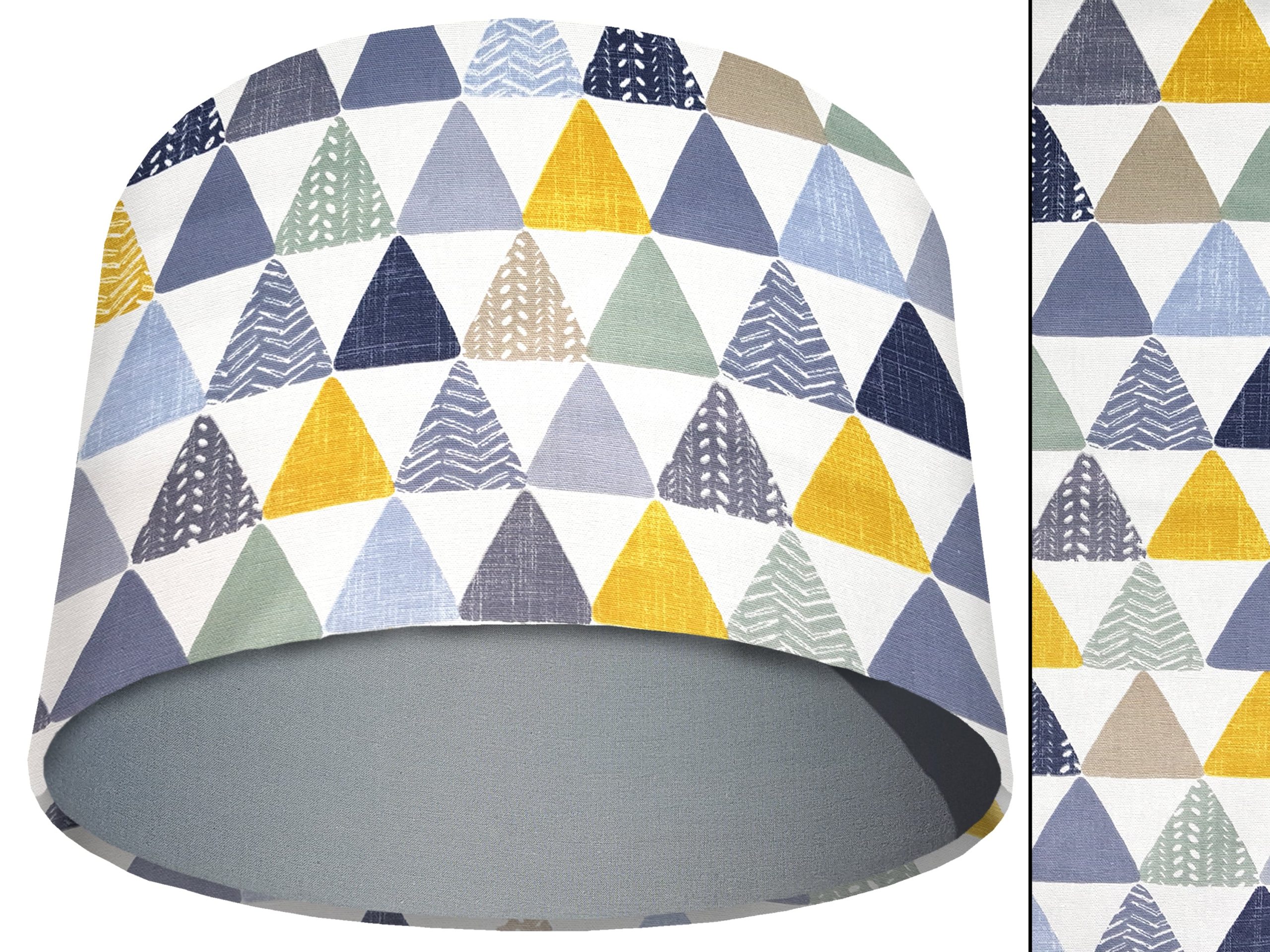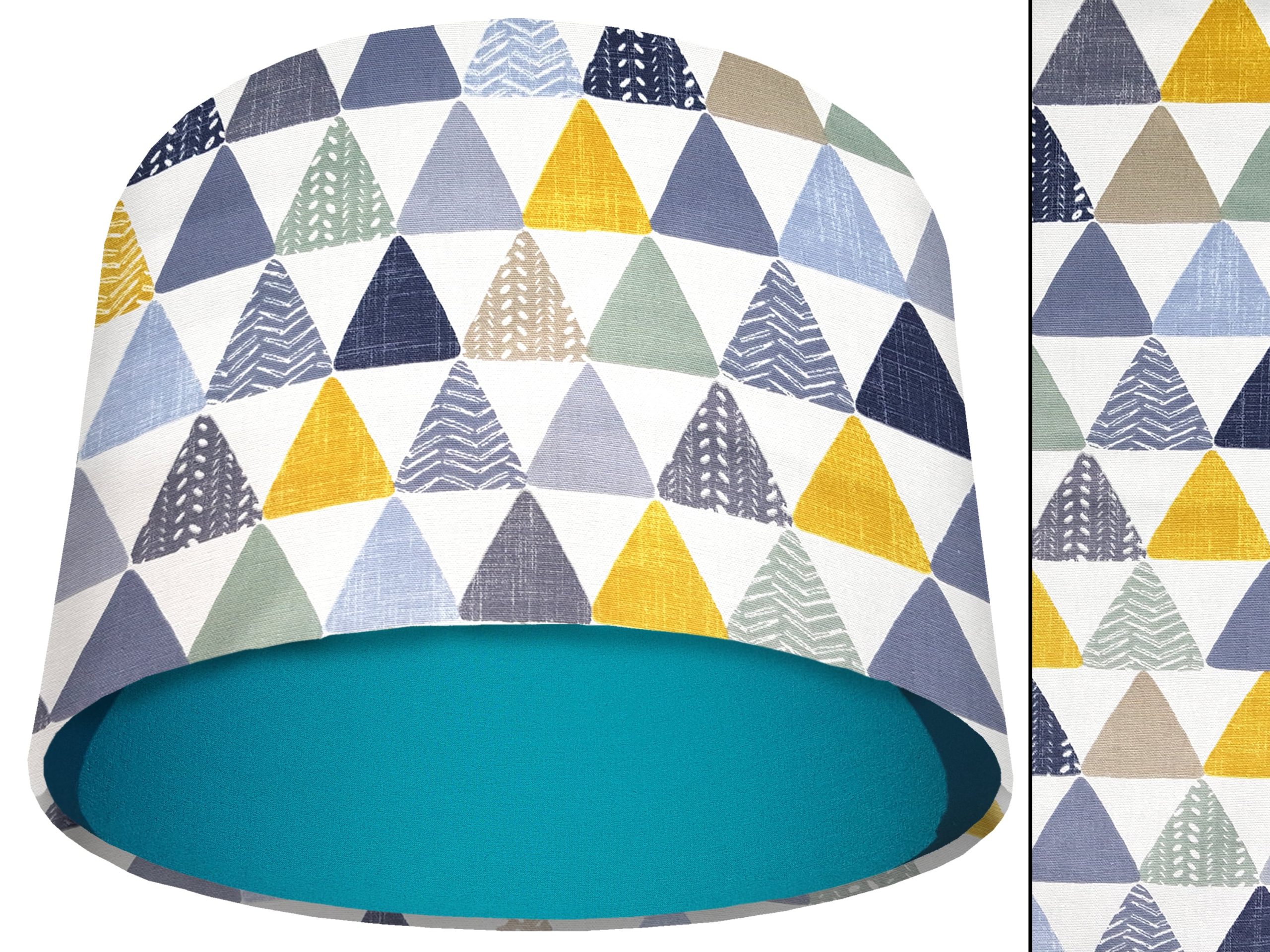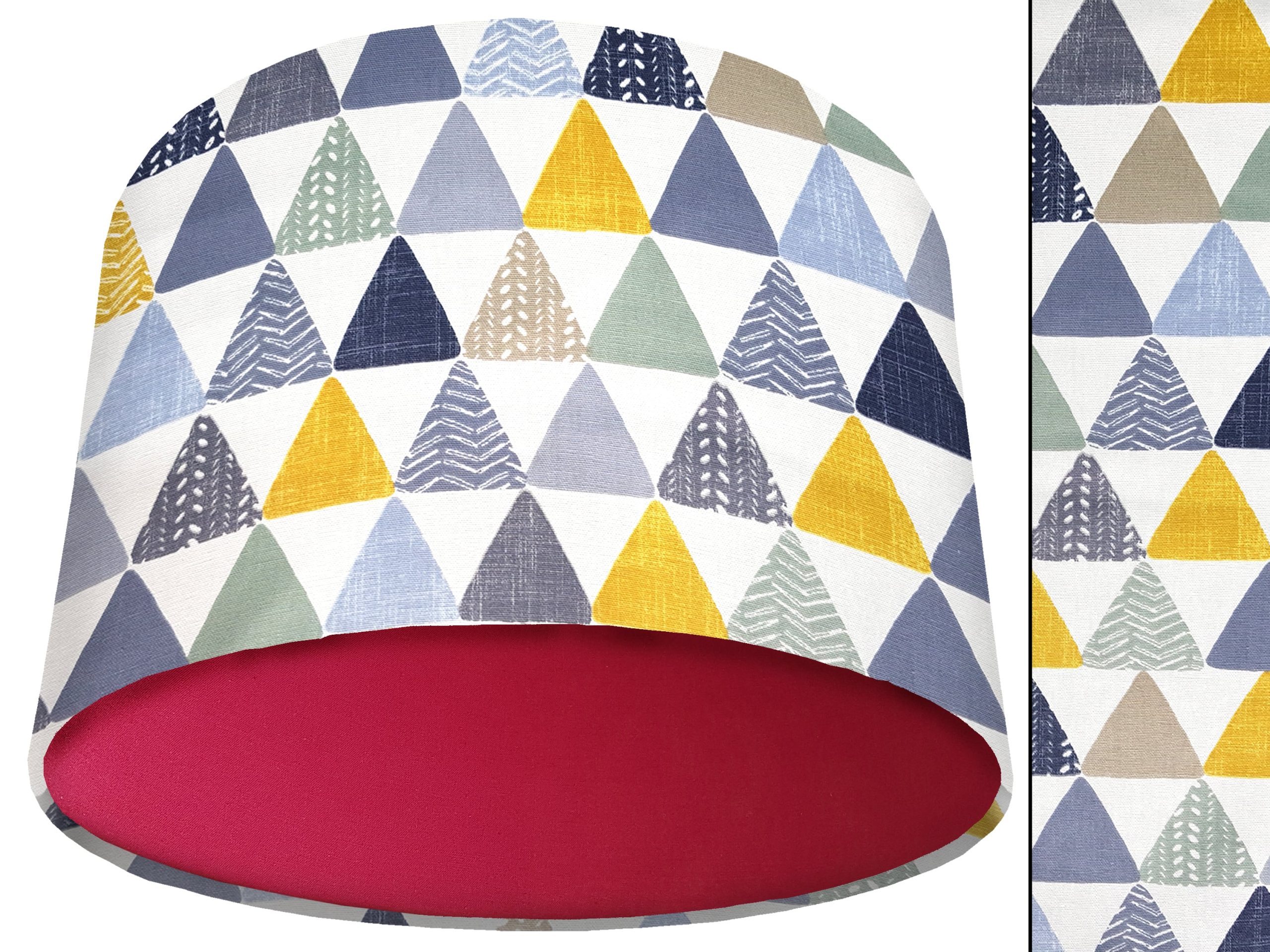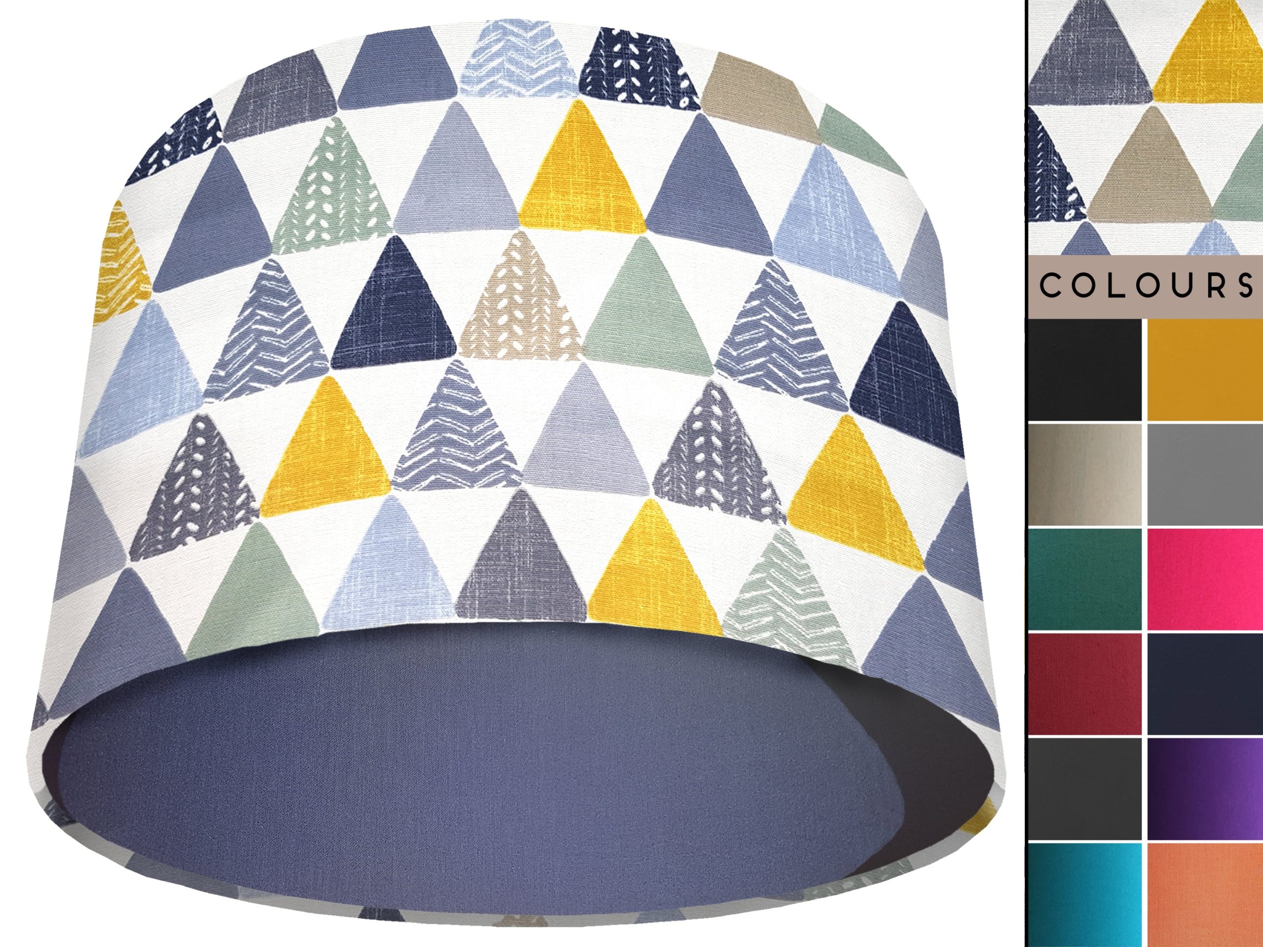 A beautiful modern geometric print make this geometric patterned light shade a stunning addition to your modern home interior. Our light shades feature a patterned exterior of colourful triangles, in a myriad of different colours & patterns. This can be paired with a solid cotton colour lining of your choosing, ensuring this triangles patterned light shade will add a contemporary pop of colour into any room.