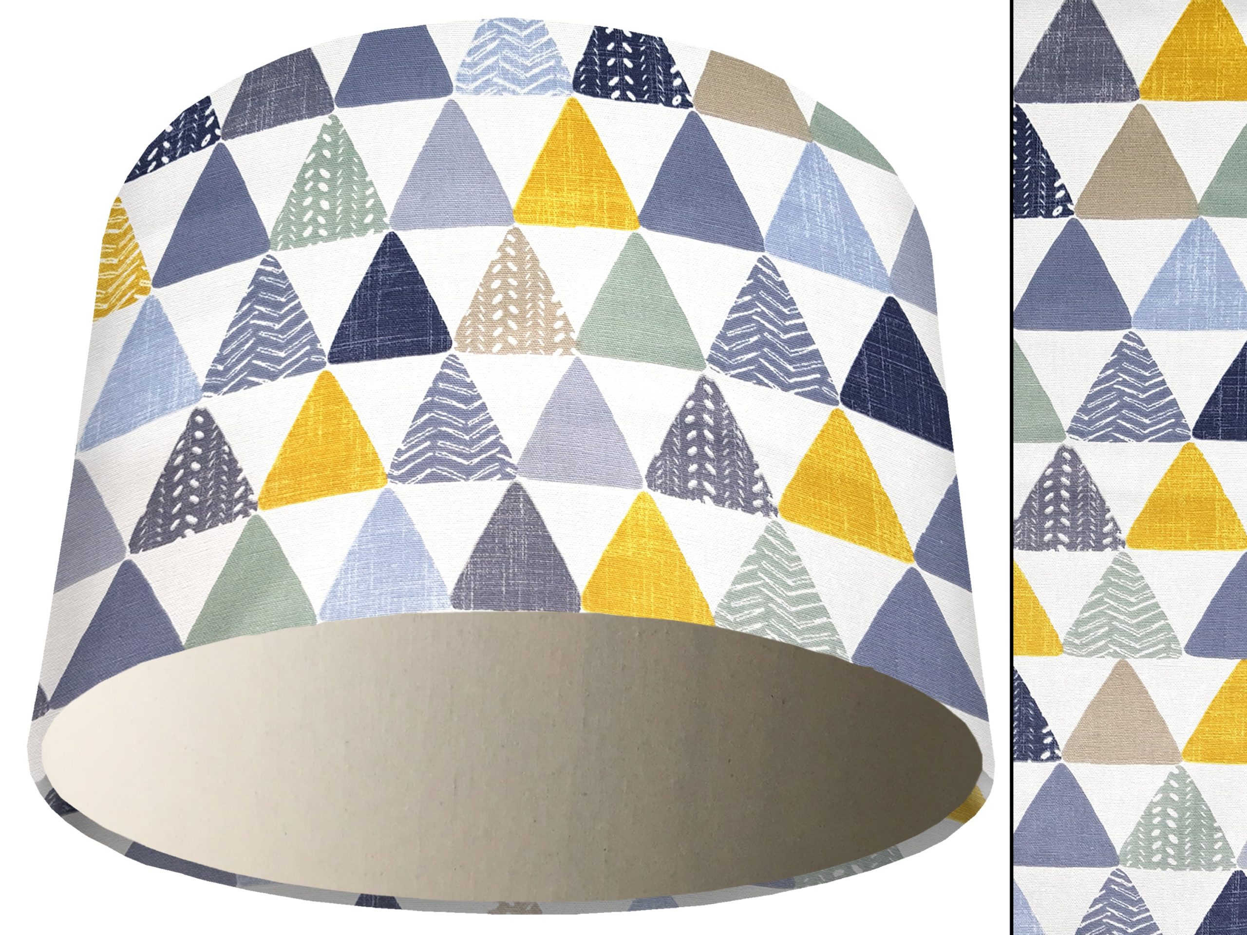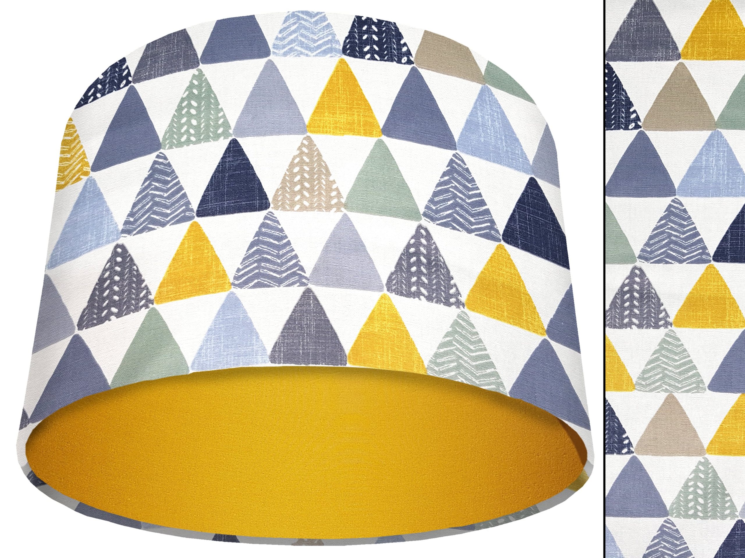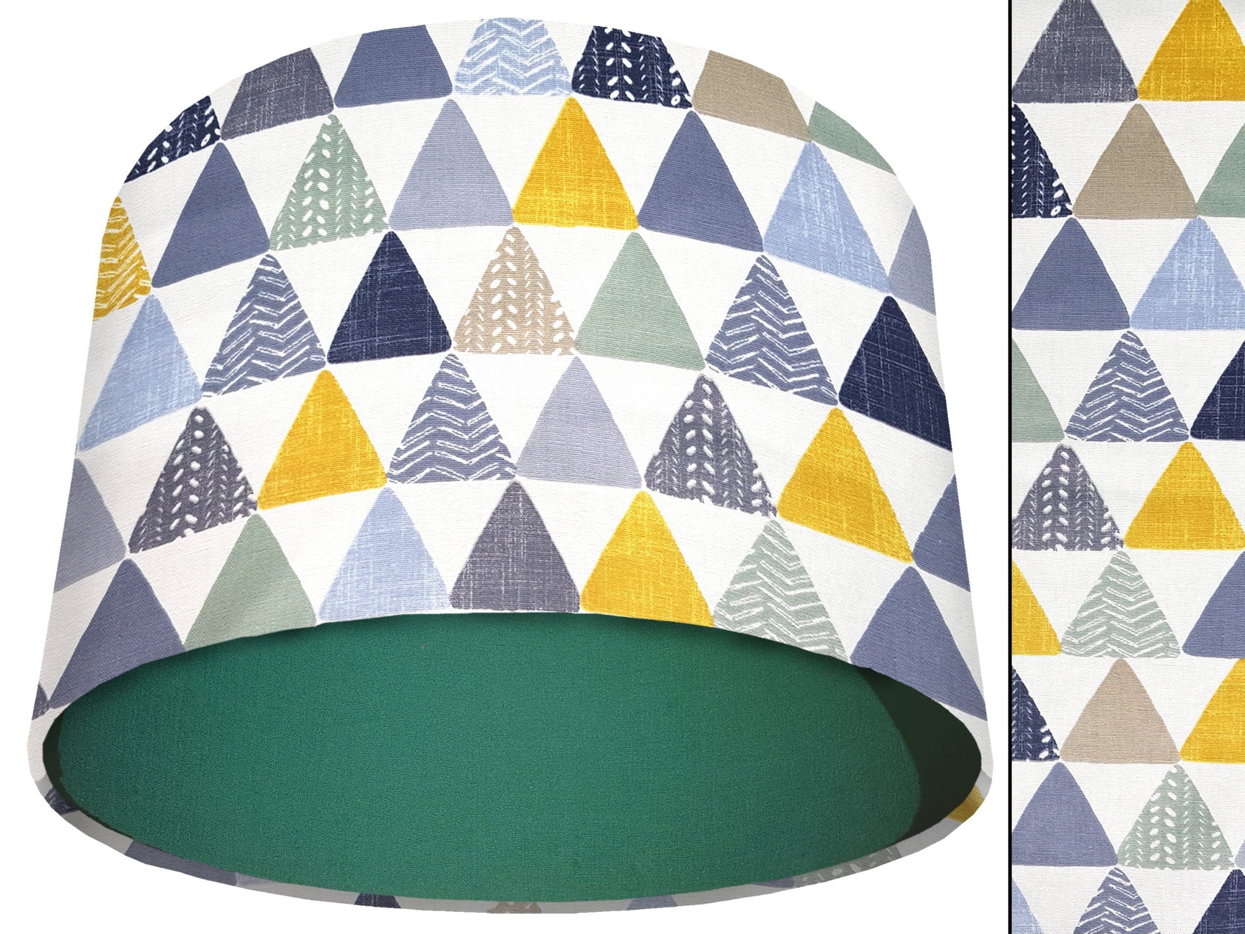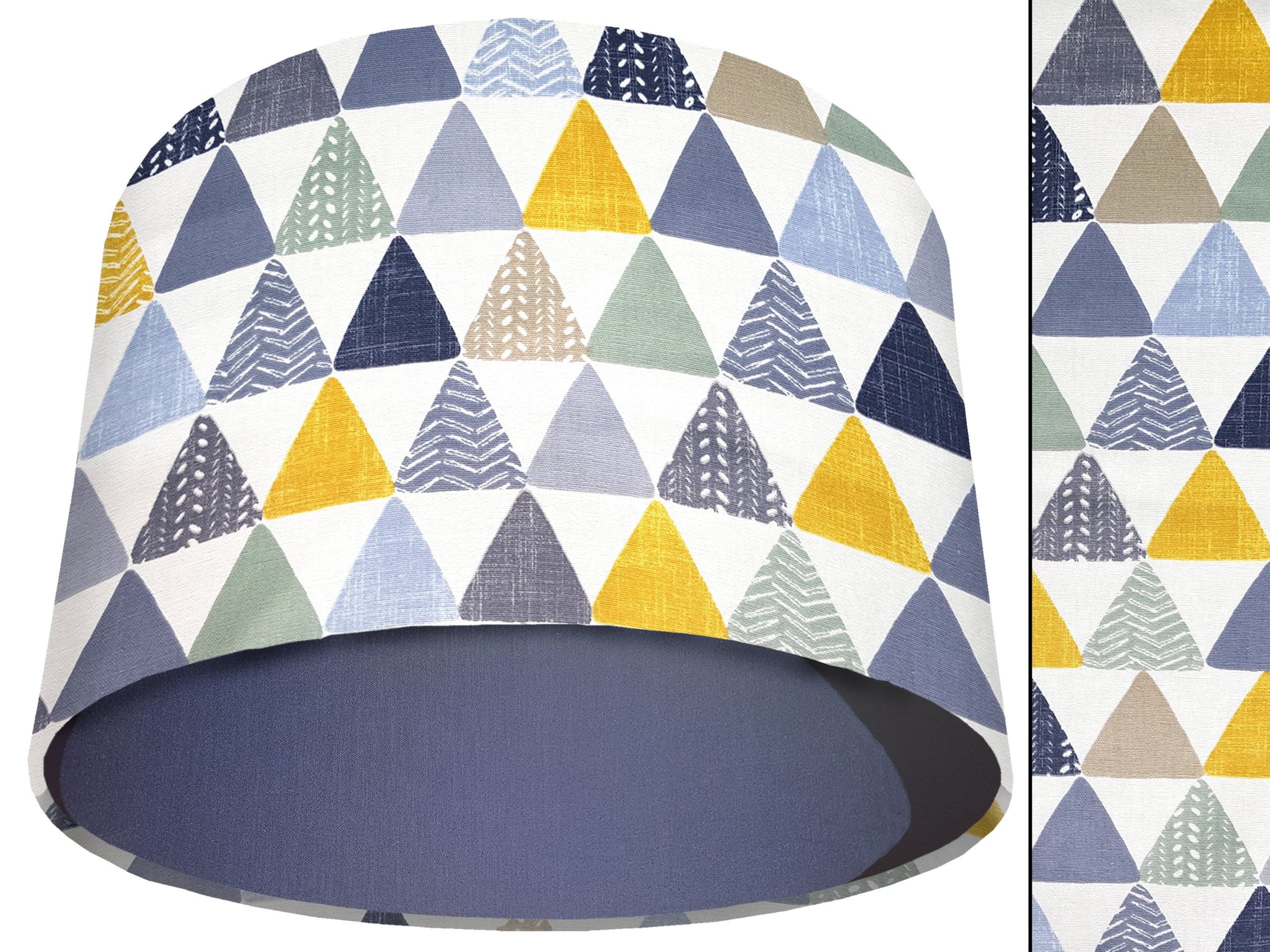A beautiful modern geometric print make this geometric patterned light shade a stunning addition to your modern home interior. Our light shades feature a patterned exterior of colourful triangles, in a myriad of different colours & patterns. This can be paired with a solid cotton colour lining of your choosing, ensuring this triangles patterned light shade will add a contemporary pop of colour into any room.