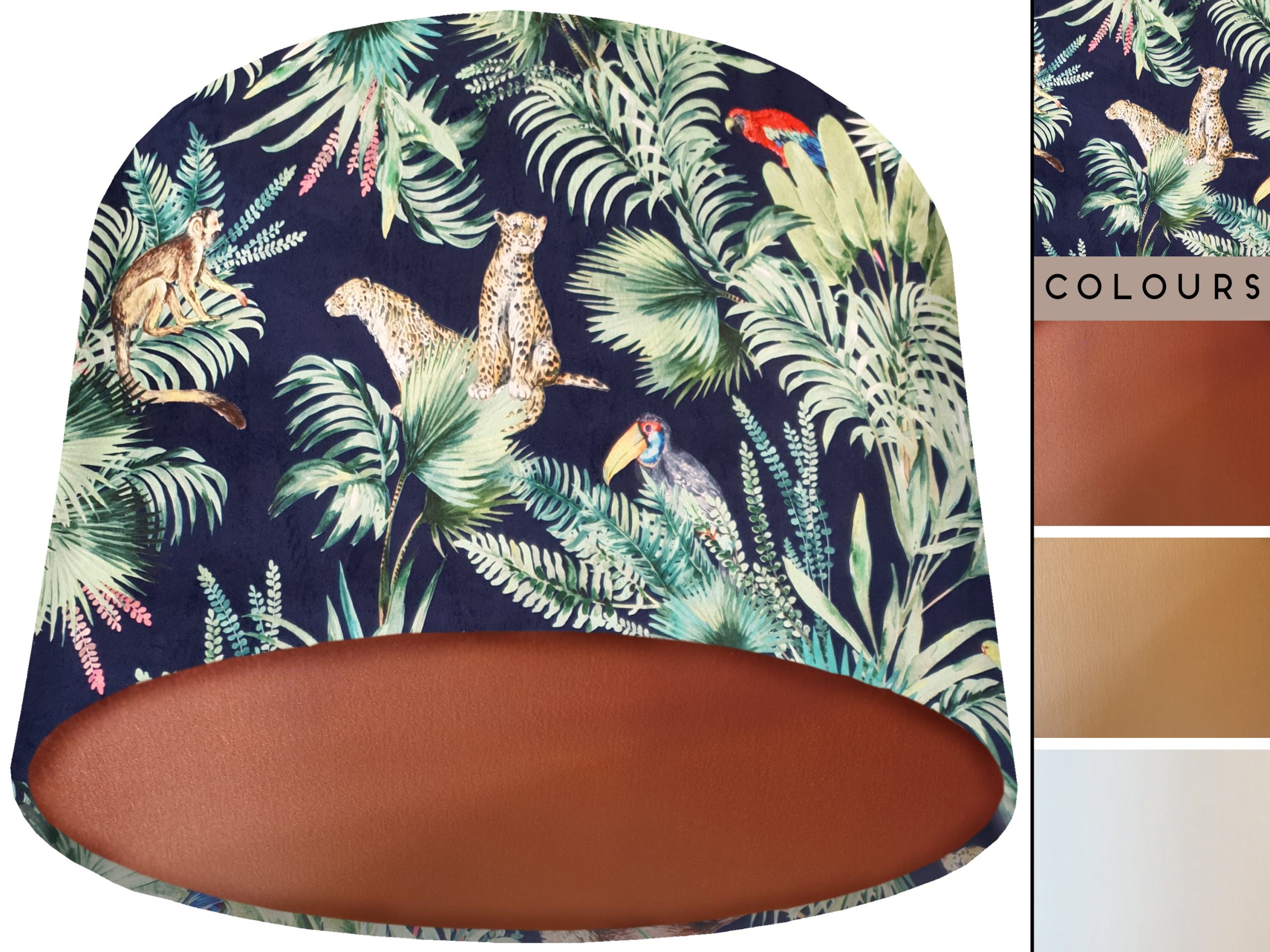 Our jungle blue velvet lampshade combines a plush patterned velvet exterior with a satin shimmer copper or gold lining, great for adding copper or gold accents into your home décor. The pattern features cheetahs, storks, and monkeys along with many other animals on a luscious green leaf jungle, all on a rich midnight blue background. Perfect as a bold ceiling light shade or table lamp shade in your home.