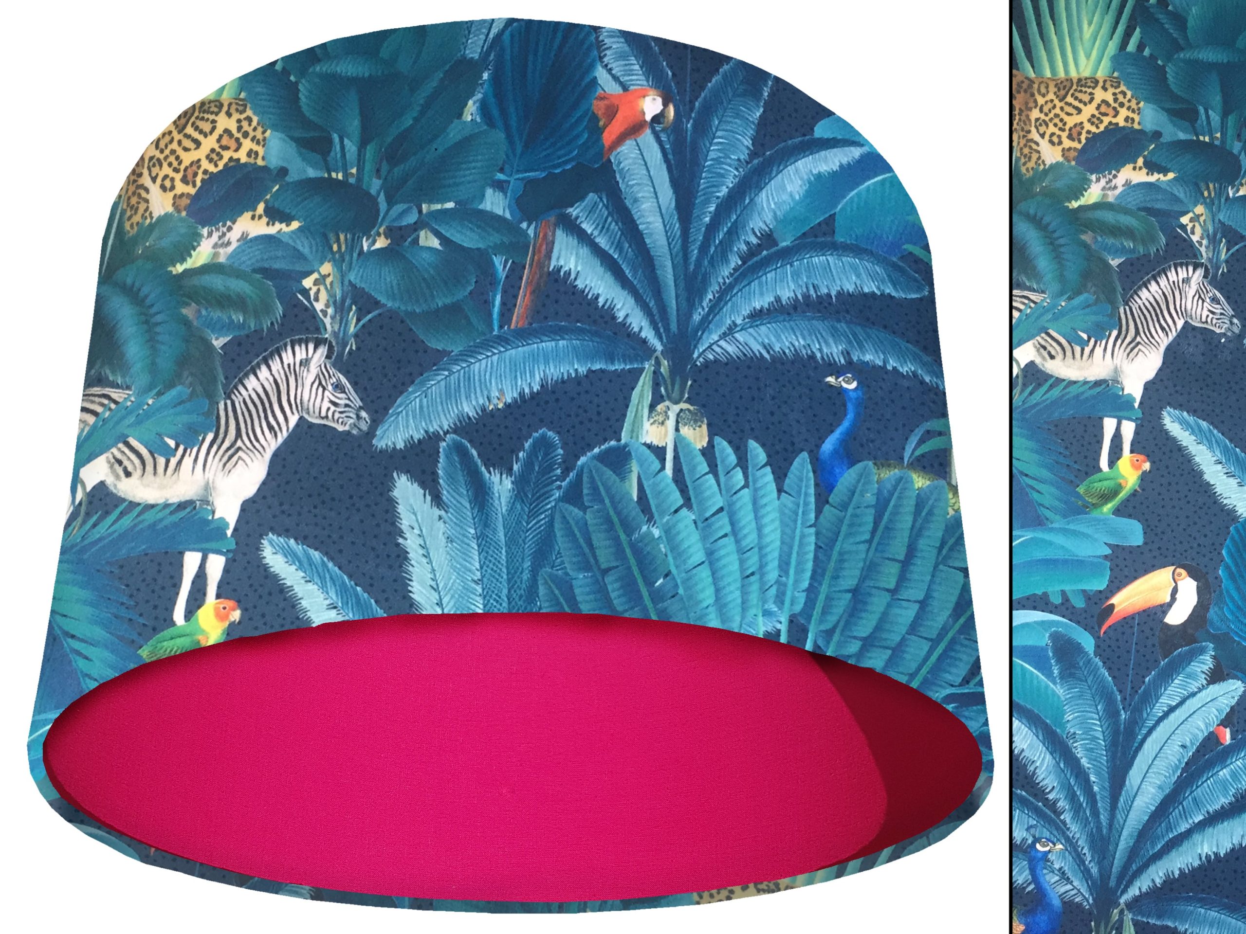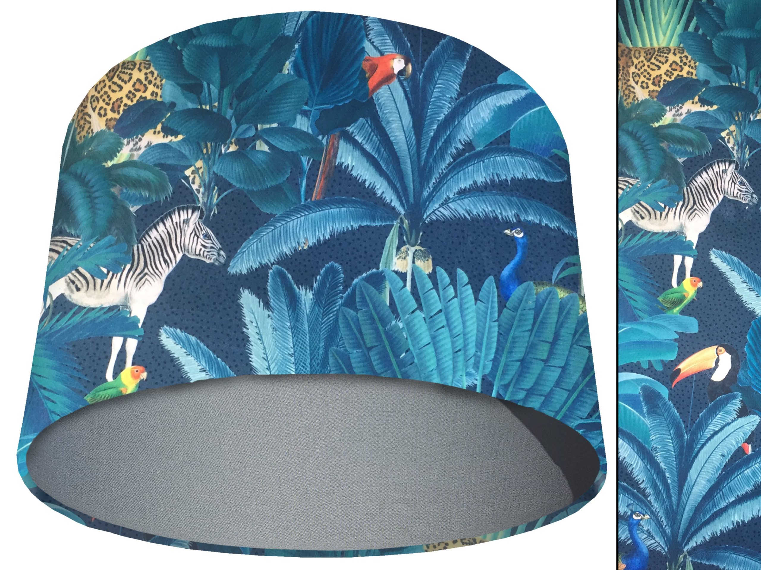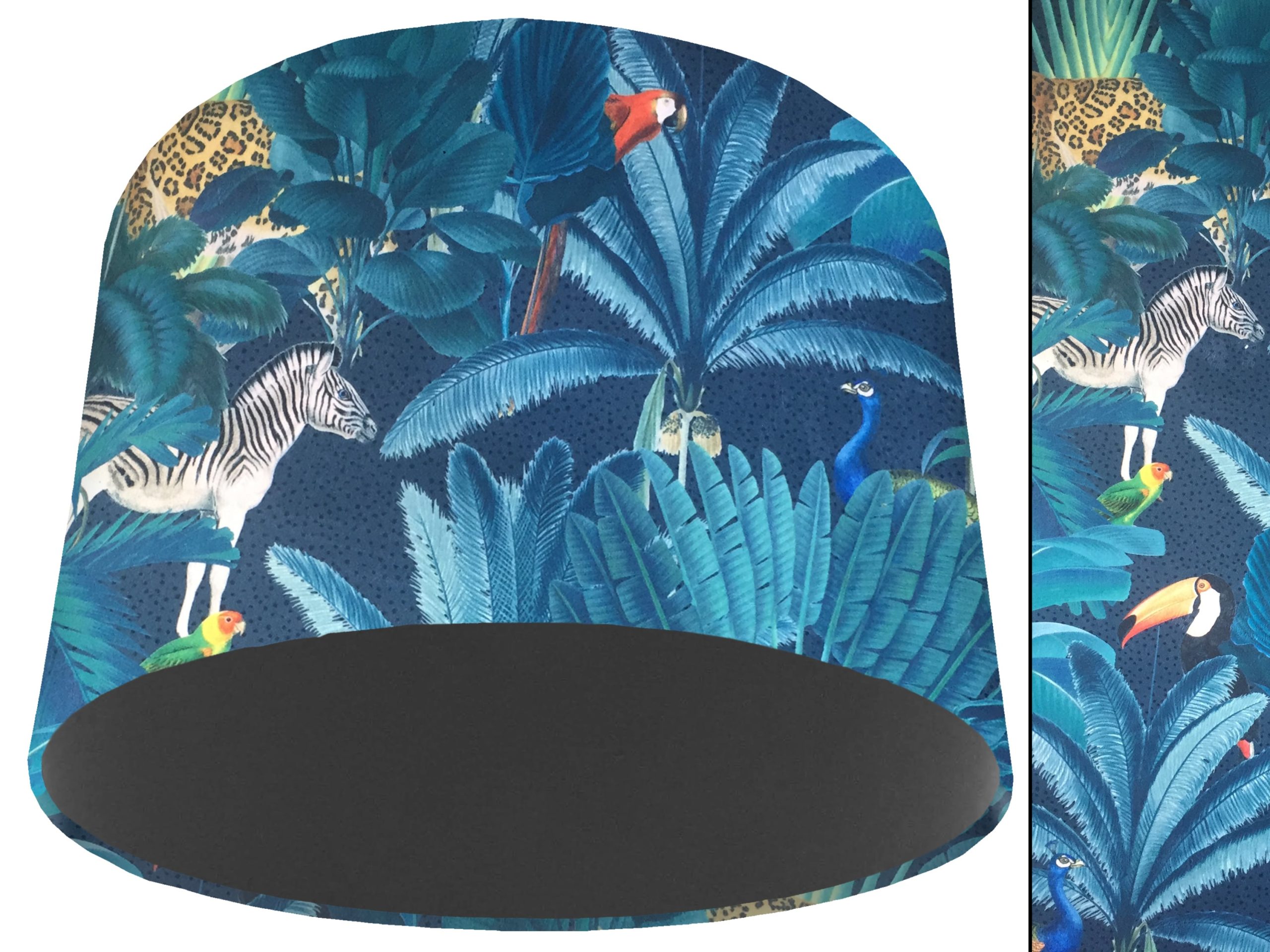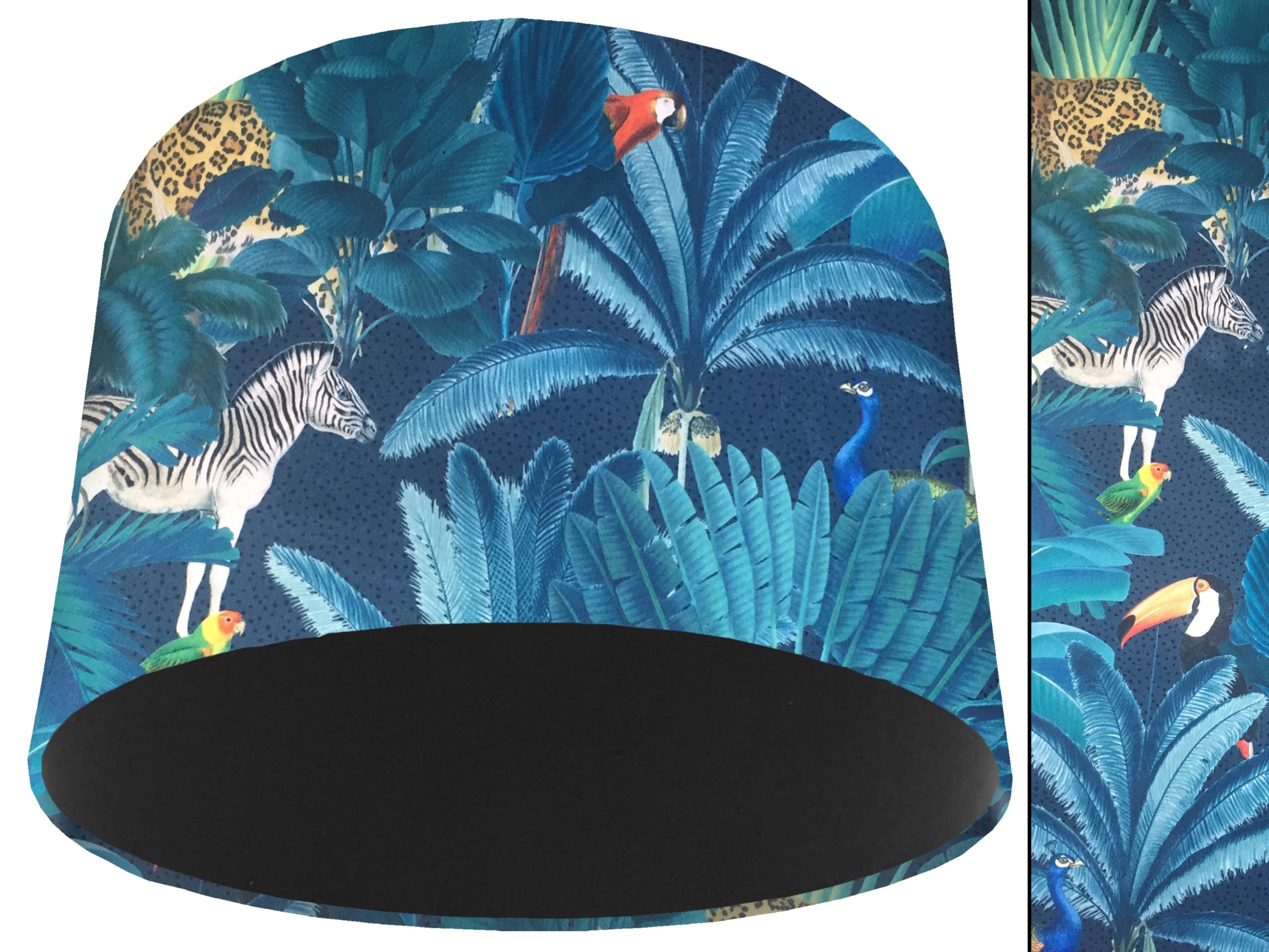 A stunning exotic leaf & animal print makes this jungle dark velvet light shade a colourful addition to your tropical home interiors. Our light shades feature an eye-catching patterned plush velvet exterior of teal green leaves with vibrant animals including parrots, toucans, & zebras on a dark blue spotty background. This can be paired with solid cotton colour lining of your choosing to ensure this jungle dark velvet light shade will create a bold statement in any room.