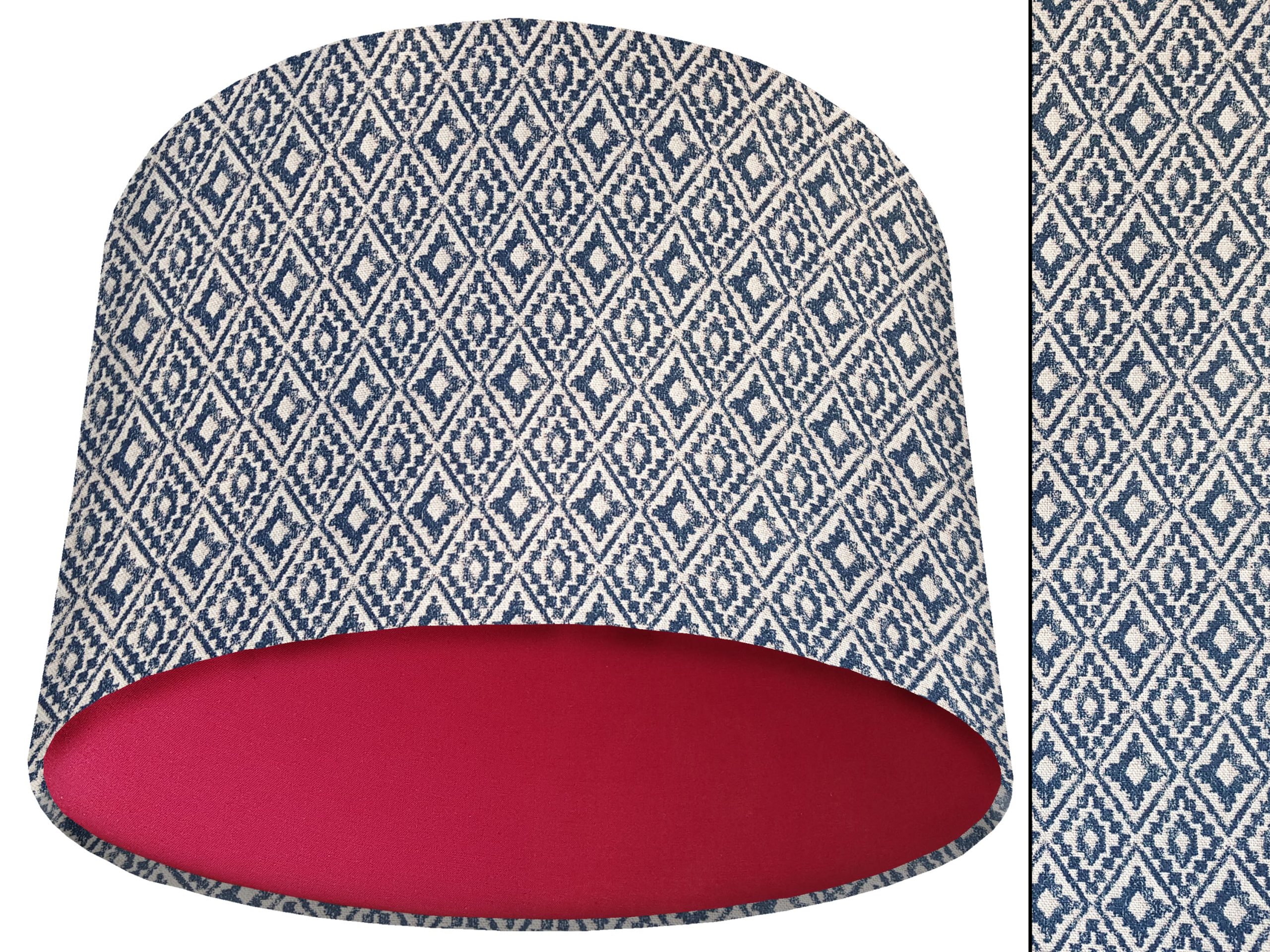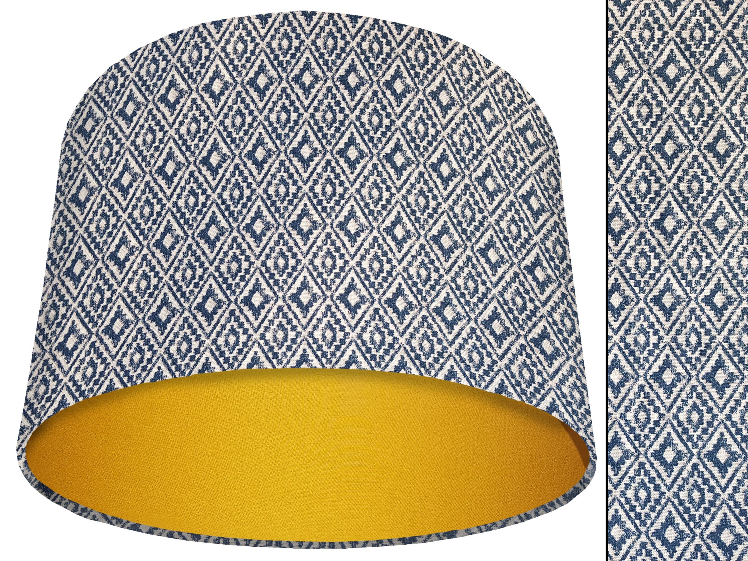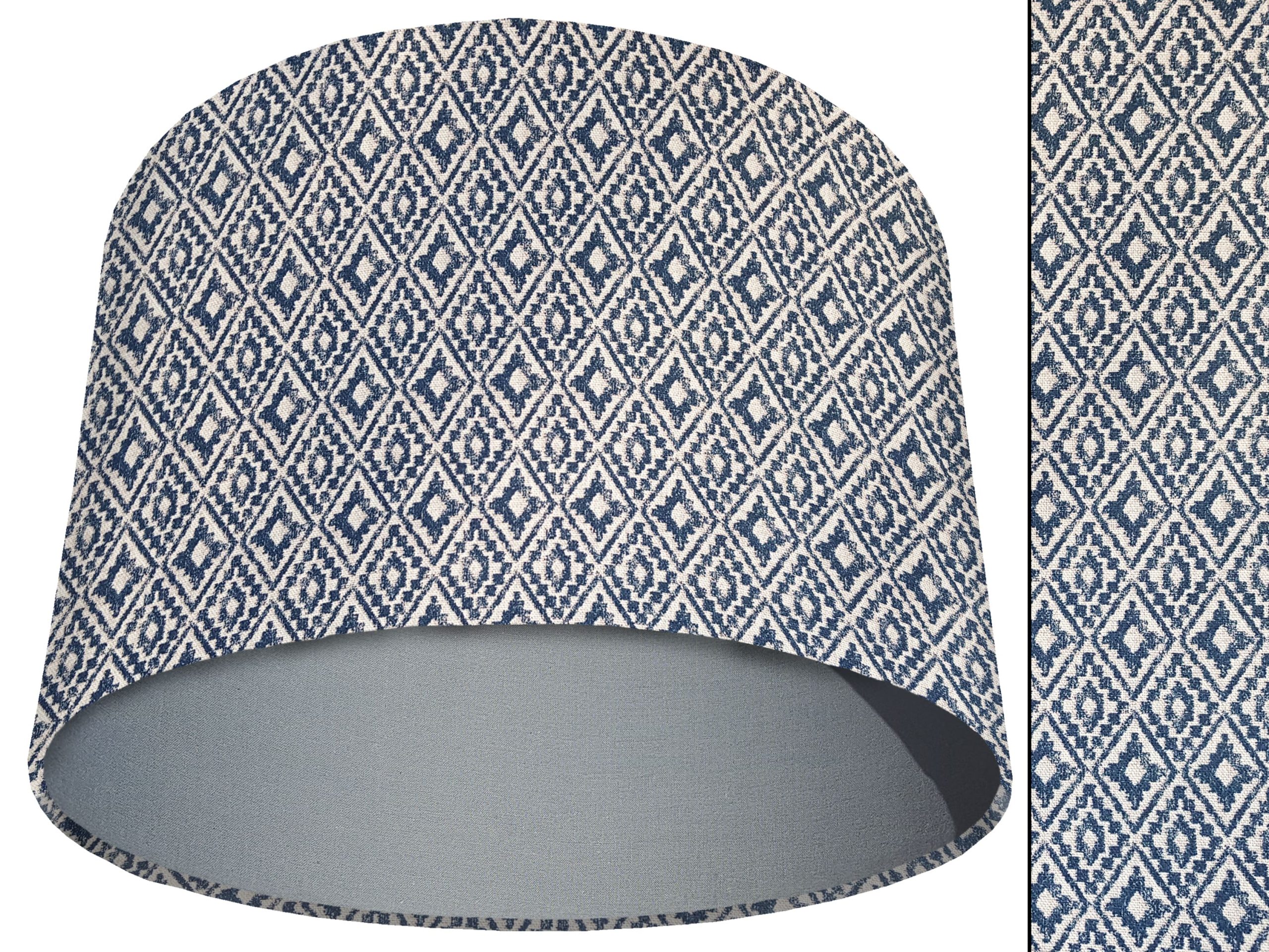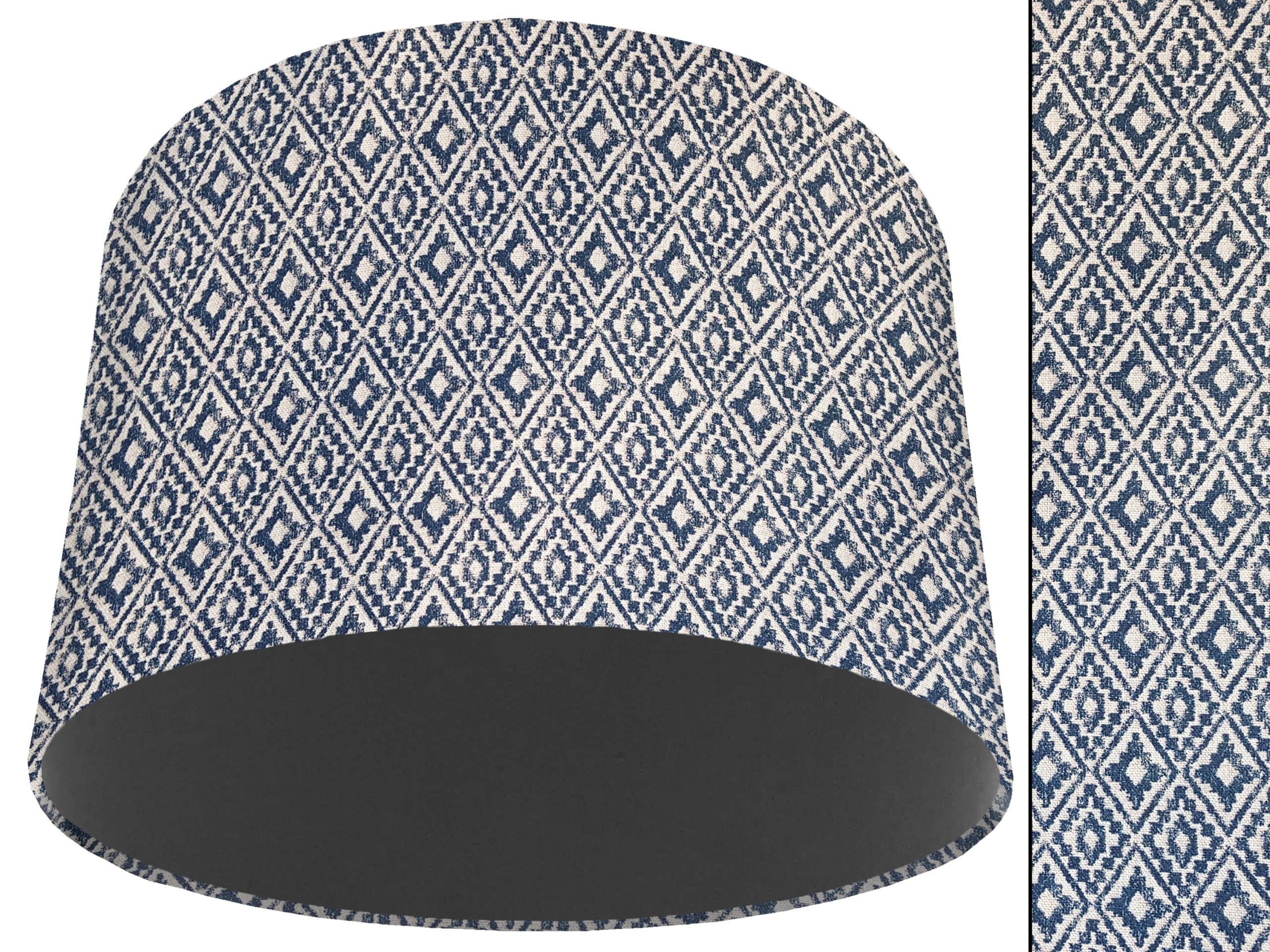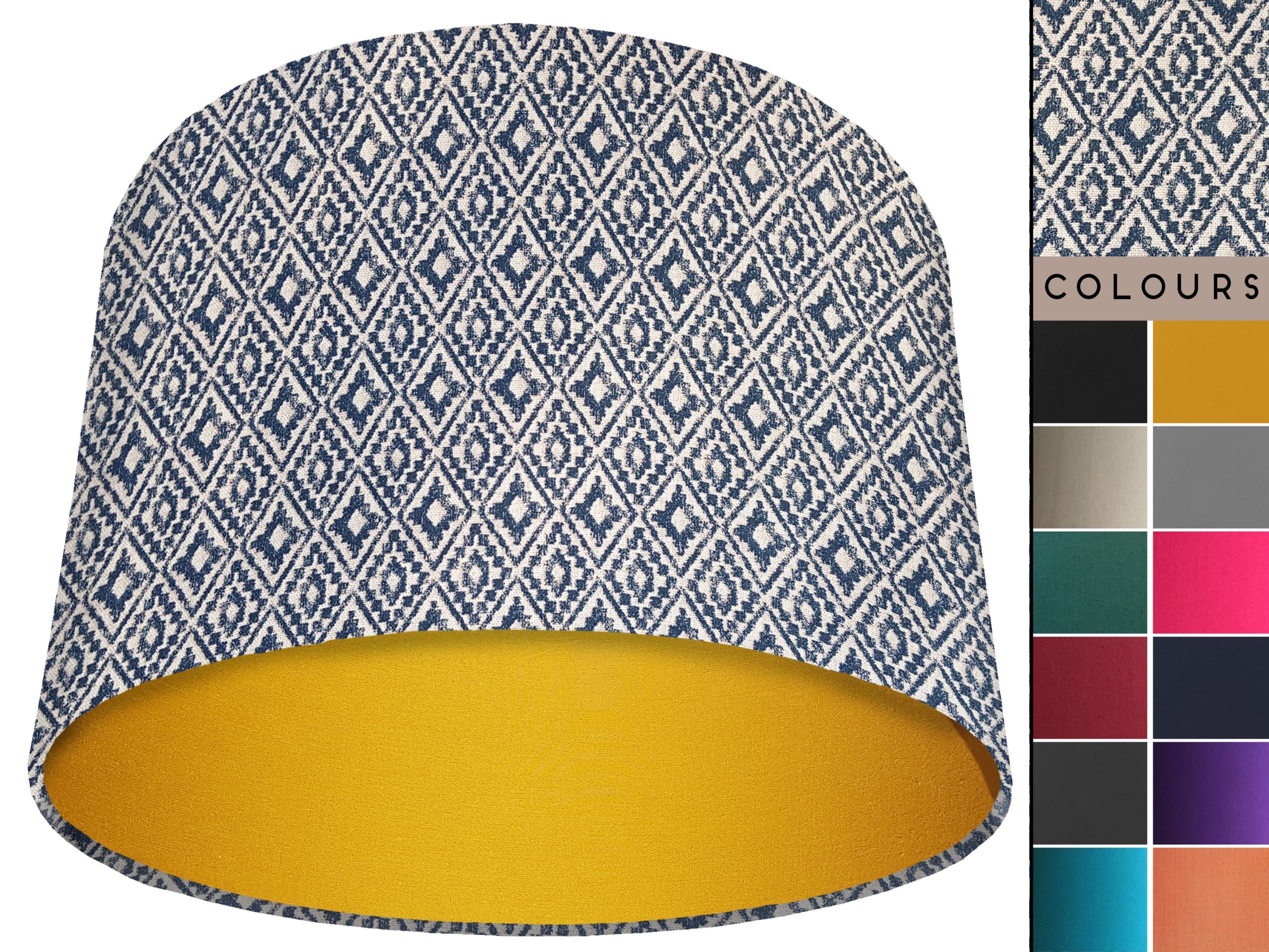 A contemporary Native American inspired design makes this Navajo blue light shade a stunning addition to your modern home interiors. Our light shades feature a gorgeous patterned exterior of alternating rows of stylised diamonds in contrasting dark blue & white colours. This can be paired with solid cotton colour lining of your choosing, ensuring this Navajo blue light shade will add an extra splash of colour and style into your home.