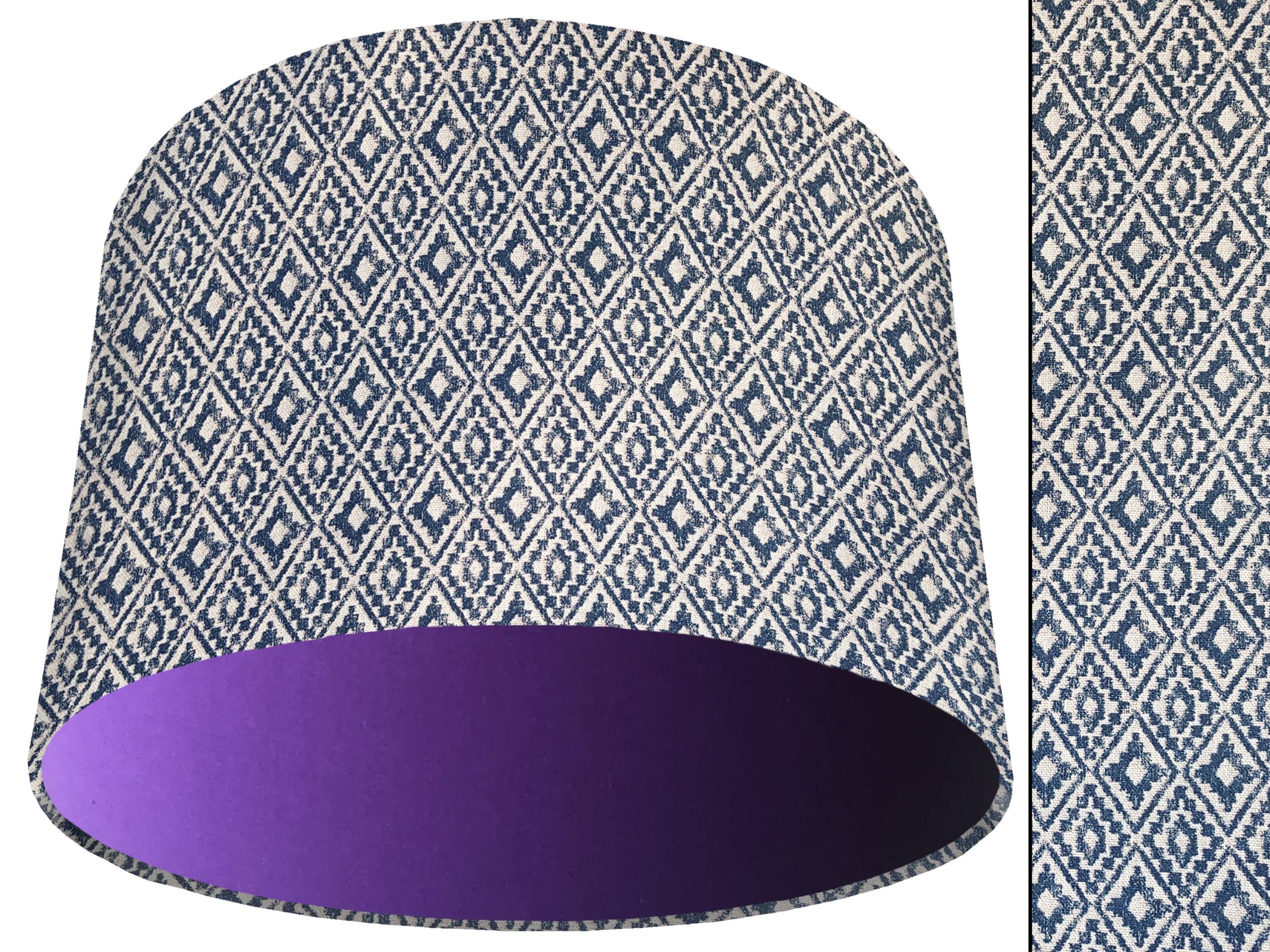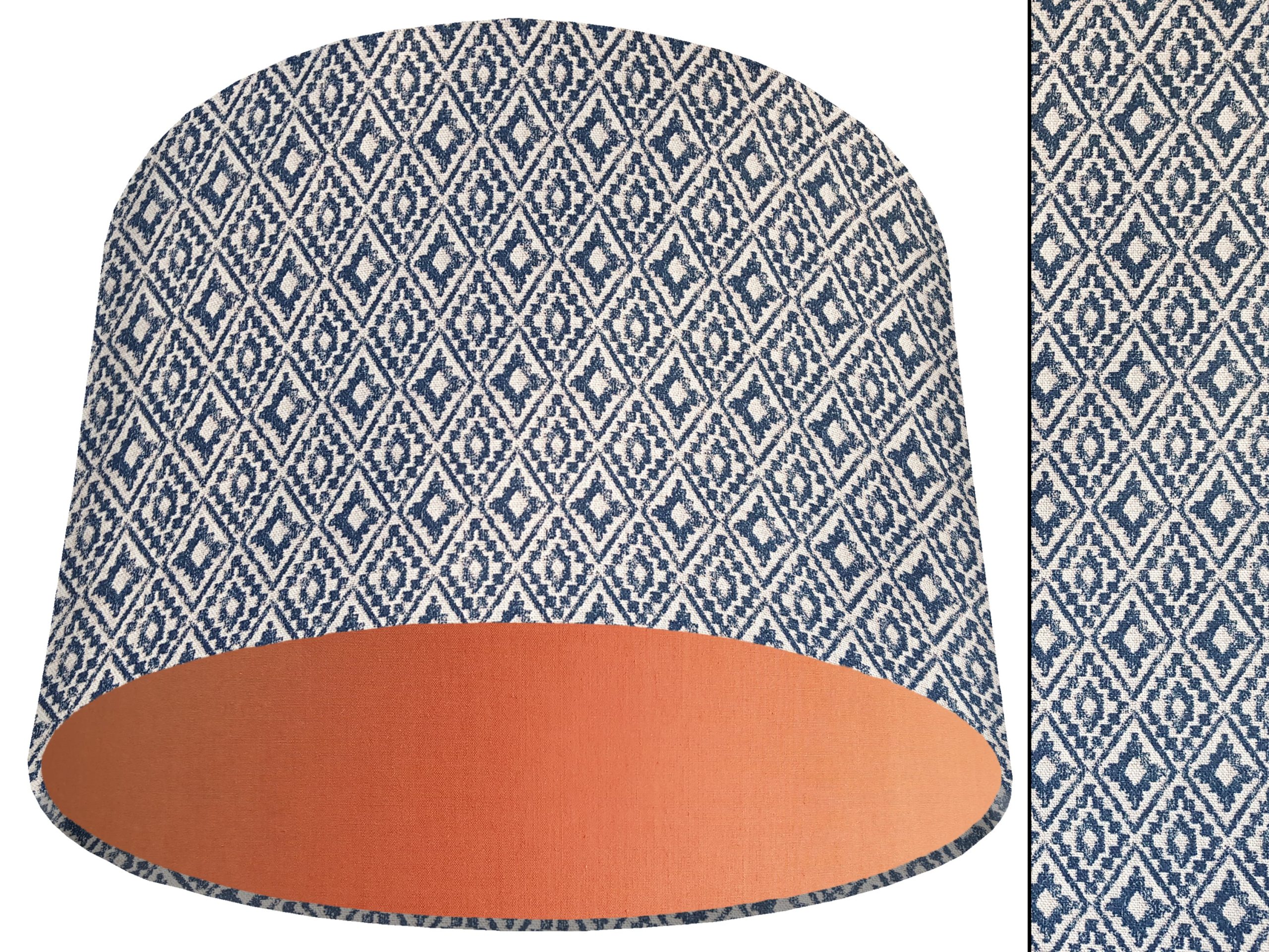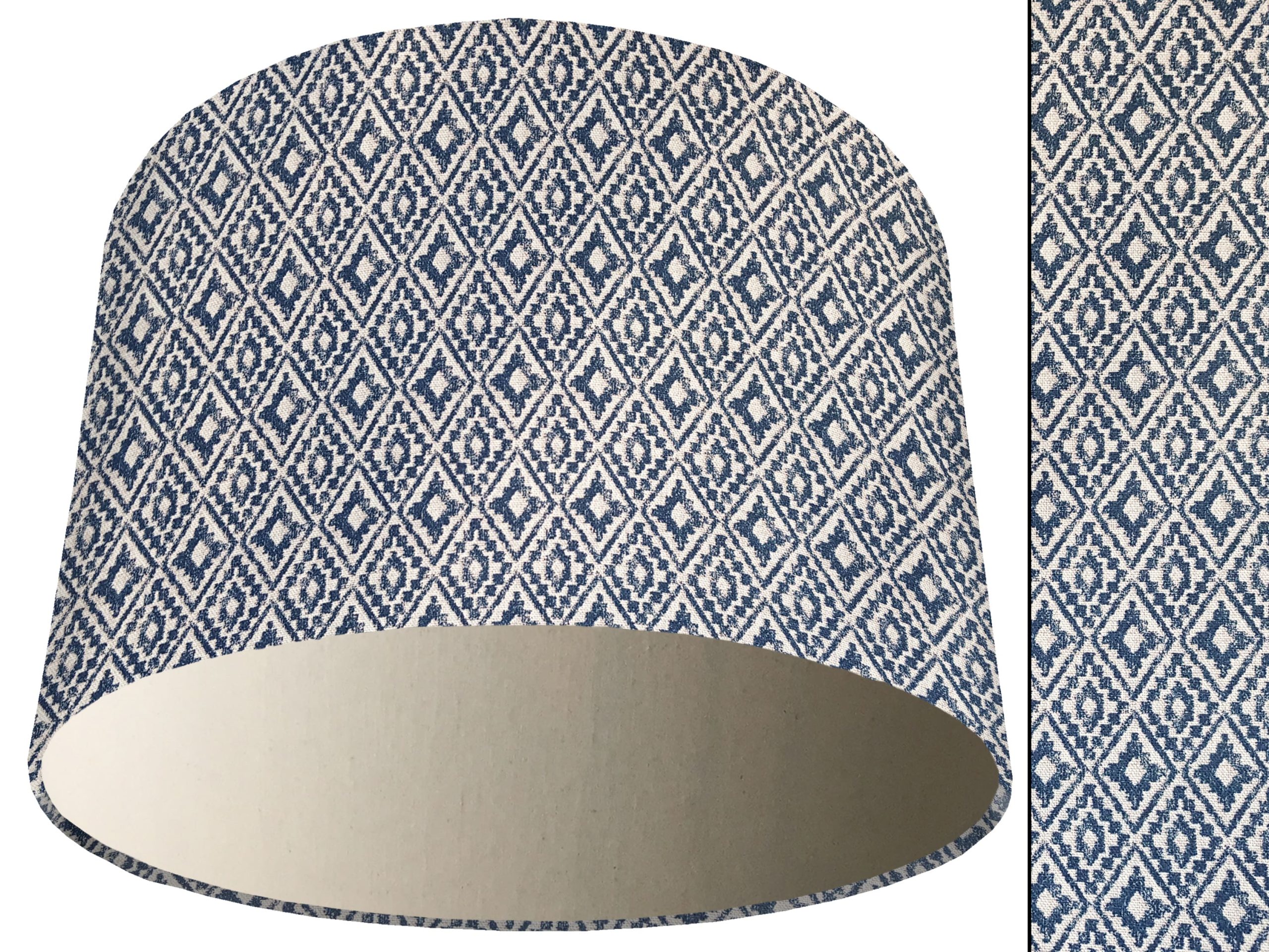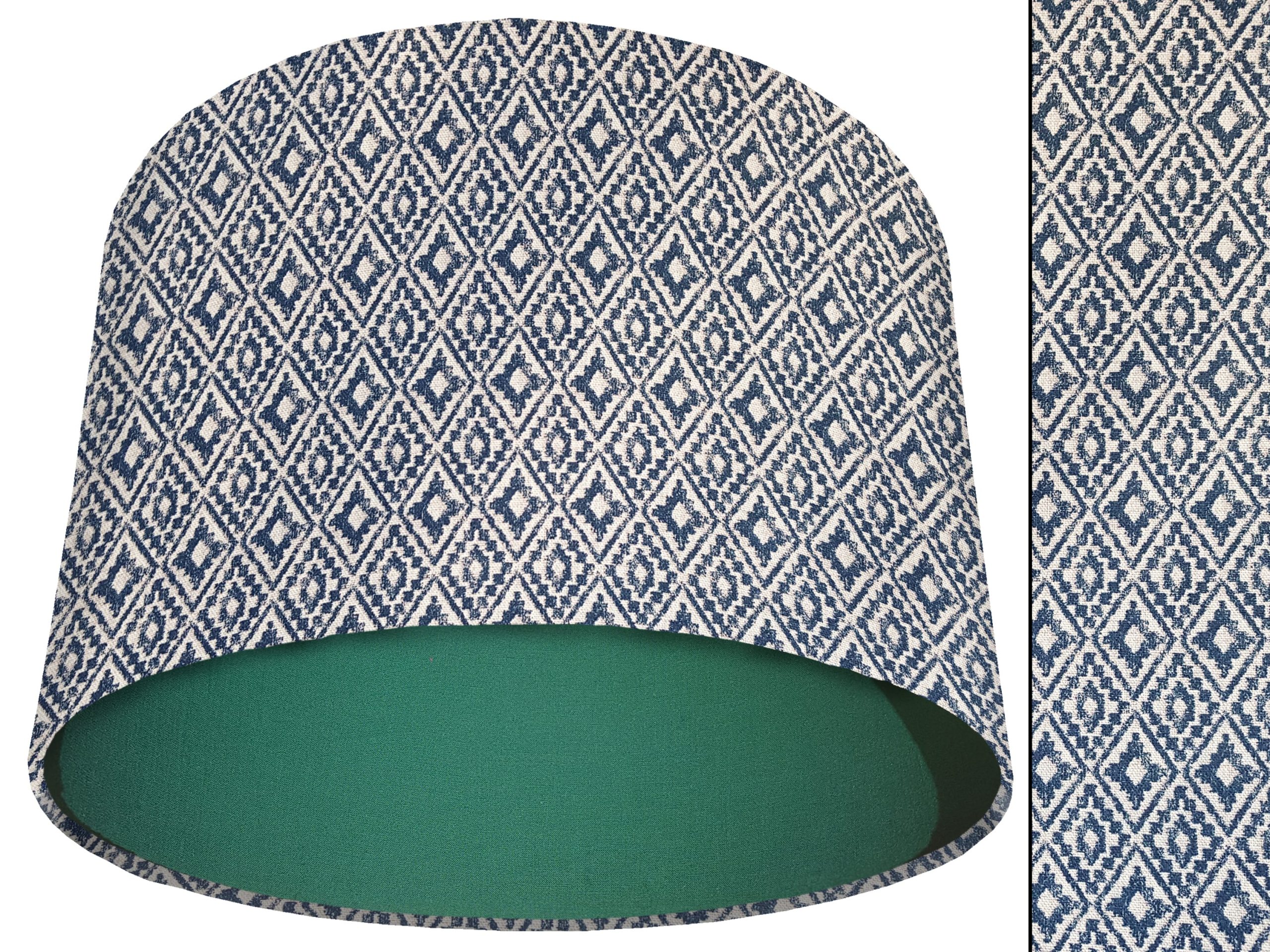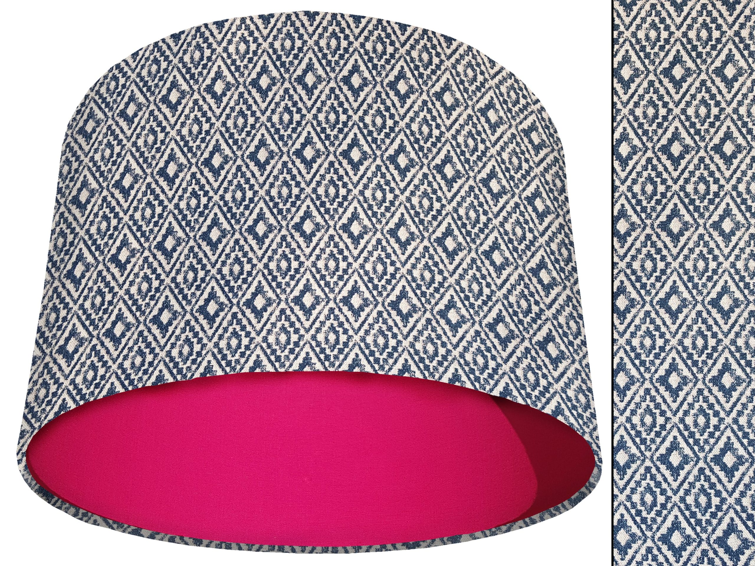 A contemporary Native American inspired design makes this Navajo blue light shade a stunning addition to your modern home interiors. Our light shades feature a gorgeous patterned exterior of alternating rows of stylised diamonds in contrasting dark blue & white colours. This can be paired with solid cotton colour lining of your choosing, ensuring this Navajo blue light shade will add an extra splash of colour and style into your home.